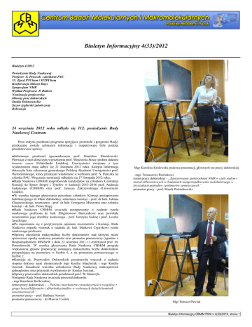 Biuletyn Informacyjny 4(33)/2012 Biuletyn 4/2012 Posiedzenie Rady Naukowej Profesor S. Penczek członkiem PAU 55. Zjazd PTChem i SITPChem Konferencja Silicon Days Sympozjum NMR Wykład Profesora P. Dubois Nominacja profesorska Obrony prac doktorskich Studia Doktoranckie Sezon żeglarski zakończony Rekreacja 24 września 2012 roku odbyło się 112. posiedzenie Rady Naukowej Centrum Poza stałymi punktami programu (przyjęcie protokołu i programu Rady) przekazane zostały zebranym informacje i rozpatrywane były poniżej przedstawione sprawy. ●Informacje przekazał zgromadzonym prof. Stanisław Słomkowski. Pierwsza z nich dotyczyła wyróżnienia prof. Wojciecha Steca tytułem doktora honoris causa Politechniki Łódzkiej. Uroczystości związane z tym wydarzeniem mają odbyć się 21 listopada 2012 roku. Kolejna informacja dotyczyła listu sekretarza generalnego Polskiej Akademii Umiejętności prof. Wyrozumskiego, który przekazał wiadomość o wybraniu prof. S. Penczka na członka PAU. Wręczenie nominacji odbędzie się 17 listopada 2012 roku. ●Rada Naukowa CBMiM zaaprobowała kandydatów na członków Centralnej Komisji do Spraw Stopni i Tytułów w kadencji 2013-2016 prof. Andrzeja Gałęskiego (CBMiM) oraz prof. Janusza Zakrzewskiego (Uniwersytet Łódzki). ●W wyniku tajnego głosowania powołano członków Komisji postępowania habilitacyjnego dr Marii Zabłockiej: sekretarza komisji - prof. dr hab. Juliana Chojnowskiego, recenzenta - prof. dr hab. Grzegorza Mlostonia oraz członka komisji - dr. hab. Piotra Gugę. ●Rada Naukowa CBMiM wszczęła postępowanie o nadanie tytułu naukowego profesora dr. hab. Zbigniewowi Bartczakowi oraz powołała recenzentów jego dorobku naukowego - prof. Henryka Galinę i prof. Leszka Jareckiego. ●Po zapoznaniu się z pozytywnymi opiniami recenzentów i Komisji, Rada Naukowa poparła wniosek o nadanie dr. hab. Markowi Cyprykowi tytułu naukowego profesora. ●Sprawę określenia maksymalnej liczby doktorantów nad którymi może sprawować opiekę naukową promotor oraz promotor pomocniczy (zgodnie z Rozporządzeniem MNiSzW z dnia 22 września 2011 r.) zreferował prof. M. Potrzebowski. W wyniku głosowania Rada Naukowa CBMiM przyjęła większością głosów propozycję ustalającą maksymalną liczbę doktorantów przypadającą na promotora w liczbie 6, a na promotora pomocniczego w liczbie 2. ●Komisja ds. Przewodów Doktorskich przedstawiła wniosek o nadanie stopnia doktora nauk chemicznych mgr Kindze Majchrzak i mgr Kindze Jurczuk. Zasadność wniosku członkowie Rady Naukowej zaakceptowali jednogłośnie oraz przyznali wyróżnienie dr Kindze Jurczuk. ●Sprawy przewodów doktorskich przedstawił prof. W. Stańczyk. Następnie Rada Naukowa wszczęła przewód doktorski: - mgr Karolinie Królewskiej temat pracy doktorskiej - „Poziom i mechanizm cytotoksyczności związków z grupy benzo[b]furanów i dikarboksyimidów w wybranych liniach komórek nowotworowych” promotor pracy - prof. Barbara Nawrot promotor pomocniczy - dr Marcin Cieślak Mgr Karolina Królewska podczas prezentacji głównych tez pracy doktorskiej - mgr. Tomaszowi Pawlakowi temat pracy doktorskiej - „Zastosowanie spektroskopii NMR w ciele stałym i metod obliczeniowych w badaniach nieuporządkowania molekularnego w kryształach peptydów i polimerów syntetycznych” promotor pracy - prof. Marek Potrzebowski Mgr Tomasz Pawlak Biuletyn Informacyjny CBMiM PAN nr 4(33)/2012, strona 1 ●Powołano recenzentów pracy doktorskiej mgr Eweliny Drabik w osobach: prof. Witold Danikiewicz (IChO PAN) oraz dr hab. Jacek Gramsa (PŁ). W wyniku tajnego głosowania recenzentami pracy doktorskiej mgr inż. Aleksandry Pietkiewicz zostali: prof. Małgorzata Czyż (UM w Łodzi) i prof. Andrzej Okruszek (PŁ). Rada Centrum zaakceptowała recenzentów pracy doktorskiej mgr Doroty Szczęsnej: prof. Grzegorza Mlostonia (UŁ) oraz prof. Pawła Kafarskiego (PW). Powołano również recenzentów pracy doktorskiej mgr Marty Sockiej: prof. Henryka Galinę (PRz) i prof. Gabriela Rokickiego (PW). ●Przewodniczący Rady prof. H. Kozłowski wraz z Dyrektorem prof. S. Słomkowskim uroczyście wręczyli dyplomy doktorskie dr Kindze Majchrzak i dr Kindze Jurczuk, które złożyły przed Radą uroczystą przysięgę. Gratulujemy dyplomów. Polska Akademia Umiejętności powstała po pierwszej wojnie światowej z Akademii Umiejętności (rok założenia 1872) będącej kontynuatorką Towarzystwa Naukowego Krakowskiego istniejącego od 1815 roku. Panie Doktor - Kinga Majchrzak i Kinga Jurczuk ●Kolejnym punktem posiedzenia Rady było złożenie ślubowania przez doktorantów przyjętych na Studia Doktoranckie CBMiM na rok akademicki 2012/2013. Ślubowanie złożyli: Anna Adamska (IBM PAN), Beata Łukasik (ZChH), Jarosław Marczyk (SPSP), Patrycja Pokora-Sobczak (ZChH) oraz Piotr Socha (ZFP). Po złożeniu ślubowania doktorantom zostały wręczone indeksy. Życzymy sukcesów naukowych. Gratulujemy Panu Profesorowi wyboru do tej szacownej instytucji gromadzącej najwybitniejszych uczonych polskich i zagranicznych. Jest to nie tylko uznanie Jego osobistych osiągnięć lecz również zaszczyt dla naszego Instytutu. Redakcja Biuletynu 55. Zjazd Polskiego Towarzystwa Chemicznego (PTChem) i Stowarzyszenia Inżynierów i Techników Przemysłu Chemicznego (SITPChem) Od lewej: mgr inż. Anna Adamska, mgr Patrycja Pokora-Sobczak, mgr Beata Łukasik, mgr inż. Jarosław Marczyk, mgr inż. Piotr Socha Na zakończenie posiedzenia Dyrektor CBMiM prof. Stanisław Słomkowski poinformował zebranych o śmierci dr. Marka Sochackiego i dr. Adama Kowalskiego. Oba te wydarzenia były nagłe i nieoczekiwane. Pamięć zmarłych uczczono minutą ciszy. Barbara Jeżyńska Profesor S. Penczek członkiem Polskiej Akademii Umiejętności Kolejny 55. Zjazd PTChem i SITPChem odbył się w dniach od 16 do 20 września 2012 w Białymstoku. Jego gospodarzem był Białostocki Oddział PTChem a jego obrady odbywały się w 