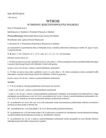 Sygn. akt II K 325/15 1 Ds 274/15 WYROK W IMIENIU RZECZYPOSPOLITEJ POLSKIEJ Dnia 27 listopada 2015 r. Sąd Rejonowy w Szubinie w Wydziale II Karnym w składzie: Przewodniczący: Sędzia Sądu Rejonowego Joanna Drozdalska Protokolant: sekr. sądowy Dorota Włodarczak w obecności W. J. Prokuratora Prokuratury Rejonowej w Szubinie po rozpoznaniu na posiedzeniu dnia 27 listopada 2015r. wniosku prokuratora złożonego w trybie art. 335 § 1 k.p.k. w sprawie karnej: T. R. (1) s. I. i M. z domu S., ur. (...) w S., zam. ul. (...), (...)-(...) Ł., nie karanego, któremu zarzuca się to, że: 1. W dniu 30 marca 2015 roku o godzinie 19:20 w Ł. przy ulicy (...) wbrew przepisom ustawy posiadał środki odurzające w postaci ziela konopi innych niż włókniste w ilości 0,86 grama, to jest o czyn z art. 62 ust. 1 ustawy o przeciwdziałaniu narkomanii 2. W dniu 31 marca 2015 roku o godzinie 11:00 w Ł. przy ulicy 3 - M. wbrew przepisom ustawy posiadał środki odurzające w postaci ziela konopi innych niż włókniste w ilości 6,43 grama, to jest o czyn z art. 62 ust. 1 ustawy o przeciwdziałaniu narkomanii orzeka: I. T. R. (1) uznaje za winnego popełnienia zarzucanych mu czynów: - w pkt 1 z art. 62 ust. 1 ustawy o przeciwdziałaniu narkomanii - w pkt 2 z art. 62 ust. 1 ustawy o przeciwdziałaniu narkomanii i ustalając, że przestępstw tych dopuścił się w ciągu przestępstw przewidzianym w art. 91 § 1 k.k.; na podstawie art. 62 ust. 1 ustawy o przeciwdziałaniu narkomanii w zw. z art. 91 § 1 k.k. skazuje go na karę 4 (czterech) miesięcy pozbawienia wolności; II. na podstawie art. 69 § 1 kk i art. 70 § 2 kk wykonanie wyżej orzeczonej kary pozbawienia wolności warunkowo zawiesza na okres próby 2/dwóch/ lat; III. na podstawie art. 73 § 2 kk oddaje T. R. (1) w okresie próby pod dozór kuratora; IV. na podstawie art. 71 § 1 kk orzeka wobec T. R. (1) grzywnę w wysokości 20 /dwudziestu/ stawek dziennych ustalając wysokość jednej stawki dziennej na kwotę 20 /dwudziestu/ złotych; V. na podstawie art. 70 ust. 2 ustawy o przeciwdziałaniu narkomanii orzeka przepadek na rzecz Skarbu Państwa zabezpieczonych dowodów rzeczowych w postaci: - woreczka strunowego z zawartością suszu roślinnego o wadze 0,73 grama, - woreczka strunowego z zawartością suszu roślinnego o wadze 0,45 grama, - woreczka strunowego z zawartością suszu roślinnego o wadze 0,58 grama, - woreczka strunowego z zawartością suszu roślinnego o wadze 0,68 grama, - woreczka strunowego z zawartością suszu roślinnego o wadze 0,55 grama, - woreczka strunowego z zawartością suszu roślinnego o wadze 0,58 grama, - woreczka strunowego z zawartością suszu roślinnego o wadze 0,62 grama, - woreczka strunowego z zawartością suszu roślinnego o wadze 0,45 grama, - woreczka strunowego z zawartością suszu roślinnego o wadze 0,45 grama, - woreczka strunowego z zawartością suszu roślinnego o wadze 0,59 grama, VI. na podstawie art. 44 § 2 kk orzeka przepadek na rzecz Skarbu Państwa: - 15 sztuk woreczków strunowych o wymiarach 9,8 cm x 6,2 cm oraz 15 sztuk woreczków strunowych o wymiarach 8,0 c, x 4,1 cm, - 6 woreczków strunowych różnej wielkości, - lufki szklanej, - wagi elektronicznej koloru szarego, - woreczka strunowego z zawartością 16 sztuk nasion; VII. na podstawie art. 63 § 1 kk na poczet orzeczonej grzywny zalicza okres zatrzymania T. R. (2) w okresie od godz. 19.30. dnia 30.03.2015r. do godz. 12.50. dnia 31.03.2015r. przyjmując, że jeden dzień pozbawienia wolności jest równym dwóm dziennym stawkom grzywny; VIII. obciąża oskarżonego T. R. (1) opłatą w wysokości 120 złotych oraz obciąża go kosztami procesu w sprawie w wysokości 2.599,25 zł. SSR Joanna Drozdalska Sygn. akt II K 325/15 UZASADNIENIE Zgodnie z przepisem art. 423 § 1a kpk, z uwagi na to, że oskarżony złożył wniosek o sporządzenie uzasadnienia wyroku w części dotyczącej jedynie kary, Sąd ograniczył zakres uzasadnienia tylko do części wyroku, której wniosek dotyczy. T. R. (1) został oskarżony przez Prokuraturę Rejonową w Szubinie o to, że: 1. w dniu 30 marca 2015 roku o godzinie 19:20 w Ł. przy ulicy (...) wbrew przepisom ustawy posiadał środki odurzające w postaci ziela konopi innych niż włókniste w ilości 0,86 grama, to jest o przestępstwo z art. 62 ust. 1 ustawy o przeciwdziałaniu narkomanii; 2. w dniu 31 marca 2015 roku o godzinie 11:00 w Ł. przy ulicy 3 – M. wbrew przepisom ustawy posiadał środki odurzające w postaci ziela konopi innych niż włókniste w ilości 6,43 grama, to jest o przestępstwo z art. 62 ust. 1 ustawy o przeciwdziałaniu narkomanii; Oskarżony T. R. (1) przyznał się do zarzucanych mu czynów i złożył wniosek o skazanie bez przeprowadzenia rozprawy i dobrowolne poddanie się karze. Sąd przychylił się do wniosku złożonego w trybie art. 335 § 1 kpk uznając, że okoliczności popełnienia przestępstwa i wina nie budzą wątpliwości, a postawa oskarżonego wskazuje, że cele postępowania zostaną osiągnięte mimo nieprzeprowadzenia rozprawy w całości. Dlatego też wyrokiem Sądu Rejonowego w Szubinie z dnia 27 listopada 2015r. T. R. (1) został uznany winnym popełnienia zarzucanych mu czynów: - w pkt 1 z art. 62 ust. 1 ustawy o przeciwdziałaniu narkomanii - w pkt 2 z art. 62 ust. 1 ustawy o przeciwdziałaniu narkomanii przy ustaleniu, że przestępstw tych dopuścił się w ciągu przestępstw przewidzianym w art. 91 § 1 k.k.; na podstawie art. 62 ust. 1 ustawy o przeciwdziałaniu narkomanii w zw. z art. 91 § 1 k.k. skazał go na karę 4 (czterech) miesięcy pozbawienia wolności. Zgodnie z art. 91 § 1 k.k. jeżeli sprawca popełnia w krótkich odstępach czasu, z wykorzystaniem takiej samej sposobności, dwa lub więcej przestępstw, zanim zapadł pierwszy wyrok, chociażby nieprawomocny, co do któregokolwiek z tych przestępstw, sąd orzeka jedną karę określoną w przepisie stanowiącym podstawę jej wymiaru dla każdego z tych 