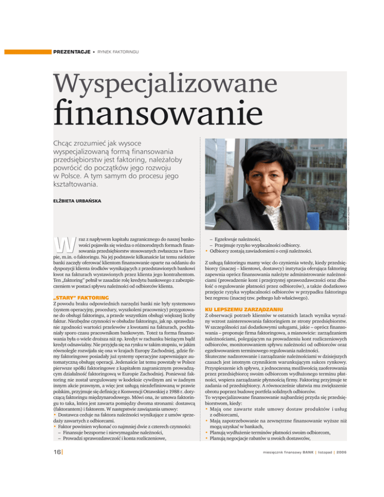 PREZENTACJE • RYNEK FAKTORINGU Wyspecjalizowane finansowanie Chcąc zrozumieć jak wysoce wyspecjalizowaną formą finansowania przedsiębiorstw jest faktoring, należałoby powrócić do początków jego rozwoju w Polsce. A tym samym do procesu jego kształtowania. FOT. WOJCIECH ŁĄCZYŃSKI ELŻBIETA URBAŃSKA W raz z napływem kapitału zagranicznego do naszej bankowości pojawiła się wiedza o różnorodnych formach finansowania przedsiębiorstw stosowanych zwłaszcza w Europie, m.in. o faktoringu. Na jej podstawie kilkanaście lat temu niektóre banki zaczęły oferować klientom finansowanie oparte na oddaniu do dyspozycji klienta środków wynikających z przedstawionych bankowi kwot na fakturach wystawionych przez klienta jego kontrahentom. Ten „faktoring” pełnił w zasadzie rolę kredytu bankowego z zabezpieczeniem w postaci spływu należności od odbiorców klienta. „STARY” FAKTORING Z powodu braku odpowiednich narzędzi banki nie były systemowo (system operacyjny, procedury, wyszkoleni pracownicy) przygotowane do obsługi faktoringu, a przede wszystkim obsługi większej liczby faktur. Niezbędne czynności w obsłudze faktoringu, jak np. sprawdzanie zgodności wartości przelewów z kwotami na fakturach, pochłaniały sporo czasu pracownikom bankowym. Toteż ta forma finansowania była o wiele droższa niż np. kredyt w rachunku bieżącym bądź kredyt odnawialny. Nie przyjęła się na rynku w takim stopniu, w jakim równolegle rozwijała się ona w krajach Europy Zachodniej, gdzie firmy faktoringowe posiadały już systemy operacyjne zapewniające automatyczną obsługę operacji. Jedenaście lat temu powstały w Polsce pierwsze spółki faktoringowe z kapitałem zagranicznym prowadzącym działalność faktoringową w Europie Zachodniej. Ponieważ faktoring nie został uregulowany w kodeksie cywilnym ani w żadnym innym akcie prawnym, a więc jest usługą niezdefiniowaną w prawie polskim, przyjmuje się definicję z Konwencji Ottawskiej z 1988 r. dotyczącą faktoringu międzynarodowego. Mówi ona, że umowa faktoringu to taka, która jest zawarta pomiędzy dwoma stronami: dostawcą (faktorantem) i faktorem. W następstwie zawiązania umowy: • Dostawca ceduje na faktora należności wynikające z umów sprzedaży zawartych z odbiorcami. • Faktor powinien wykonać co najmniej dwie z czterech czynności: – Finansuje bezsporne i niewymagalne należności, – Prowadzi sprawozdawczość i konta rozliczeniowe, 16| – Egzekwuje należności, – Przejmuje ryzyko wypłacalności odbiorcy. • Odbiorcy zostają zawiadomieni o cesji należności. Z usługą faktoringu mamy więc do czynienia wtedy, kiedy przedsiębiorcy (inaczej – klientowi, dostawcy) instytucja oferująca faktoring zapewnia oprócz finansowania należyte administrowanie należnościami (prowadzenie kont i przejrzystej sprawozdawczości oraz dbałość o regulowanie płatności przez odbiorców), a także dodatkowo przejęcie ryzyka wypłacalności odbiorców w przypadku faktoringu bez regresu (inaczej tzw. pełnego lub właściwego). KU LEPSZEMU ZARZĄDZANIU Z obserwacji potrzeb klientów w ostatnich latach wynika wyraźny wzrost zainteresowania faktoringiem ze strony przedsiębiorstw. W szczególności zaś dodatkowymi usługami, jakie – oprócz finansowania – proponuje firma faktoringowa, a mianowicie: zarządzaniem należnościami, polegającym na prowadzeniu kont rozliczeniowych odbiorców, monitorowaniem spływu należności od odbiorców oraz egzekwowaniem terminowego regulowania należności. Skuteczne nadzorowanie i zarządzanie należnościami w dzisiejszych czasach jest istotnym czynnikiem warunkującym sukces rynkowy. Przyspieszenie ich spływu, z jednoczesną możliwością zaoferowania przez przedsiębiorcę swoim odbiorcom wydłużonego terminu płatności, wspiera zarządzanie płynnością firmy. Faktoring przyjmuje te zadania od przedsiębiorcy. A równocześnie ułatwia mu zwiększenie obrotu poprzez budowę portfela solidnych odbiorców. To wyspecjalizowane finansowanie najbardziej przyda się przedsiębiorstwom, kiedy: • Mają one zawarte stałe umowy dostaw produktów i usług z odbiorcami, • Mają zapotrzebowanie na zewnętrzne finansowanie wyższe niż mogą uzyskać w bankach, • Planują wydłużenie terminów płatności swoim odbiorcom, • Planują negocjacje rabatów u swoich dostawców, miesięcznik finansowy BANK | listopad | 2006 RYNEK FAKTORINGU KRAJOWY Z REGRESEM (PRZYKŁAD) Duża firma farmaceutyczna ma ok. 1500 odbiorców, w tym hurtownie leków oraz pojedyncze apteki. Jest wśród nich ok. 20 odbiorców strategicznych i ok. 300 znacznie mniejszych z saldami do 50 tys. zł. Wielu odbiorców, szczególnie tych mniejszych, nie reguluje swoich zobowiązań terminowo. Firma ta nie posiada wyspecjalizowanych narzędzi do monitorowania tak dużej liczby odbiorców, a działania monitorujące spływ należności koncentrują się na strategicznych klientach. Spółka posiadała stale ok. 1 mln zł w należnościach, których opóźnienia wynosiły ok. 30 dni. W celu zdyscyplinowania współpracy z odbiorcami oraz uzyskania poprawy płynności finansowej, firma podjęła decyzję o podpisaniu umowy z faktorem. Ustalono prowizję w wysokości 0,5 proc. faktury brutto. Ten zobowiązał się do finansowania dostawcy, pisemnego i telefonicznego monitowania odbiorców oraz do bieżącego informowania dostawcy o spływie należności. Działania podjęte przez firmę faktoringową skróciły czas spływu należności o 21 dni, zmniejszyły pracochłonność działu finansowego, a przede wszystkim usprawniły współpracę dostawcy z jego odbiorcami. • Chcą polepszyć dyscyplinę płatniczą swoich odbiorców, a tym samym wskaźnik rotacji należności, • Chcą wprowadzić w firmie efektywne planowanie wpływów i wydatków, • Chcą mieć pewność, że ich odbiorcy zwłaszcza nowi są solidnymi kontrahentami. WINDYKACJA TO NIE FAKTORING Dodatkowo przy