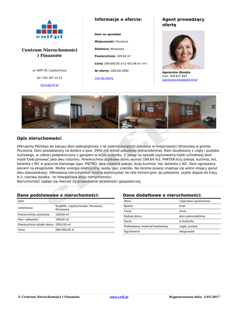 Agent prowadzący ofertę Opis nieruchomości Dane podstawowe o