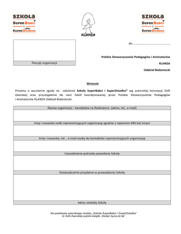 dn. …………………..…………………… Polskie Stowarzyszenie Pedagogów i Animatorów Pieczęć organizacji KLANZA Oddział Białostocki Wniosek Prosimy o wyrażenie zgody na założenie Szkoły SuperBabci i SuperDziadka® wg autorskiej koncepcji Zofii Zaorskiej oraz przystąpienia do sieci Szkół koordynowanej przez Polskie Stowarzyszenie Pedagogów i Animatorów KLANZA Oddział Białostocki. Nazwa organizacji – kandydata na Realizatora (adres, tel., e-mail) Imię i nazwisko osób reprezentujących organizację zgodnie z rejestrem KRS lub innym Imię i nazwisko, tel. , e-mail osoby do kontaktów reprezentujących organizację Uzasadnienie potrzeby powołania Szkoły Doświadczenie przydatne w prowadzeniu Szkoły Adres siedziby Szkoły Na podstawie autorskiego modelu „Szkoła SuperBabci i SuperDziadka" dr Zofii Zaorskiej autorki książki „Dodać życia do lat” Imię i nazwisko kierownika – koordynatora działań lokalnych oraz opis jego doświadczeń w pracy z seniorami Proponujemy następujące osoby prowadzące zajęcia: Imię i nazwisko osób prowadzących Kwalifikacje Proponowane zagadnienia Zobowiązujemy się do: 1. Przestrzegania zasad i ustaleń zawartych w porozumieniu współpracy między naszą organizacją a Polskim Stowarzyszeniem Pedagogów i Animatorów KLANZA Oddział Białostocki – ogólnopolskim koordynatorem rozwoju sieci Szkół. 2. Opłacenia jednorazowej opłaty licencyjnej w wysokości 500 zł na rzecz rozwoju sieci Szkół. 3. Powiadomienia ogólnopolskiego koordynatora o zaprzestaniu działalności Szkoły. Na podstawie autorskiego modelu „Szkoła SuperBabci i SuperDziadka" dr Zofii Zaorskiej autorki książki „Dodać życia do lat” Podpis osoby reprezentującej organizację DECYZJA O PRZYJĘCIU DO SIECI SZKÓŁ Nazwa organizacji – kandydata na Realizatora Siedziba organizacji Decyzja o przyjęciu do sieci Szkół Data Podpis ogólnopolskiego koordynatora Na podstawie autorskiego modelu „Szkoła SuperBabci i SuperDziadka" dr Zofii Zaorskiej autorki książki „Dodać życia do lat”