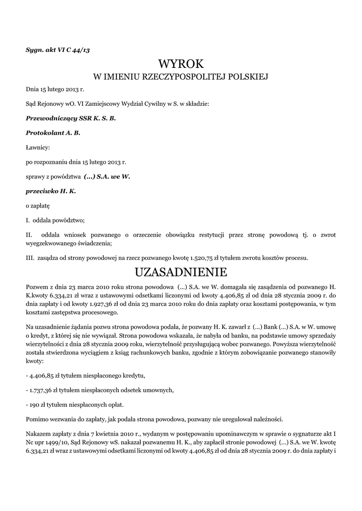 Sygn. akt VI C 44/13 WYROK W IMIENIU RZECZYPOSPOLITEJ POLSKIEJ Dnia 15 lutego 2013 r. Sąd Rejonowy wO. VI Zamiejscowy Wydział Cywilny w S. w składzie: Przewodniczący SSR K. S. B. Protokolant A. B. Ławnicy: po rozpoznaniu dnia 15 lutego 2013 r. sprawy z powództwa (...) S.A. we W. przeciwko H. K. o zapłatę I. oddala powództwo; II. oddala wniosek pozwanego o orzeczenie obowiązku restytucji przez stronę powodową tj. o zwrot wyegzekwowanego świadczenia; III. zasądza od strony powodowej na rzecz pozwanego kwotę 1.520,75 zł tytułem zwrotu kosztów procesu. UZASADNIENIE Pozwem z dnia 23 marca 2010 roku strona powodowa (...) S.A. we W. domagała się zasądzenia od pozwanego H. K.kwoty 6.334,21 zł wraz z ustawowymi odsetkami liczonymi od kwoty 4.406,85 zł od dnia 28 stycznia 2009 r. do dnia zapłaty i od kwoty 1.927,36 zł od dnia 23 marca 2010 roku do dnia zapłaty oraz kosztami postępowania, w tym kosztami zastępstwa procesowego. Na uzasadnienie żądania pozwu strona powodowa podała, że pozwany H. K. zawarł z (...) Bank (...) S.A. w W. umowę o kredyt, z której się nie wywiązał. Strona powodowa wskazała, że nabyła od banku, na podstawie umowy sprzedaży wierzytelności z dnia 28 stycznia 2009 roku, wierzytelność przysługującą wobec pozwanego. Powyższa wierzytelność została stwierdzona wyciągiem z ksiąg rachunkowych banku, zgodnie z którym zobowiązanie pozwanego stanowiły kwoty: - 4.406,85 zł tytułem niespłaconego kredytu, - 1.737,36 zł tytułem niespłaconych odsetek umownych, - 190 zł tytułem niespłaconych opłat. Pomimo wezwania do zapłaty, jak podała strona powodowa, pozwany nie uregulował należności. Nakazem zapłaty z dnia 7 kwietnia 2010 r., wydanym w postępowaniu upominawczym w sprawie o sygnaturze akt I Nc upr 1499/10, Sąd Rejonowy wS. nakazał pozwanemu H. K., aby zapłacił stronie powodowej (...) S.A. we W. kwotę 6.334,21 zł wraz z ustawowymi odsetkami liczonymi od kwoty 4.406,85 zł od dnia 28 stycznia 2009 r. do dnia zapłaty i od kwoty 1.927,36 zł od dnia 23 marca 2010 roku do dnia zapłaty oraz kwotę 1.280 zł tytułem zwrotu kosztów procesu, w tym kwotę 1.217 zł tytułem zwrotu kosztów zastępstwa procesowego. Pismem z dnia 19 kwietnia 2011 r. pozwany H. K. wniósł sprzeciw od powyższego nakazu zapłaty wraz z wnioskiem o przywrócenie terminu do jego wniesienia, domagając się uchylenia nakazu zapłaty i oddalenia powództwa w całości oraz zasądzenia od strony powodowej kosztów procesu, w tym kosztów zastępstwa procesowego. Postanowieniem z dnia 26 kwietnia 2011 r. sygn. akt I Nc upr 1499/10 Sąd Rejonowy w S. odrzucił wniosek pozwanego o przywrócenie terminu do wniesienia sprzeciwu oraz odrzucił sprzeciw od nakazu zapłaty. Pismem z dnia 13 lutego 2012 r. pozwany H. K. wniósł o uchylenie nakazu zapłaty i skuteczne doręczenie nakazu wraz z odpisem pozwu, gdyż nakaz nie został skutecznie pozwanemu doręczony, a wysłany był na adres, pod którym pozwany nigdy nie mieszkał. Postanowieniem z dnia 23 lutego 2012 r. sygn. akt I Nc upr 1499/10 Sąd Rejonowy w Strzelinie uchylił klauzulę wykonalności nadaną nakazowi zapłaty z dnia 7 kwietnia 2010 r. w sprawie I Nc upr 1499/10. Ponadto zarządzono doręczenie pozwanemu odpisu pozwu w niniejszej sprawie, uznając, iż nakaz zapłaty nie został skutecznie doręczony pozwanemu, a sprzeciw wniesiony w terminie. Pismem z dnia 21 marca 2012 r. pozwany H. K. sprecyzował swoje stanowisko, domagając się oddalenia powództwa w całości oraz orzeczenia obowiązku restytucji przez stronę powodową na rzecz pozwanego kwot uzyskanych w wyniku dotychczasowej egzekucji. W uzasadnieniu pozwany podniósł zarzut przedawnienia roszczenia oraz nieistnienia zobowiązania ze względu na fakt, iż pozwany nie zawierał z baniem (...) Bank (...) S.A. w W. przedmiotowej umowy kredytowej, a znajdujący się na umowie podpis nie został złożony przez pozwanego. W piśmie procesowym z dnia 05.04.2012 r. pozwany podtrzymując dotychczasowe stanowisko w sprawie, sprecyzował podniesiony zarzut przedawnienia roszczenia, wskazując z ostrożności procesowej na przedawnienie 3 rat w łącznej kwocie 527,73 zł. Na rozprawie w dniu 15 lutego 2013 r. Sąd postanowił o rozpoznaniu sprawy z pominiecie przepisów o postępowaniu uproszczonym. Sąd ustalił następujący stan faktyczny: W dniu 16 grudnia 2006 roku zawarta została umowa o kredyt nr (...) między (...) Bank (...) S.A. w W. a nieznaną osobą, która posłużyła się dokumentami należącymi do pozwanego H. K. oraz podpisała się pod umową nazwiskiem pozwanego. Kwota kredytu wyniosła 4.406.85 zł. dowód: - umowa kredytowa nr (...) z dnia 16.12.2006 r. k. 70; - opinia biegłego sądowego z zakresu badań pisma ręcznego P. F. k. 179-190. Zgodnie z treścią zawartej umowy, kredytobiorca zobowiązał się do spłaty kredytu w 32 ratach miesięcznych w kwocie po 175,91 zł., przy czym ustalono, że data płatności pierwszej raty przypada na dzień odpowiadający dacie zawarcia umowy po 3 miesiącach od jej zawarcia. dowód: - umowa kredytowa nr (...) z dnia 16.12.2006 r. k. 70. Znajdujący się na umowie podpis: (...) nie został sporządzony przez pozwanego H. K., został sporządzony średnim tempem, bez widocznych zatrzymań, drżenia linii, pismem wyraźnie pochylonym w prawo. dowód: - umowa kredytowa nr (...) z dnia 16.12.2006 r. k. 70; - opinia biegłego sądowego z zakresu badań pisma ręcznego P. F. k. 179-190; - kopia dowodu osobistego k. 50-51; - dowód osobisty k. 99; - protokół pobrania materiału porównawczego z dnia 15.09.2012 r. k. 121; - próbki pisma k. 122; - książeczka wojskowa k. 123; - pismo z dnia 25.04.1955 r. k. 155; - kartka z życzeniami k. 156; - legitymacja ubezpieczeniowa k. 156. Na podstawie umowy zawartej w dniu 28 stycznia 2009 roku (...) Bank (...) S.A. w W. sprzedał na rzecz strony powodowej (...) S.A. we W. wierzytelność przysługującą z tytułu przedmiotowej