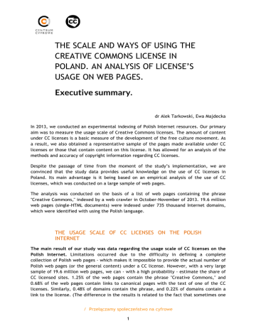 THE SCALE AND WAYS OF USING THE CREATIVE COMMONS LICENSE IN POLAND. AN ANALYSIS OF LICENSE’S USAGE ON WEB PAGES. Executive summary. dr Alek Tarkowski, Ewa Majdecka In 2013, we conducted an experimental indexing of Polish Internet resources. Our primary aim was to measure the usage scale of Creative Commons licenses. The amount of content under CC licenses is a basic measure of the development of the free culture movement. As a result, we also obtained a representative sample of the pages made available under CC licenses or those that contain content on this license. It has allowed for an analysis of the methods and accuracy of copyright information regarding CC licenses. Despite the passage of time from the moment of the study’s implementation, we are convinced that the study data provides useful knowledge on the use of CC licenses in Poland. Its main advantage is it being based on an empirical analysis of the use of CC licenses, which was conducted on a large sample of web pages. The analysis was conducted on the basis of a list of web pages containing the phrase "Creative Commons," indexed by a web crawler in October-November of 2013. 19.6 million web pages (single-HTML documents) were indexed under 735 thousand Internet domains, which were identified with using the Polish language. THE USAGE SCALE OF CC LICENSES ON THE POLISH INTERNET The main result of our study was data regarding the usage scale of CC licenses on the Polish Internet. Limitations occurred due to the difficulty in defining a complete collection of Polish web pages - which makes it impossible to provide the actual number of Polish web pages (or the general content) under a CC license. However, with a very large sample of 19.6 million web pages, we can - with a high probability - estimate the share of CC licensed sites. 1.25% of the web pages contain the phrase "Creative Commons," and 0.68% of the web pages contain links to canonical pages with the text of one of the CC licenses. Similarly, 0.48% of domains contain the phrase, and 0.22% of domains contain a link to the license. (The difference in the results is related to the fact that sometimes one / Przełączamy społeczeństwo na cyfrowe 1 domain contains more than one page under a CC license). We assume, rounding the result, that about 1% of all online content is under one of the CC licenses. Web pages under one of the Creative Commons licenses The basic requirement for licensing content under a CC license is to provide licensing information. For that reason, we checked the way of presenting this information on a page. 70% of domains using a CC license place information regarding a selected Creative Commons license in the footer of the page. 60% of domains present the license by providing the name or symbol of a specific license and a link to a page with the full license content. It is a good result, suggesting large-scale understanding in this group of how to utilize CC licensing. However, almost 20% of sites committed a fundamental error, by not not indicating the specific license in use. (It should be noted that we were unable to measure the scale of use of CC licensed content without any attribution or licensing information – as it did not appear in our sample). The most commonly used Creative Commons license, in almost 1/4 of the cases, was BY-SA (Attribution – Share-alike), also used by Wikipedia. Interestingly, the four most popular Creative Commons licenses on the Polish Internet are the least and most restrictive. It is also worth noting that almost 50% of the web pages are available on one of the two free licenses (CC BY or CC BY-SA). Web pages with content shared under Creative Commons licenses The vast majority of the content shared under CC licenses consists of images (49%). The next categories are shared much less frequently. Ebooks and text files (usually in a PDF format) constitute 12%, and 11% are texts published directly on the web page, e.g. posts on blogs. One of the reasons for this is the role of major platforms, which share images under CC licenses, which are then used on other web pages. Flickr or Wikimedia Commons make it possible to license content with a selected (Flickr) or specific (Wikimedia Commons) CC license. of the analyzed content has not been produced by the authors of particular web pages, but downloaded from other sources. The most common source was Flickr. Even if information about a Creative Commons license was missing under an image, it was present in the metadata of the images and in this way, it was indexed by a web crawler. 1/3 of the content found under Creative Commons licenses was created by the authors of the analyzed web pages. / Przełączamy społeczeństwo na cyfrowe 2 Similarly to web pages that were in their entirety shared under CC, content by other authors, when used on a webpage, usually contains both information about the licensing conditions and a link to the web page with the full license content. The scale is, however, smaller – just over 40%, compared to 60%. The systematic or incidental use of a Creative Commons license The 243,544 pages available under CC, or which contain content on this license, are unevenly distributed between domains. 916 domains had just one link related to Creative Commons, 825 domains had from 2 to 49 links on a page. This is one of the most significant conclusions of this study. In half the cases, using a Creative Commons license turns out to be incidental or even a one-time occurence. It is important to take into account that quite often the licensed content consists of images and graphics, and these are largely drawn from the largest services with images and graphics (such as Flickr and Wikimedia Commons). Content from these portals have information about CC in the metadata, and upon copying to one’s own website, the signature as well as a link to the Creative Commons page is automatically downloaded. They can be indexed by web crawlers, but users may not even kno
