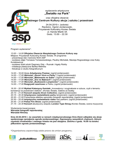 wydarzenie artystyczne „Światło na Park” oraz oficjalne otwarcie Niezależnego Centrum Kultury akcja | sztuka | przestrzeń 24.04.2010 r. (sobota) Racib€rz, Ogr€d Jordanowski, Przystanek Kulturalny Koniec Świata ul. Karola Miarki 3A Godz. 13.00 – 22.30 Program wydarzenia*: 13.00 – 14.00 Oficjalne Otwarcie Niezależnego Centrum Kultury asp. Miejsce: Przystanek Kulturalny Koniec Świata. W programie: - prezentacja idei i tw€rc€w NCK ASP - wystawa zdjęć Tomasza Tomaszewskiego, Pauliny Michalak, Macieja Rogowskiego oraz Kuby Kurakiewicza - wystawa dzieł sztuki Dagmary Giej – Rusnak i Agaty Rokity - instalacja plastyczna Bartka Mielnika - fotoakcja w studiu fotograficznym 14.00 – 16.00 Akcja Artystyczny Posiew; (ogr€d jordanowski) 14.00 – 17.00 Warsztat „Savoir Vivre w Parku”; (ogr€d jordanowski) 14.00 – 17.00 Warsztat „Malowanie na Szkle”; (ogr€d jordanowski) 14.00 – 17.00 Warsztat „Gra na Bębnach”; (ogr€d jordanowski) 14.00 – 17.00 Warsztat „Budowanie Lampionƒw”; (ogr€d jordanowski) 14.00 – 17.00 Rozgrywki szachowe w Parku; (ogr€d jordanowski) 19.30 – 20.00 Wykład Katarzyny Kwiotek „Innowatorzy i oryginałowie w sztuce, czyli o łamaniu konwencji na przestrzeni wiek€w”; (Koniec Świata, Galeria za Szafą) 20.10 – 21.00 Koncert zespołu Drum Collective; (ogr€d jordanowski) 20.15 – 20.30 Artystyczne rozświetlanie parku lampionami; (ogr€d jordanowski) 20.30 – 21.00 Prezentacja efekt€w warsztatu fotografii reporterskiej; (ogr€d jordanowski) 20.30 – 20.45 Artystyczne rozświetlanie nieba nad parkiem; (ogr€d jordanowski) 20.45 – 21.00 Pokaz Fire Show; (ogr€d jordanowski) 21.15 – 22.30 Koncert akustyczny zespołu London Type Smog (Koniec Świata, scena muzyczna) Wydarzenia towarzyszące: Warsztat fotografii reporterskiej Warsztat filmowy Dnia 22.04.2010 r. (w czwartek) w ramach międzynarodowego Dnia Ziemi odbędzie się akcja społecznego sprzątania ogrodu jordanowskiego. Zapraszamy wszystkich chętnych, kt‰rym czystość środowiska i naszego miasta nie jest obojętna. Zbi‰rka o godz. 16.00 na boisku piłkarskim ogrodu jordanowskiego. *Organizatorzy zapewniają sobie prawo do zmian programu. Organizatorzy: Raciborskie Stowarzyszenie Kulturalne ASK Niezależne Centrum Kultury akcja | sztuka | przestrzeń Przystanek Kulturalny Koniec Świata Partnerzy: Młodzieżowy Dom Kultury w Raciborzu Zakład Poprawczy i Schronisko dla Nieletnich w Raciborzu Sponsorzy: Hotel Polonia w Raciborzu DTi - Design Technologies International Sp. z o.o. Koltech Sp. z o.o. Bank Sp€łdzielczy w Raciborzu Gminna Sp€łdzielnia Samopomoc Chłopska Salony Odzieżowe Gabriela Przedsięwzięcie jest realizowane w ramach projektu „Szkoła Menadżer€w Kultury”, finansowanego z Funduszu Inicjatyw Obywatelskich Ministerstwa Pracy i Polityki Społecznej. Kontakt i zgłoszenia na warsztaty: [email protected] www.asp.org.pl, www.ask.org.pl Zgłoszenia na warsztaty są przyjmowane do dnia 22 kwietnia 2010 r. telefonicznie pod nr 507 371 947 lub mailowo pod adresem: [email protected] Warsztat Malowanie na Szkle: | Warsztat będzie polegał na malowaniu przez dzieci i młodzież własnych portret€w na szkle. Warsztat będzie prowadzony przez profesjonalnych artyst€w plastyk€w zajmujących się malarstwem i sztuką szkła. Materiały zostaną dostarczone przez organizator€w. | Wiek uczestnik€w: od 7 lat wzwyż Warsztat Savoir Vivre w Parku: | Warsztat będzie polegał na przygotowaniu w formie tekstowo – obrazkowej zasad związanych z przebywaniem w parku (np. nie wyrzucamy śmieci, sprzątamy po zwierzętach gdy załatwią swoje potrzeby). Zostaną one wykonane na specjalnych tabliczkach, kt€re pozostaną w Parku po zakończeniu akcji. Jej celem jest edukowanie dzieci i młodzieży pod kątem właściwych zachowań w przestrzeni publicznej, jaką jest park miejski. Warsztat będzie prowadzony przez doświadczonych tw€rc€w i animator€w kultury, z materiał€w dostarczonych przez organizator€w. | Wiek uczestnik€w: od 5 lat wzwyż. Warsztat Budowanie Lampionƒw: | Warsztat będzie polegał na zaprojektowaniu i stworzeniu szklanych lampion€w statycznych. Lampiony zostaną zaprojektowane i wykonane przez dzieci pod okiem plastyk€w z materiał€w dostarczonych przez organizator€w. Następnie, tuż po zmroku (ok. godz. 20.30), zostaną one wszystkie rozpalone i pozwolą nam oświetlić park. | Wiek uczestnik€w: od 5 lat wzwyż. Warsztat Gra na Bębnach: | Warsztat będzie prowadzony przez muzyk€w z grupy Drum Collective z Opola. Będą oni uczyć podstawowych technik gry na bębnach (m.in. djembe, bongo). Podczas 3 godzin warsztatu uczestnicy nauczą się podstawowych uderzeń, zasad gry na bębnach oraz kilku prostych rytm€w. Warsztat ma być inspiracją do dalszej, samodzielnej gry na instrumencie. Organizatorzy zapewnią bębny dla około 10 uczestnik€w. Zainteresowanych prosimy o przybycie – w miarę możliwości – z własnym instrumentarium. | Wiek uczestnik€w: bez ograniczeń.