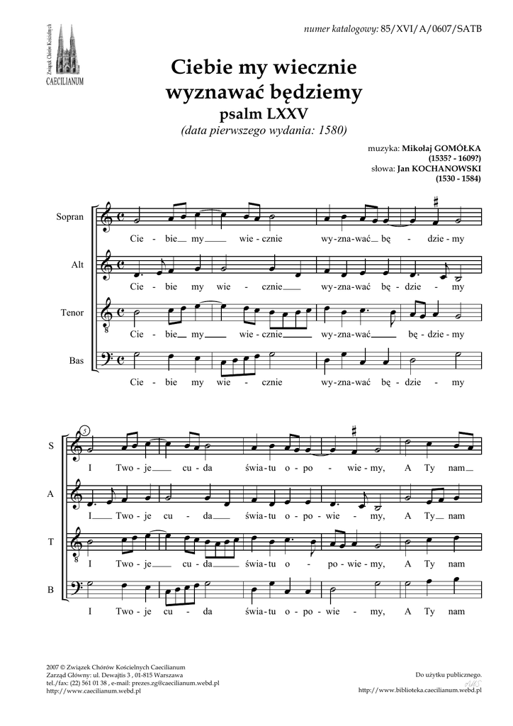 numer katalogowy: 85/XVI/A/0607/SATB Ciebie my wiecznie wyznawać będziemy psalm LXXV (data pierwszego wydania: 1580) muzyka: Mikołaj GOMÓŁKA (1535? - 1609?) słowa: Jan KOCHANOWSKI (1530 - 1584) &c ˙ Sopran Cie - Cie - Vc ˙ Tenor Cie - ?c ˙ Bas Cie - 5 &˙ I A V˙ I B œ my œ bie ˙ my wie œ œ œ bie œ my œ Two - je Two - je cu my - - œ cznie wie œ œ da ?˙ I Two - je œ cu - da œ œœœœ ˙ cu - da 2007 © Związek Chórów Kościelnych Caecilianum Zarząd Główny: ul. Dewajtis 3 , 01-815 Warszawa tel./fax: (22) 561 01 38 , e-mail: [email protected] http://www.caecilianum.webd.pl wy - zna - wać bę œ œ œ œ wy - zna - wać - świa - tu o - po œ œ œ œ - œ. świa - tu o - po - wie świa - tu o œ wy - zna - wać œ œ œœ œ - œ œ œ œ œ J œœ œ ˙ j œ ˙ my, świa - tu o - po - wie - my ˙ ˙ - ˙ œ A Ty ˙ my œ œ nam ˙ œœ œ A Ty nam ˙ A Ty ˙ œ nam my, A Ty nam ˙ po - wie - my, ˙ œ. bę - dzie wie - my, - - j œ ˙ dzie - my bę - dzie - my œ œ œ # œ œ - ˙ œ J œœ œ wy - zna - wać cznie œ bę - dzie œ œ œ œ œ œ œ œ œ. œ œ œ œ œ œ œ œ œ œ œ œ œ. Two - je œ ˙ œœœœ cu - da œ ˙ œ œ œ œœ wie - cznie œ bie œœ ˙ wie - cznie œœ œ œ œœ˙ & œ . œj œ I T bie & c œ . œj œ Alt S œ œ œ # œ ˙ œ œ œ Do uŜytku publicznego. http://www.biblioteka.caecilianum.webd.pl psalm LXXV - Mikołaj GOMÓŁKA & œ. j œ œ œ œ & œ œ œ œ 10 S szczę - ścić bę - dziesz A œ szczę - ścić T B V œ ? œ œ szczę - ścić œ szczę - ścić œ bę - dziesz œ bę - dziesz œ œ bę - dziesz œ œ œ œ œ J na - sze spra œ œ œ. - œ œ œ œ œ œ na - sze na - sze œ œ ˙ na - sze spra œ J ˙ ˙ œ ˙ wy, Bo - Ŝe ła j œ ˙ ˙ ˙ - œ œ œ. spra - wy, Bo - Ŝe ła - ska ˙ ˙ - ˙ w ska - wy. œ. œ œ œ œ J spra - wy, Bo - Ŝe U œ j U œ w - wy. U w ła - ska - wy. U œ œ ˙ wy, Bo - Ŝe ła - ska - w wy. PSALM LXXV Confitebimur Tibi, Deus 1. Ciebie my wiecznie wyznawać będziemy I Twoje cuda światu opowiemy, A Ty nam szczęścić będziesz nasze sprawy, BoŜe łaskawy! 5. PróŜno się sławy albo ode wschodu, Albo spodziewać od słońca zachodu; Ani z południa przyjdzie, ani ona Od Akwilona. 2. "Kiedy się skończą zamierzone lata - Pan opowiada - przyjdę sądzić świata; Tam płacić będę dobrze cnotliwemu, , Złe nieprawemu. 6. Bóg panem świata i sam wszytkim włada, Hardego z miejsca wysokiego zbada, A niewolnika posadzi w koronie Na złotym tronie. 3. StrwoŜona ziemia wespołek i z temi Będzie topniała, którzy są na ziemi, Ale zaś przez mię jej słupy zwątlone Będą zmocnione." 7. U Pana w ręku pełna czasza stoi Przykrego moszczu; tym złe ludzi poi Lejąc im droŜdŜe i jad niewidomy W gardziel łakomy. 4. Kajcie się grzechów - upominam - kajcie Ani poroŜem nazbyt potrząsajcie; Bóg niech ma pokój, ani mówcie hardzie Jemu ku wzgardzie. 8. A ja Twą dobroć, BoŜe, wyznam wiecznie I swego czasu hardemu koniecznie Przyłomię rogów, tam prazna kłopota OŜywie cnota. -2- http://www.biblioteka.caecilianum.webd.pl