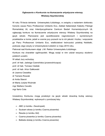 Ogłoszenie o Konkursie na tłumaczenie artystyczne wierszy Wisławy Szymborskiej W roku 70-lecia istnienia Uniwersytetu Łódzkiego, w związku z nadaniem doktoratu honoris causa Panu Profesorowi Umberto Eco, Zakład Italianistyki Katedry Filologii Romańskiej UŁ oraz Interdyscyplinarne Centrum Badań Humanistycznych UŁ ogłaszają konkurs na tłumaczenie artystyczne wierszy Wisławy Szymborskiej na język włoski. Planowane jest opublikowanie nagrodzonych i wyróżnionych przekładów w tomie, jeżeli w ocenie jury pozwoli na to ich jakość i liczba, i wręczenie go Panu Profesorowi Umberto Eco, wielbicielowi twórczości polskiej Noblistki, podczas Jego wizyty w Uniwersytecie Łódzkim w maju 2015 roku. Patronat nad Konkursem objął J.M. Rektor Uniwersytetu Łódzkiego. Konkurs ma charakter ogólnopolski. Mogą wziąć w nim udział wszyscy studenci polskich uczelni. W skład Jury wchodzą: prof. dr hab. Jadwiga Czerwińska (przewodnicząca) prof. dr hab. Tomasz Cieślak prof. dr hab. Artur Gałkowski dr Joanna Ciesielka dr Tamara Roszak dr Anita Staroń dr Maria Judyta Woźniak mgr Stefano Cavallo mgr Ilario Cola Uczestnicy Konkursu mogą przełożyć na język włoski dowolną liczbę wierszy Wisławy Szymborskiej wybranych z poniższej listy: • ABC (z tomiku Dwukropek) • Szukam słowa (z tomiku Czarna piosenka) • Reszta (z tomiku Sól) • Czarna piosenka (z tomiku Czarna piosenka) • Ballada dzisiaj (z tomiku Czarna piosenka) • Pochwała snów (z tomiku Wszelki wypadek) • Możliwości (z tomiku Ludzie na moście) • Dworzec (z tomiku Sto pociech) • Prospekt (z tomiku Wszelki wypadek) • Fotografia z 11 IX ( z tomiku Chwila) • Wszelki wypadek (z tomiku Wszelki wypadek) • Pogrzeb (z tomiku Ludzie na moście) • Kot w pustym mieszkaniu (z tomiku Koniec i początek) • Nic darowane (z tomiku Koniec i początek) • Dedykowane poezji (z tomiku Czarna piosenka) Prace konkursowe będą rozpatrywane z zachowaniem anonimowości Autorów. Przekłady należy nadesłać lub przynieść do sekretariatu Katedry Filologii Romańskiej* (90-236 Łódź, ul. Pomorska 171/173, pokój 4.46) w zaklejonej kopercie, oznaczonej dowolnym znakiem graficznym lub literowym. W ten sam sposób należy oznaczyć dołączoną do przesyłki mniejszą, zaklejoną kopertę, zawierającą imię, nazwisko i adres Autorki/Autora (z numerem telefonu, adresem e-mailowym) oraz podpisane przez siebie czytelne oświadczenie o własnym autorstwie przedłożonego tłumaczenia wiersza/przedłożonych tłumaczeń wierszy. Jury będzie rozpatrywać jedynie prace dostarczone do siedziby UŁ we wskazany wyżej sposób do dnia 9 lutego 2015 r. Na posiedzeniu zamykającym Konkurs Jury podejmie decyzję o przyznaniu nagrody głównej w postaci iPoda mini i wyróżnień – książek Wydawnictwa Uniwersytetu Łódzkiego. Werdykt zostanie następnie opublikowany na stronach UŁ. O dokładnym miejscu i czasie uroczystości rozstrzygnięcia Konkursu i wręczenia nagród Laureaci zostaną powiadomieni indywidualnie. Organizatorzy nie zwracają uczestnikom Konkursu prac konkursowych. Uniwersytet Łódzki zastrzega sobie prawo do nieodpłatnej publikacji tekstów prac konkursowych w materiałach informacyjnych i promocyjnych, na wszystkich nośnikach. Kontakt: [email protected] * Godziny pracy sekretariatu KFR: pon., śr., pt. 8.00 – 15.00; wt., czw. 7.30 – 14.30.
