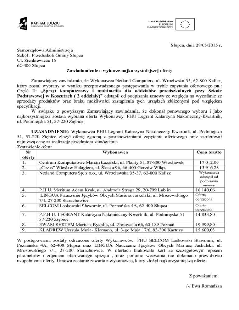 Słupca, dnia 29/05/2015 r. Samorządowa Administracja Szkół i Przedszkoli Gminy Słupca Ul. Sienkiewicza 16 62-400 Słupca Zawiadomienie o wyborze najkorzystniejszej oferty Zamawiający zawiadamia, że Wykonawca Netland Computers, ul. Wrocłwska 35, 62-800 Kalisz, który został wybrany w wyniku przeprowadzonego postępowania w trybie zapytania ofertowego pn.: Część II: „Sprzęt komputerowy i multimedia dla oddziałów przedszkolnych przy Szkole Podstawowej w Koszutach ( 2 oddziały)” odstąpił od podpisania umowy ze względu na wycofanie ze sprzedaży produktów oraz braku możliwości zastąpienia tych urządzeń zbliżonymi pod względem specyfikacji. W związku z powyższym Zamawiający zawiadamia, że dokonał ponownego wyboru i jako najkorzystniejsza została wybrana oferta Wykonawcy: PHU Legrant Katarzyna Nakoneczny-Kwartnik, ul. Podmiejska 51, 57-220 Ziębice. UZASADNIENIE: Wykonawca PHU Legrant Katarzyna Nakoneczny-Kwartnik, ul. Podmiejska 51, 57-220 Ziębice złożył ofertę zgodną z postanowieniami zapytania ofertowego oraz zaoferował najniższą cenę za realizację przedmiotu zamówienia. Zestawienie ofert: Nr Wykonawca Cena brutto oferty 1. Centrum Komputerowe Marcin Łazarski, ul. Planty 51, 87-800 Włocławek 17 012,00 2. „Cezas” Wiesław Halagiera, ul. Śląska 96, 66-400 Gorzów Wlkp. 15 916,28 Wykonawca 3. Netland Computers Sp. z o.o., ul. Wrocławska 35-37, 62-800 Kalisz odstąpił od podpisania umowy 4. 5. 6. 7. 8. 9. P.H.U. Meritum Adam Kruk, ul. Andrzeja Struga 29, 20-709 Lublin LINGUA Nauczanie Języków Obcych Mariusz Jaskulski, ul. Mrozowskiego 7/1, 27-200 Starachowice SELCOM Laskowski Sławomir, ul. Poznańska 4A, 62-400 Słupca 16 140,06 P.P.H.U. LEGRANT Katarzyna Nakonieczny-Kwartnik, ul. Podmiejska 51, 57-220 Ziębice EWAM SYSTEM Mariusz Rychlik, ul. Złotowska 66, 60-189 Poznań KLADREW Urszula Muża- Klamann, ul. 3-go Maja 17/6, 83-300 Kartuzy 14 833,80 Oferta odrzucona Oferta odrzucona 19 999,80 15 600,03 W postępowaniu zostały odrzucone oferty Wykonawców: PHU SELCOM Laskowski Sławomir, ul. Poznańska 4A, 62-400 Słupca oraz LINGUA Nauczanie Języków Obcych Mariusz Jaskulski, ul. Mrozowskiego 7/1, 27-200 Starachowice. W ofertach brakowało kart ze szczegółowym opisem parametrów i zdjęciem oferowanego sprzętu , oraz pomimo wezwania nie dokonano prawidłowo uzupełnienia oferty. Umowa zostanie zawarta z wykonawcą, który złożył najkorzystniejszą ofertę. Z poważaniem, /-/ Ewa Romańska