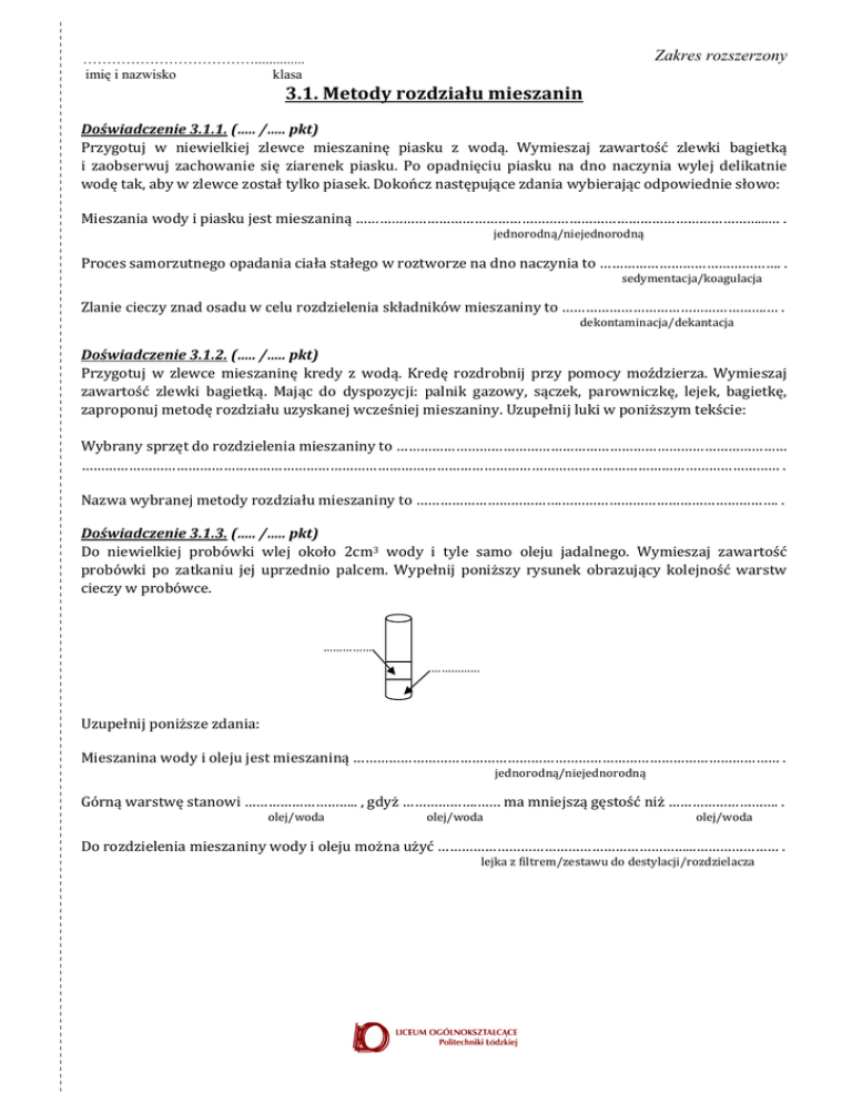 Zakres rozszerzony ……………………………….............. imię i nazwisko klasa 3.1. Metody rozdziału mieszanin Doświadczenie 3.1.1. (….. /….. pkt) Przygotuj w niewielkiej zlewce mieszaninę piasku z wodą. Wymieszaj zawartość zlewki bagietką i zaobserwuj zachowanie się ziarenek piasku. Po opadnięciu piasku na dno naczynia wylej delikatnie wodę tak, aby w zlewce został tylko piasek. Dokończ następujące zdania wybierając odpowiednie słowo: Mieszania wody i piasku jest mieszaniną …………………………………………………………………………………………...… . jednorodną/niejednorodną Proces samorzutnego opadania ciała stałego w roztworze na dno naczynia to ………………………………………. . sedymentacja/koagulacja Zlanie cieczy znad osadu w celu rozdzielenia składników mieszaniny to …………………………………………….… . dekontaminacja/dekantacja Doświadczenie 3.1.2. (….. /….. pkt) Przygotuj w zlewce mieszaninę kredy z wodą. Kredę rozdrobnij przy pomocy moździerza. Wymieszaj zawartość zlewki bagietką. Mając do dyspozycji: palnik gazowy, sączek, parowniczkę, lejek, bagietkę, zaproponuj metodę rozdziału uzyskanej wcześniej mieszaniny. Uzupełnij luki w poniższym tekście: Wybrany sprzęt do rozdzielenia mieszaniny to ……………………………………………………………………………………… …………………………………………………………………………………………………………………………………………………………… . Nazwa wybranej metody rozdziału mieszaniny to ……………………………….………………………………………………. . Doświadczenie 3.1.3. (….. /….. pkt) Do niewielkiej probówki wlej około 2cm3 wody i tyle samo oleju jadalnego. Wymieszaj zawartość probówki po zatkaniu jej uprzednio palcem. Wypełnij poniższy rysunek obrazujący kolejność warstw cieczy w probówce. …………… …………… . Uzupełnij poniższe zdania: Mieszanina wody i oleju jest mieszaniną ……………………………………………………………………………………………… . jednorodną/niejednorodną Górną warstwę stanowi ……………………….. , gdyż ……………….…… ma mniejszą gęstość niż ………………………. . olej/woda olej/woda olej/woda Do rozdzielenia mieszaniny wody i oleju można użyć ………………………………………………………...………………… . lejka z filtrem/zestawu do destylacji/rozdzielacza Zakres rozszerzony Doświadczenie 3.1.4. (….. /….. pkt) Na pasku bibuły narysuj za pomocą flamastra kropkę wielkości ziarenka grochu (w odległości około 1 cm od jednego z końców). Drugi koniec paska zagnij, przewieś przez bagietkę i umieść w zlewce z eluentem, tak aby narysowana kropka była ponad poziomem cieczy. Poczekaj, aż eluent nasączy bibułę do miejsca zagięcia. Doświadczenie wykonaj dla dwóch eluentów (czterochlorek węgla, aceton + etanol). Zapisz obserwacje oraz wniosek dotyczący zdolności danego eluentu do rozdzielania tuszu. Obserwacje: …………………………………………………………………………………………………………… …………………………………………………………………………………………………………… …………………………………………………………………………………………………………… …………………………………………………………………………………………………………… Wniosek: …………………………………………………………………………………………………………… …………………………………………………………………………………………………………… …………………………………………………………………………………………………………… Wiedząc, że czterochlorek węgla jest cieczą niepolarną a mieszanina acetonu z etanolem cieczą polarną, uzasadnij swój wniosek, biorąc pod uwagę polarność składników tuszu. Uzasadnienie: …………………………………………………………………………………………………………………………………………………………… …………………………………………………………………………………………………………………………………………………………… …………………………………………………………………………………………………………………………………………………………… ……………………………………………………………………………………………………………………………………………………………