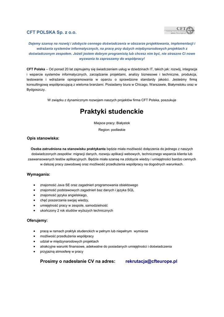 CFT POLSKA Sp. z o.o. Dajemy szansę na rozwój i zdobycie cennego doświadczenia w obszarze projektowania, implementacji i wdrażania systemów informatycznych, na pracę przy dużych międzynarodowych projektach z doświadczonym zespołem. Jeżeli jestem dobrym programistą lub chcesz nim być, nie straszne Ci nowe wyzwania to zapraszamy do współpracy! CFT Polska – Od ponad 20 lat zajmujemy się świadczeniem usług w dziedzinach IT, takich jak: rozwój, integracja i wsparcie systemów informatycznych, zarządzanie projektami, analizy biznesowe i techniczne, produkcja, testowanie i wdrażanie oprogramowania w oparciu o sprawdzone standardy jakości. Jesteśmy firmą konsultingową współpracującą z wieloma branżami. Posiadamy biura w Chicago, Warszawie, Białymstoku oraz w Bydgoszczy. W związku z dynamicznym rozwojem naszych projektów firma CFT Polska, poszukuje Praktyki studenckie Miejsce pracy: Białystok Region: podlaskie Opis stanowiska: Osoba zatrudniona na stanowisku praktykanta będzie miała możliwość dołączenia do jednego z naszych doświadczonych zespołów: migracji danych, rozwoju aplikacji webowych, technicznego wsparcia klienta lub zaawansowanych testów aplikacyjnych. Będzie miała szansę na zdobycie wiedzy i umiejętności bardzo cennych w dalszej pracy zawodowej oraz możliwość przedłużenia współpracy na dogodnych warunkach. Wymagania:       znajomość Java SE oraz zagadnień programowania obiektowego znajomość podstawowych zagadnień baz danych i języka SQL znajomość języka angielskiego, chęć poszerzania swojej wiedzy, umiejętność pracy w zespole, samodzielność ukończony 2 rok studiów wyższych technicznych Oferujemy:      pracę w ramach praktyk studenckich w pełnym lub niepełnym wymiarze możliwość przedłużenia współpracy udział w międzynarodowych projektach atrakcyjne warunki finansowe, adekwatne do posiadanych umiejętności i doświadczenia przyjazną atmosferę w pracy Prosimy o nadesłanie CV na adres: [email protected]