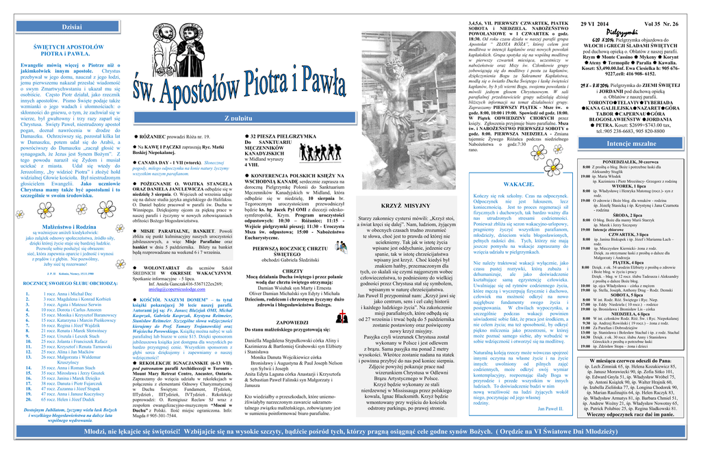 3,4,5,6, VII. PIERWSZY CZWARTEK, PIATEK SOBOTA i NIEDZIELA. NABOŻEŃSTWO POWOŁANIOWE w I CZWARTEK o godz. 18:30. Od roku czasu działa w naszej parafii grupa Apostolat “ ZŁOTA RÓŻA”, której celem jest modlitwa w intencji kapłanów oraz nowych powołań kapłańskich. Grupa spotyka się na wspólną modlitwę w pierwszy czwartek miesiąca, uczestniczy w nabożeństwie oraz Mszy św. Członkowie grupy zobowiązują się do modlitwy i postu za kapłanów, dziękczynienia Bogu za Sakrament Kapłaństwa, modlą się o światło Ducha Świętego i łaskę świętości kapłanów, by b yli wierni Bogu, swojemu powołaniu i mówili jednym głosem Chrystusowym. W sali parafialnej przedstawiciele grupy udzielają dzisiaj bliższych informacji na temat działalności grupy. Zapraszamy PIERWSZY PIĄTEK - Msze św. o godz. 8:00, 10:00 i 19:00. Spowiedź od godz. 18:00. W Piątek ODWIEDZINY CHORYCH przez księży. Zgłoszenia przyjmuje biuro parafialne. Msza św. i NABOŻEŃSTWO PIERWSZEJ SOBOTY o godz. 8:00. PIERWSZA NIEDZIELA - Zmiana tajemnic Żywego Różańca podczas niedzielnego Nabożeństwa o godz.7:30 rano. Dzisiaj ŚWIĘTYCH APOSTOŁÓW PIOTRA i PAWŁA. Ewangelie mówią więcej o Piotrze niż o jakimkolwiek innym apostole. Chrystus przebywał w jego domu, nauczał z jego łodzi, jemu pierwszemu nakazał przesłać wiadomość o swym Zmartwychwstaniu i ukazał mu się osobiście. Często Piotr działał, jako rzecznik innych apostołów. Pismo Święte podaje także wzmianki o jego wadach i ułomnościach: o skłonności do gniewu, o tym, że zachwiał się w wierze, był gwałtowny i trzy razy zaparł się Chrystusa. Święty Paweł, niestrudzony apostoł pogan, doznał nawrócenia w drodze do Damaszku. Ochrzciwszy się, pozostał kilka lat w Damaszku, potem udał się do Arabii, a powróciwszy do Damaszku „zaczął głosić w synagogach, że Jezus jest Synem Bożym”. Z tego powodu naraził się Żydom i musiał uciekać z miasta. Udał się wtedy do Jerozolimy, „by widzieć Piotra” i złożyć hołd widzialnej Głowie kościoła. Był niestrudzonym głosicielem Ewangelii. Jako uczniowie Chrystusa mamy także być apostołami i to szczególnie w swoim środowisku. Małżeństwo i Rodzina są ważniejsze aniżeli kiedykolwiek: jako zalążek odnowy społeczeństwa, źródło siły, dzięki której życie staje się bardziej ludzkie. Pozwolę sobie posłużyć się obrazem: sieć, która zapewnia oparcie i jedność i wynosi z prądów i z głębin. Nie pozwólmy, żeby sieć tę rozerwano! J. P. II Kolonia, Niemcy, 15.11.1980 ROCZNICĘ SWOJEGO ŚLUBU OBCHODZĄ: 1. 2. 3. 4. 5. 6. 7. 8. 9. 10. 11. 12. 13. 14. 15. 16. 17. 18. 19. 20. 1 rocz. Anna i Michał Dec 3 rocz. Magdalena i Konrad Korbień 3 rocz. Agata i Mateusz Serwin 10 rocz. Dorota i Carlus Amoren 15 rocz. Monika i Krzysztof Baranowscy 15 rocz. Katarzyna i Marcin Pieńkowscy 16 rocz. Regina i Józef Wajdzik 21 rocz. Renata i Marek Słotwińscy 25 rocz. Urszula i Leszek Stach 25 rocz. Jolanta i Franciszek Rafacz 25 rocz. Krzysztof i Renata Tarnawski 25 rocz. Alina i Jan Maćków 26 rocz. Małgorzata i Waldemar Kruszyńscy 35 rocz. Anna i Roman Stach 35 rocz. Mirosława i Jerzy Gnutek 35 rocz. Janina i Marek Dziejko 38 rocz. Danuta i Piotr Fujarczuk 47 rocz. Zuzanna i Józef Stupak 47 rocz. Anna i Janusz Kuczyńscy 65 rocz. Helen i Józef Dudek Dostojnym Jubilatom, życzymy wielu łask Bożych i wszelkiego błogosławieństwa na dalsze lata wspólnego wędrowania. Z pulpitu RÓŻANIEC prowadzi Róża nr. 19. Na KAWĘ I PĄCZKI zapraszają Ryc. Matki Boskiej Niepokalanej. CANADA DAY - 1 VII (wtorek). Słonecznej pogody, miłego odpoczynku na łonie natury życzymy wszystkim naszym parafianom. POŻEGNANIE O. WOJTKA STANGELA ORAZ DANIELA JANULEWICZA odbędzie się w niedzielę 3 sierpnia. O. Wojciech od września udaje się na dalsze studia języka angielskiego do Halifaksu. O. Daniel będzie pracował w parafii św. Ducha w Winnipegu. Dziękujemy ojcom za piękną prace w naszej parafii i życzymy w nowych zobowiązaniach obfitości Bożego błogosławieństwa. MISJE PARAFIALNE, BANKIET. Powoli zbliża się punkt kulminacyjny naszych uroczystości jubileuszowych, a więc Misje Parafialne oraz bankiet w dniu 5 października. Bilety na bankiet będą rozprowadzane na weekend 6 i 7 września. WOLONTARIAT dla uczniów Szkół ŚREDNICH W OKRESIE WAKACYJNYM. Spotkanie informacyjne - 5 lipca. Inf. Aniela Ganczak416-5367122ex269; [email protected] KOŚĆIÓŁ NASZYM DOMEM” – to tytuł książki pokazującej 30 lecie naszej parafii. Autorami jej są: Fr. Janusz Błażejak OMI, Michał Kasprzak, Gabriela Kasprzak, Krystyna Reitmeier, Stanisław Reitmeier. Szczególne słowa wdzięczności kierujemy do Prof. Tamary Trojanowskiej oraz Wojciecha Porowskiego. Książkę można nabyć w sali parafialnej lub biurze w cenie $15. Dzięki sponsorom jubileuszowa książka jest dostępna dla wszystkich po bardzo przystępnej cenie. Wszystkim sponsorom z głębi serca dziękujemy i zapewniamy o naszej wdzięczności! REKOLEKCJE IGNACJANSKIE (6-13 VII). pod patronatem parafii Archidiecezji w Toronto Mount Mary Retreat Centre, Ancaster, Ontario. Zapraszamy do wzięcia udziału w rekolekcjach w połączeniu z elementami Odnowy Charyzmatycznej w Duchu Świętym: Fundament, ITydzień, IITydzień , IIITydzień, IVTydzień . Rekolekcje poprowadzi: O. Remigiusz Reclaw SJ wraz z zespołem ewangelizacyjno-muzycznym “Mocni w Duchu” z Polski. Ilość miejsc ograniczona. Info: Magda # 905-301-7544. 32 PIESZA PIELGRZYMKA Do SANKTUARIU MĘCZENNIKÓW KANADYJSKICH w Midland wyruszy 4 VIII. PIERWSZĄ ROCZNICĘ CHRZTU ŚWIĘTEGO obchodzi Gabriela Śledziński CHRZTY Mocą działania Ducha świętego i przez polanie wodą dar chrztu świętego otrzymają: Damian Wsiubak syn Marty i Ernesta Oliver Damian Michalski syn Edyty i Michała Dzieciom, rodzicom i chrzestnym życzymy dużo zdrowia i błogosławieństwa Bożego. ZAPOWIEDZI Do stanu małżeńskieg