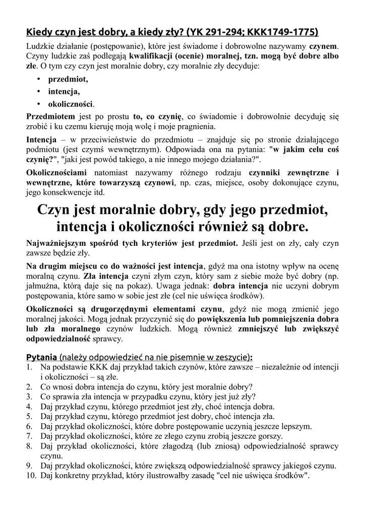 Kiedy czyn jest dobry, a kiedy zły? (YK 291-294; KKK1749-1775) Ludzkie działanie (postępowanie), które jest świadome i dobrowolne nazywamy czynem. Czyny ludzkie zaś podlegają kwalifikacji (ocenie) moralnej, tzn. mogą być dobre albo złe. O tym czy czyn jest moralnie dobry, czy moralnie zły decyduje: • przedmiot, • intencja, • okoliczności. Przedmiotem jest po prostu to, co czynię, co świadomie i dobrowolnie decyduję się zrobić i ku czemu kieruję moją wolę i moje pragnienia. Intencja – w przeciwieństwie do przedmiotu – znajduje się po stronie działającego podmiotu (jest czymś wewnętrznym). Odpowiada ona na pytania: "w jakim celu coś czynię?", "jaki jest powód takiego, a nie innego mojego działania?". Okolicznościami natomiast nazywamy różnego rodzaju czynniki zewnętrzne i wewnętrzne, które towarzyszą czynowi, np. czas, miejsce, osoby dokonujące czynu, jego konsekwencje itd. Czyn jest moralnie dobry, gdy jego przedmiot, intencja i okoliczności również są dobre. Najważniejszym spośród tych kryteriów jest przedmiot. Jeśli jest on zły, cały czyn zawsze będzie zły. Na drugim miejscu co do ważności jest intencja, gdyż ma ona istotny wpływ na ocenę moralną czynu. Zła intencja czyni złym czyn, który sam z siebie może być dobry (np. jałmużna, którą daje się na pokaz). Uwaga jednak: dobra intencja nie uczyni dobrym postępowania, które samo w sobie jest złe (cel nie uświęca środków). Okoliczności są drugorzędnymi elementami czynu, gdyż nie mogą zmienić jego moralnej jakości. Mogą jednak przyczynić się do powiększenia lub pomniejszenia dobra lub zła moralnego czynów ludzkich. Mogą również zmniejszyć lub zwiększyć odpowiedzialność sprawcy. Pytania (należy odpowiedzieć na nie pisemnie w zeszycie): 1. Na podstawie KKK daj przykład takich czynów, które zawsze – niezależnie od intencji i okoliczności – są złe. 2. Co wnosi dobra intencja do czynu, który jest moralnie dobry? 3. Co sprawia zła intencja w przypadku czynu, który jest już zły? 4. Daj przykład czynu, którego przedmiot jest zły, choć intencja dobra. 5. Daj przykład czynu, którego przedmiot jest dobry, choć intencja zła. 6. Daj przykład okoliczności, które dobre postępowanie uczynią jeszcze lepszym. 7. Daj przykład okoliczności, które ze złego czynu zrobią jeszcze gorszy. 8. Daj przykład okoliczności, które złagodzą (lub zniosą) odpowiedzialność sprawcy czynu. 9. Daj przykład okoliczności, które zwiększą odpowiedzialność sprawcy jakiegoś czynu. 10. Daj konkretny przykład, który ilustrowałby zasadę "cel nie uświęca środków".