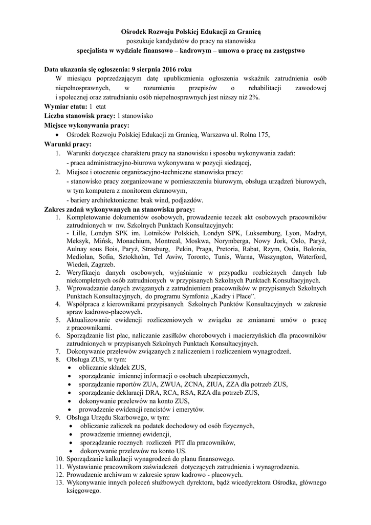 Ośrodek Rozwoju Polskiej Edukacji za Granicą poszukuje kandydatów do pracy na stanowisku specjalista w wydziale finansowo – kadrowym – umowa o pracę na zastępstwo Data ukazania się ogłoszenia: 9 sierpnia 2016 roku W miesiącu poprzedzającym datę upublicznienia ogłoszenia wskaźnik zatrudnienia osób niepełnosprawnych, w rozumieniu przepisów o rehabilitacji zawodowej i społecznej oraz zatrudnianiu osób niepełnosprawnych jest niższy niż 2%. Wymiar etatu: 1 etat Liczba stanowisk pracy: 1 stanowisko Miejsce wykonywania pracy: Ośrodek Rozwoju Polskiej Edukacji za Granicą, Warszawa ul. Rolna 175, Warunki pracy: 1. Warunki dotyczące charakteru pracy na stanowisku i sposobu wykonywania zadań: - praca administracyjno-biurowa wykonywana w pozycji siedzącej, 2. Miejsce i otoczenie organizacyjno-techniczne stanowiska pracy: - stanowisko pracy zorganizowane w pomieszczeniu biurowym, obsługa urządzeń biurowych, w tym komputera z monitorem ekranowym, - bariery architektoniczne: brak wind, podjazdów. Zakres zadań wykonywanych na stanowisku pracy: 1. Kompletowanie dokumentów osobowych, prowadzenie teczek akt osobowych pracowników zatrudnionych w nw. Szkolnych Punktach Konsultacyjnych: - Lille, Londyn SPK im. Lotników Polskich, Londyn SPK, Luksemburg, Lyon, Madryt, Meksyk, Mińsk, Monachium, Montreal, Moskwa, Norymberga, Nowy Jork, Oslo, Paryż, Aulnay sous Bois, Paryż, Strasburg, Pekin, Praga, Pretoria, Rabat, Rzym, Ostia, Bolonia, Mediolan, Sofia, Sztokholm, Tel Awiw, Toronto, Tunis, Warna, Waszyngton, Waterford, Wiedeń, Zagrzeb. 2. Weryfikacja danych osobowych, wyjaśnianie w przypadku rozbieżnych danych lub niekompletnych osób zatrudnionych w przypisanych Szkolnych Punktach Konsultacyjnych. 3. Wprowadzanie danych związanych z zatrudnieniem pracowników w przypisanych Szkolnych Punktach Konsultacyjnych, do programu Symfonia „Kadry i Płace”. 4. Współpraca z kierownikami przypisanych Szkolnych Punktów Konsultacyjnych w zakresie spraw kadrowo-płacowych. 5. Aktualizowanie ewidencji rozliczeniowych w związku ze zmianami umów o pracę z pracownikami. 6. Sporządzanie list płac, naliczanie zasiłków chorobowych i macierzyńskich dla pracowników zatrudnionych w przypisanych Szkolnych Punktach Konsultacyjnych. 7. Dokonywanie przelewów związanych z naliczeniem i rozliczeniem wynagrodzeń. 8. Obsługa ZUS, w tym: obliczanie składek ZUS, sporządzanie imiennej informacji o osobach ubezpieczonych, sporządzanie raportów ZUA, ZWUA, ZCNA, ZIUA, ZZA dla potrzeb ZUS, sporządzanie deklaracji DRA, RCA, RSA, RZA dla potrzeb ZUS, dokonywanie przelewów na konto ZUS, prowadzenie ewidencji rencistów i emerytów. 9. Obsługa Urzędu Skarbowego, w tym: obliczanie zaliczek na podatek dochodowy od osób fizycznych, prowadzenie imiennej ewidencji, sporządzanie rocznych rozliczeń PIT dla pracowników, dokonywanie przelewów na konto US. 10. Sporządzanie kalkulacji wynagrodzeń do planu finansowego. 11. Wystawianie pracownikom zaświadczeń dotyczących zatrudnienia i wynagrodzenia. 12. Prowadzenie archiwum w zakresie spraw kadrowo - płacowych. 13. Wykonywanie innych poleceń służbowych dyrektora, bądź wicedyrektora Ośrodka, głównego księgowego. Wymagania niezbędne: 1. wykształcenie średnie, wyższe, preferowane kierunki ekonomiczne, administracja, 2. minimum 5 lat stażu pracy, 3. doświadczenie w pracy w jednostkach sektora finansów publicznych, 4. dobra znajomość programu Sage Symfonia ERD Kadry i Płace, Płatnik 10.01.001, NBE NBP, 5. biegła obsługa komputera (środowisko MS Office, Excel), 6. praktyczna wiedza z zakresu Kodeksu Pracy, ubezpieczeń społecznych, podatku dochodowego od osób fizycznych i Ustawy o Finansach Publicznych, 7. umiejętność definiowania celów i priorytetów oraz organizacji pracy własnej. Wymagania dodatkowe: 1. aktualizowanie wiedzy w zakresie wykonywanych obowiązków, w tym bieżące śledzenie zmian w przepisach prawnych, 2. umiejętność korzystania z przepisów prawa i regulacji wewnętrznych Ośrodka, 3. dokładność, skrupulatność, odpowiedzialność, terminowość. Dokumenty wymagane przy składaniu aplikacji: 1. curriculum vitae (wraz z nr kontaktowym lub/i adresem e-mailowym) i list motywacyjny, 2. oświadczenie kandydata o wyrażeniu zgody na przetwarzanie danych osobowych do celów rekrutacji, 3. pisemne oświadczenie o pełnej zdolności do czynności prawnych, korzystaniu z pełni praw publicznych i o braku skazania prawomocnym wyrokiem sądu za przestępstwa popełnione umyślnie ścigane z oskarżenia publicznego lub umyślne przestępstwo skarbowe, 4. kopie dokumentów potwierdzających wykształcenie, uzyskane kwalifikacje, 5. w przypadku osób nieposiadających obywatelstwa polskiego - kopia dokumentu potwierdzającego znajomość języka polskiego, potwierdzona stosownym dokumentem, 6. kopia dokumentu potwierdzającego niepełnosprawność – w przypadku kandydatów, którzy zamierzają skorzystać z pierwszeństwa w zatrudnieniu, w przypadku, gdy znajdą się w gronie najlepszych kandydatów, 7. kopie dokumentów potwierdzających wymagany staż pracy. Dokumenty należy składać do dnia 23 sierpnia 2016 roku włącznie (do godziny 16:00), osobiście lub pocztą na adres: Ośrodek Rozwoju Polskiej Edukacji za Granicą 02-729 Warszawa, ul. Rolna 175 z dopiskiem „Rekrutacja do wydziału finansowo – kadrowego” Dopuszczalne jest również złożenie skanów ww. dokumentów na adres poczty elektronicznej: [email protected] Informacje dodatkowe: 1. oświadczenia muszą być podpisane własnoręcznie, 2. oferty złożone po terminie (decyduje data stempla pocztowego) lub niezawierające wszystkich dokumentów wymienionych w „wymaganych dokumentach i oświadczeniach”, zostaną odrzucone, 3. w przypadku przedstawienia dokumentów w języku obcym należy dołączyć również ich tłumaczenie na język polski dokonane przez tłumacza przysięgłego, 4. oferty nadesłane, z wyjątkiem oferty w