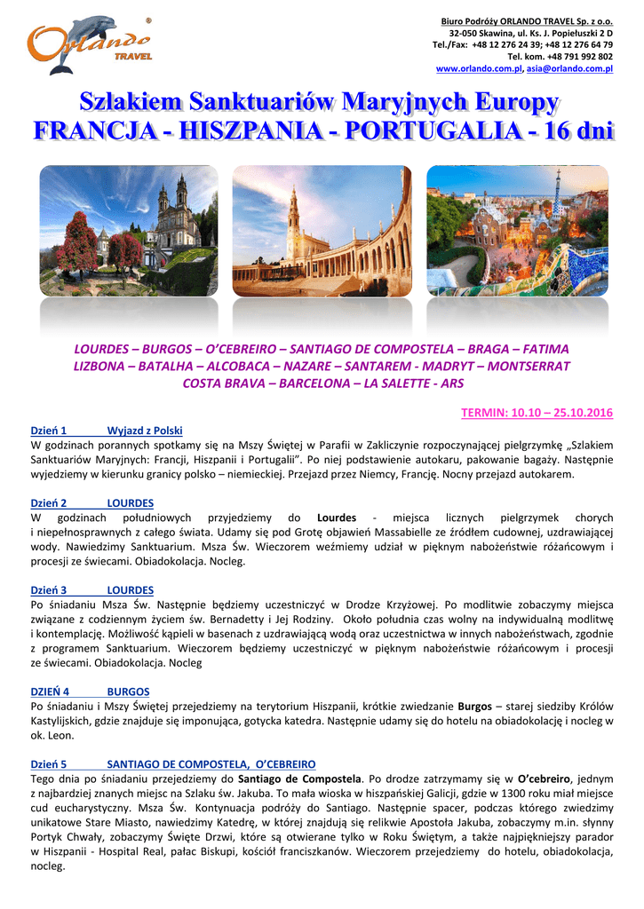 Biuro Podróży ORLANDO TRAVEL Sp. z o.o. 32-050 Skawina, ul. Ks. J. Popiełuszki 2 D Tel./Fax: +48 12 276 24 39; +48 12 276 64 79 Tel. kom. +48 791 992 802 www.orlando.com.pl, [email protected] LOURDES – BURGOS – O’CEBREIRO – SANTIAGO DE COMPOSTELA – BRAGA – FATIMA LIZBONA – BATALHA – ALCOBACA – NAZARE – SANTAREM - MADRYT – MONTSERRAT COSTA BRAVA – BARCELONA – LA SALETTE - ARS TERMIN: 10.10 – 25.10.2016 Dzieo 1 Wyjazd z Polski W godzinach porannych spotkamy się na Mszy Świętej w Parafii w Zakliczynie rozpoczynającej pielgrzymkę „Szlakiem Sanktuariów Maryjnych: Francji, Hiszpanii i Portugalii”. Po niej podstawienie autokaru, pakowanie bagaży. Następnie wyjedziemy w kierunku granicy polsko – niemieckiej. Przejazd przez Niemcy, Francję. Nocny przejazd autokarem. Dzieo 2 LOURDES W godzinach południowych przyjedziemy do Lourdes - miejsca licznych pielgrzymek chorych i niepełnosprawnych z całego świata. Udamy się pod Grotę objawieo Massabielle ze źródłem cudownej, uzdrawiającej wody. Nawiedzimy Sanktuarium. Msza Św. Wieczorem weźmiemy udział w pięknym nabożeostwie różaocowym i procesji ze świecami. Obiadokolacja. Nocleg. Dzieo 3 LOURDES Po śniadaniu Msza Św. Następnie będziemy uczestniczyd w Drodze Krzyżowej. Po modlitwie zobaczymy miejsca związane z codziennym życiem św. Bernadetty i Jej Rodziny. Około południa czas wolny na indywidualną modlitwę i kontemplację. Możliwośd kąpieli w basenach z uzdrawiającą wodą oraz uczestnictwa w innych nabożeostwach, zgodnie z programem Sanktuarium. Wieczorem będziemy uczestniczyd w pięknym nabożeostwie różaocowym i procesji ze świecami. Obiadokolacja. Nocleg DZIEO 4 BURGOS Po śniadaniu i Mszy Świętej przejedziemy na terytorium Hiszpanii, krótkie zwiedzanie Burgos – starej siedziby Królów Kastylijskich, gdzie znajduje się imponująca, gotycka katedra. Następnie udamy się do hotelu na obiadokolację i nocleg w ok. Leon. Dzieo 5 SANTIAGO DE COMPOSTELA, O’CEBREIRO Tego dnia po śniadaniu przejedziemy do Santiago de Compostela. Po drodze zatrzymamy się w O’cebreiro, jednym z najbardziej znanych miejsc na Szlaku św. Jakuba. To mała wioska w hiszpaoskiej Galicji, gdzie w 1300 roku miał miejsce cud eucharystyczny. Msza Św. Kontynuacja podróży do Santiago. Następnie spacer, podczas którego zwiedzimy unikatowe Stare Miasto, nawiedzimy Katedrę, w której znajdują się relikwie Apostoła Jakuba, zobaczymy m.in. słynny Portyk Chwały, zobaczymy Święte Drzwi, które są otwierane tylko w Roku Świętym, a także najpiękniejszy parador w Hiszpanii - Hospital Real, pałac Biskupi, kościół franciszkanów. Wieczorem przejedziemy do hotelu, obiadokolacja, nocleg. Biuro Podróży ORLANDO TRAVEL Sp. z o.o. 32-050 Skawina, ul. Ks. J. Popiełuszki 2 D Tel./Fax: +48 12 276 24 39; +48 12 276 64 79 Tel. kom. +48 791 992 802 www.orlando.com.pl, [email protected] Dzieo 6 BRAGA, FATIMA W godzinach rannych po śniadaniu i Mszy Świętej wyjedziemy z hotelu i zatrzymamy się w niezwykle urokliwym miejscu – Bradze, gdzie nawiedzimy Sanktuarium Dobrego Jezusa na Górze. Następnie przyjedziemy do Sanktuarium i miejsca objawieo w Fatimie, podczas, których Matka Boska przekazała dzieciom trzy tajemnice fatimskie, nawiedzimy: Kaplicę Objawieo, Bazylikę Matki Boskiej Różaocowej z grobami Łucji, Franciszka i Hiacynty, Bazylikę Trójcy Świętej oraz zobaczymy Pomnik Jana Pawła II. Obiadokolacja. Nocleg. DZIEO 7 LIZBONA Rano po śniadaniu i Mszy Świętej udamy się do Lizbony. Zobaczymy najważniejszy i zarazem najpiękniejszy zabytek Lizbony - manuelioski klasztor Hieronimitów. Zobaczymy słynną wieżę Belem i pomnik Odkrywców. Następnie urokliwymi uliczkami starej Lizbony podejdziemy do: Kościoła p/w. Św. Antoniego (gdzie urodził się św. Antoni). Następnie przejdziemy do Katedry Se z relikwiami św. Wincentego (patrona Lizbony) oraz zamku św. Jerzego, skąd roztacza się wspaniała panorama na całą stolicę Portugalii. W godzinach wieczornych przejedziemy do hotelu w Fatimie, obiadokolacja. Po kolacji weźmiemy udział w pięknym Nabożeostwie Różaocowym na placu przed bazylika Fatimską. Nocleg. Dzieo 8 ALJUSTREL, ALCOBACA, NAZARE, SANTAREM Rano po śniadaniu i Mszy Świętej udamy się do Aljustrel, miasteczka, gdzie znajdują się domy dzieci Hiacynty, Franciszka i Łucji. Następnie udamy się do Alcobaca, w której zwiedzimy klasztor Santa Maria wpisany na listę Światowego Dziedzictwa UNESCO. Po czym przejedziemy do Nazare. Jest to niewielkie, urokliwe, portugalskie miasteczko leżące między skalistym wybrzeżem. Na urwistym brzegu, nad miastem, zbudowano małą wioskę Sitio. Największą budowlą jest tu piękny kościół Matki Boskiej z Nazare. Bazylika ta słynie z cudownej figurki N.M.P. oraz wielu cudów. Miejscowośd słynie również z szerokiego pasa żółtej plaży. Na koniec dnia przejedziemy do Santarem, miejsca gdzie w niewielkim kościółku przechowywana jest relikwia Cudu Eucharystycznego. Wieczorem powrócimy do Fatimy na obiadokolację. Następnie zapraszamy na wieczorne nabożeostwo ze świecami. Nocleg. Dzieo 9 MADRYT Po śniadaniu Msza św. w Fatimie. Następnie wykwaterowanie z hotelu i przejazd do Madrytu – od XVI w. stolicy Hiszpanii. W programie krótki spacer po mieście. Zobaczymy Plaza Mayor, Katedrę i Pałac Królewski. W godzinach wieczornych przejedziemy do hotelu w ok. Madrytu. Obiadokolacja. Nocleg. Dzieo 10 MONTSERRAT, COSTA BRAVA Wcześnie rano po śniadaniu wyruszymy w kierunku Katalonii na wzgórze Montserrat, miejsca gdzie czczona jest niewielka figurka Madonny, nazwana La Moreneta. Msza Święta. Następnie przejedziemy na Costa Brava. Zakwaterowanie w hotelu, obiadokolacja, nocleg. Dzieo 11 BARCELONA Rano śniadanie, nastepnie wyjedziemy do Barcelony, stolicy Katalonii, w której tworzył swe dzieła znakomity artysta – Antonio Gaudi. Zobaczymy słynną Sagradę Familię, a także najpiękni