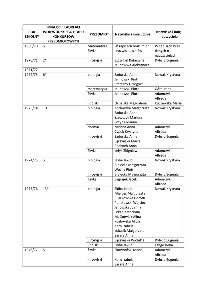 FINALIŚCI I LAUREACI ROK WOJEWÓDZKIEGO ETAPU PRZEDMIOT SZKOLNY KONKURSÓW PRZEDMIOTOWYCH 1969/70 6 Matematyka fizyka 1970/71 2* j. rosyjski 1971/72 1972/73 6* biologia matematyka fizyka 1973/74 10 j.polski biologia chemia j. rosyjski fizyka 1974/75 5 biologia j. rosyjski fizyka 1975/76 1976/77 13* biologia 5 j. rosyjski j.polski fizyka j. rosyjski Nazwisko i imię ucznia W zapisach brak imion i nazwisk uczniów Szczygieł Katarzyna Jelinowska Aleksandra Sadurska Anna Jelinowski Piotr Szczęsny Grzegorz Jelinowski Piotr Jelinowski Piotr Ochalska Magdalena Kozłowska Małgorzata Sadurska Anna Szewczyk Mariusz Fotyna Joanna Michna Anna Cypek Krystyna Sadurska Anna Sączyńska Marta Rodzoch Anna Łełyk Zbigniew Skiba Jakub Bielecka Małgorzata Woźny Piotr Bielecka Małgorzata Zagrajek Jacek Skiba Jakub Miełgeś Małgorzata Ruszkowska Dorota Pentkowski Wojciech Janowska Joanna Lekan Katarzyna Maćkowiak Alina Kozłowska Alicja Kern Izabela Łukasik Małgorzata Sarara Anna Sączyńska Wioletta Skiba Jakub Skowroński Maciej Kern Izabela Sarara Anna Nazwisko i imię nauczyciela W zapisach brak danych o nauczycielach Dybcio Eugenia Nowak Krystyna Góra Irena Adamczyk Alfreda Kuczewska Maria Nowak Krystyna Adamczyk Alfreda Dybcio Eugenia Adamczyk Alfreda Nowak Krystyna Dybcio Eugenia Adamczyk Alfreda Nowak Krystyna Dybcio Eugenia Lange Irena Adamczyk Alfreda Dybcio Eugenia 1977/78 6 chemia Kern Izabela j.polski biologia Maćkowiak Alina Gejzak Anna Nowacka Małgorzata Gawda Beata Gajek Paweł geografia fizyka 1978/79 5* 1979/80 3* 1980/81 10* zaj. praktyczno techniczne j. rosyjski biologia j.polski j. rosyjski zaj. praktyczno techniczne fizyka Gawda Beata Lewicka Teresa Adamczyk Alfreda Szewc Stanisława Sadura Małgorzata Terelak Barbara Frydecka Barbara Terelak Barbara Ciećko Maria Dybcio Eugenia Nowak Krystyna Frydecka Janina Dybcio Eugenia Szewc Stanisława Osiak Cezariusz matematyka fizyka Leszek Paweł Leszek Paweł j. rosyjski biologia Adamowicz Dorota Sobolewska Anna Brzezińska Renata Bojarska Ewa Dybcio Justyna Gołembiewska Justyna Krawiec Kinga Drzewowski Piotr Adamczyk Alfreda Góra Irena Adamczyk Alfreda Dybcio Eugenia Nowak Krystyna j. rosyjski j.polski zaj. praktyczno techniczne fizyka Leszek Ewa Jurzysta Sławomir Kłys Joanna Zagrajek Agnieszka Witczak Agnieszka Witczak Agnieszka Moniak Barbara Osiak Gerard Poniedziałek Ireneusz Lis Iwona Witczak Hanna Sułek Kinga Łyszcz Anna Jaszak Sławomira Kłos Dorota 2* biologia 1982/83 1983/84 1 5* biologia biologia matamatyka 7 Leszek Ewa matematyka chemia 1981/82 1984/85 Adamczyk Alfreda Kopciał Cecylia Nowak Krystyna j. rosyjski biologia Dybcio Eugenia Frydecka Janina Jednacz Stanisław Adamczyk Alfreda Góra Irena Adamczyk Alfreda Nowak Krystyna Nowak Krystyna Nowak Krystyna Lichota Alicja Góra Irena Dybcio Eugenia Nowak Krystyna 1985/86 1986/87 8 11 j. polski zaj. praktyczno techniczne biologia Dybcio Arkadiusz Markowski Grzegorz Konarska Maria Potocki Arkadiusz Nowak Krystyna j. rosyjski chemia Czezyk Barbara Drzewowska Joanna Witczak Hanna Żegarski Mariusz Łyjak Magdalena Żyłka Paweł fizyka technika Chodowa Tomasz Krawczyk Tomasz j. polski Drzewowska Joanna Pawelec Lidia Krawczak Wioletta Markiewicz Monika Góra Katarzyna Włosek Jacek Kozak Izabela Kozak Izabela Polak Izabela Wilanowska Monika Mazur Elżbieta Polkowska Monika Koral Agnieszka Dymińska Katarzyna Sawa Małgorzata Łyjak Marcin Adamiak Aneta Sobolewski Grzegorz Korycińska Anna Janoszczyk Ewa Maćkowiak Anna Filipiak Małgorzata Mazurek Karina Goliszek Iwona Petniak Edyta Myślińska Dorota Malinowska Joanna Błoch Monika Czuchryta Jolanta Lenartowicz Elżbieta Łyjak Marcin Ościsłowska Monika Janoszczyk Ewa Kowalczyk Anna Wrona Paweł Korycińska Anna Kowalczyk Anna fizyka matematyka j. rosyjski 1987/88 7 biologia historia 1988/89 24* biologia historia j. polski fizyka matematyka Dybcio Eugenia Adamczyk Alfreda Nowak Andrzej Chmurzyńska Jadwiga Frydecka Janina Nowak Andrzej Góra Irena Dybcio Eugenia Nowak Krystyna Jastrzębska Zdzisława Nowak Krystyna Jastrzębska Zdzisława Łagowska Maria Nowak Andrzej Lichota Alicja chemia 1989/90 8 j. rosyjski matematyka j. polski historia chemia 1990/91 8 biologia j.polski Wikos Małgorzata Apps Elizabeth Rolla Michal Góra Katarzyna Wójcik Edyta Marchalewska Agnieszka Pietruch Mikołaj Pietruch Mikołaj Hałaś Grzegorz Wrona Maciej Kordybach Krzysztof Żak Patrycja Szymanek Magdalena matematyka technika Szeleźniak Michał Matras Marek biologia Gędek Aneta historia Kosmala Michał Młynarczyk Anna Kordybach Maria fizyka j.rosyjski biologia j. rosyjski matematyka fizyka 1991/92 1992/93 1993/94 1994/95 1 3 4 geografia 1995/96 1996/97 5 Kuś Jacek Terelak Katarzyna Kuś Jacek Kowalczyk Anna Harasim Katarzyna Pietruch Mikołaj Kosik Urszula Mazurek Karina Mazurek Karina matematyka Pluta Łukasz Kołodziej Maciej Śmiarowski Piotr Komorek Paweł 1997/98 6 biologia Kołodziej Maciej fizyka geografia Pluta Łukasz Księżak Bartłomiej Kołodziej Maciej j.polski Pluta Łukasz Cybulak Aleksandra Adamczyk Alfreda Dybcio Eugenia Lichota Alicja Konarska Maria Jastrzębska Zdzisława Adamczyk Alfreda Nowak Andrzej Dybcio Eugenia Nowak Krystyna Dybcio Eugenia Lichota Alicja Nowak Andrzej Kitka Krzysztof Zwolan (Wojdylo) Alicja Hampel Jacek Choroszyńska Jadwiga Szlichtyng (Bielawska ) Ewa Dankowska Elżbieta Radziwiłko Elżbieta Lichota Alicja Szymanek Małgorzata Kozłowska Bogusława Szlichtyng (Bielawska ) Ewa Księżak Beata Radziwiłko Elżbieta Zwolan (Wojdylo) Alicja Mazur Alina 1998/99 3 matematyka fizyka matematyka 1999/00 6 matematyka j.polski 2000/01 2001/02 2002/03 2003/04 2004/05 2005/06 2006/07 2007/08 2008/09 3 2 2 fizyka Konkurs matematyczno - przyrodniczy Pluta Łukasz Pawłowska Magdalena Mańko Anna Komorek Tomasz Wielgo Krzysztof Grądziel Olga Stasiak Krzysztof Grądziel Olga Jankowski Andrzej Stasiak Krzysztof Oleksiak Anna j. polski Misiurek Katarzyna Trawińska Agnieszka historia Bednarski M