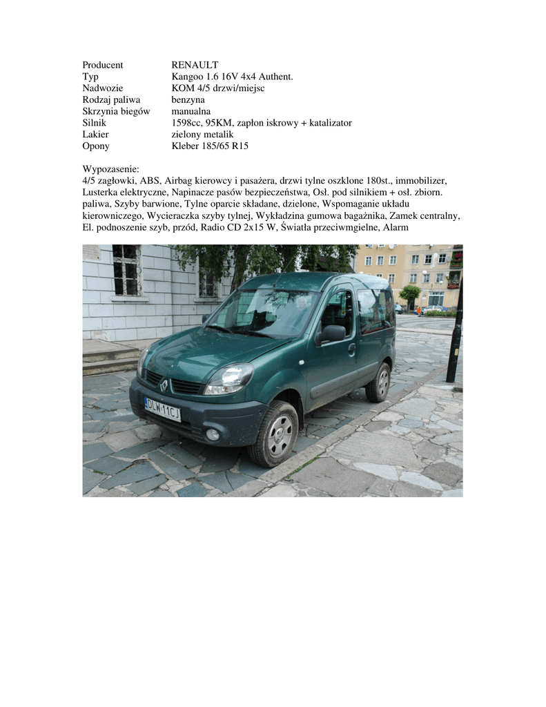 Producent Typ Nadwozie Rodzaj paliwa Skrzynia biegów Silnik Lakier Opony RENAULT Kangoo 1.6 16V 4x4 Authent. KOM 4/5 drzwi/miejsc benzyna manualna 1598cc, 95KM, zapłon iskrowy + katalizator zielony metalik Kleber 185/65 R15 Wypozasenie: 4/5 zagłowki, ABS, Airbag kierowcy i pasażera, drzwi tylne oszklone 180st., immobilizer, Lusterka elektryczne, Napinacze pasów bezpieczeństwa, Osł. pod silnikiem + osł. zbiorn. paliwa, Szyby barwione, Tylne oparcie składane, dzielone, Wspomaganie układu kierowniczego, Wycieraczka szyby tylnej, Wykładzina gumowa bagażnika, Zamek centralny, El. podnoszenie szyb, przód, Radio CD 2x15 W, Światła przeciwmgielne, Alarm