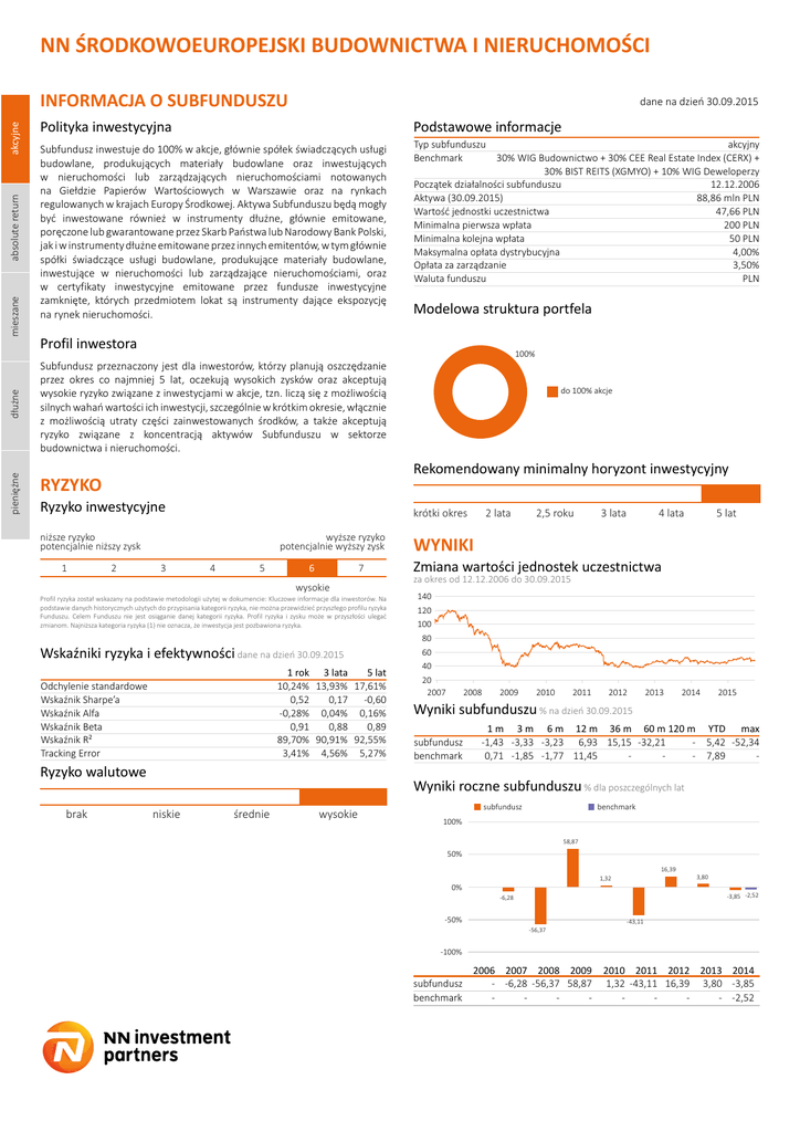 NN ŚRODKOWOEUROPEJSKI BUDOWNICTWA I NIERUCHOMOŚCI mieszane absolute return akcyjne INFORMACJA O SUBFUNDUSZU dane na dzień 30.09.2015 Polityka inwestycyjna Podstawowe informacje Subfundusz inwestuje do 100% w akcje, głównie spółek świadczących usługi budowlane, produkujących materiały budowlane oraz inwestujących w nieruchomości lub zarządzających nieruchomościami notowanych na Giełdzie Papierów Wartościowych w Warszawie oraz na rynkach regulowanych w krajach Europy Środkowej. Aktywa Subfunduszu będą mogły być inwestowane również w instrumenty dłużne, głównie emitowane, poręczone lub gwarantowane przez Skarb Państwa lub Narodowy Bank Polski, jak i w instrumenty dłużne emitowane przez innych emitentów, w tym głównie spółki świadczące usługi budowlane, produkujące materiały budowlane, inwestujące w nieruchomości lub zarządzające nieruchomościami, oraz w certyfikaty inwestycyjne emitowane przez fundusze inwestycyjne zamknięte, których przedmiotem lokat są instrumenty dające ekspozycję na rynek nieruchomości. Typ subfunduszu akcyjny Benchmark 30% WIG Budownictwo + 30% CEE Real Estate Index (CERX) + 30% BIST REITS (XGMYO) + 10% WIG Deweloperzy Początek działalności subfunduszu 12.12.2006 Aktywa (30.09.2015) 88,86 mln PLN Wartość jednostki uczestnictwa 47,66 PLN Minimalna pierwsza wpłata 200 PLN Minimalna kolejna wpłata 50 PLN Maksymalna opłata dystrybucyjna 4,00% Opłata za zarządzanie 3,50% Waluta funduszu PLN Modelowa struktura portfela pieniężne dłużne Profil inwestora 100% Subfundusz przeznaczony jest dla inwestorów, którzy planują oszczędzanie przez okres co najmniej 5 lat, oczekują wysokich zysków oraz akceptują wysokie ryzyko związane z inwestycjami w akcje, tzn. liczą się z możliwością silnych wahań wartości ich inwestycji, szczególnie w krótkim okresie, włącznie z możliwością utraty części zainwestowanych środków, a także akceptują ryzyko związane z koncentracją aktywów Subfunduszu w sektorze budownictwa i nieruchomości. Rekomendowany minimalny horyzont inwestycyjny RYZYKO Ryzyko inwestycyjne krótki okres niższe ryzyko potencjalnie niższy zysk 1 2 wyższe ryzyko potencjalnie wyższy zysk 3 4 5 6 7 wysokie Profil ryzyka został wskazany na podstawie metodologii użytej w dokumencie: Kluczowe informacje dla inwestorów. Na podstawie danych historycznych użytych do przypisania kategorii ryzyka, nie można przewidzieć przyszłego profilu ryzyka Funduszu. Celem Funduszu nie jest osiąganie danej kategorii ryzyka. Profil ryzyka i zysku może w przyszłości ulegać zmianom. Najniższa kategoria ryzyka (1) nie oznacza, że inwestycja jest pozbawiona ryzyka. Wskaźniki ryzyka i efektywności dane na dzień 30.09.2015 1 rok 3 lata 5 lat 10,24% 13,93% 17,61% 0,52 0,17 -0,60 -0,28% 0,04% 0,16% 0,91 0,88 0,89 89,70% 90,91% 92,55% 3,41% 4,56% 5,27% Odchylenie standardowe Wskaźnik Sharpe’a Wskaźnik Alfa Wskaźnik Beta Wskaźnik R² Tracking Error Ryzyko walutowe brak do 100% akcje 2 lata 2,5 roku 3 lata 4 lata 5 lat WYNIKI Zmiana wartości jednostek uczestnictwa za okres od 12.12.2006 do 30.09.2015 140 120 100 80 60 40 20 2007 2008 2009 2010 2011 2012 2013 2014 2015 Wyniki subfunduszu % na dzień 30.09.2015 subfundusz benchmark 1 m 3 m 6 m 12 m 36 m 60 m 120 m -1,43 -3,33 -3,23 6,93 15,15 -32,21 0,71 -1,85 -1,77 11,45 - YTD max 5,42 -52,34 7,89 - Wyniki roczne subfunduszu % dla poszczególnych lat niskie średnie wysokie subfundusz benchmark 100% 58,87 50% 16,39 3,80 1,32 0% -3,85 -2,52 -6,28 -50% -43,11 -56,37 -100% subfundusz benchmark 2006 2007 2008 2009 - -6,28 -56,37 58,87 - 2010 2011 2012 2013 2014 1,32 -43,11 16,39 3,80 -3,85 - -2,52 SKŁAD PORTFELA Alokacja instrumentów finansowych dane na dzień 30.09.2015 nazwa Akcje Gotówka i lokaty skorygowane o saldo należności i zobowiązań udział w portfelu 96,66% 3,34% Otwarte pozycje walutowe dane na dzień 30.09.2015 nazwa PLN TRY EUR udział w portfelu 67,59% 24,56% 7,85% Alokacja sektorowa dane na dzień 30.09.2015 nazwa Nieruchomości Budownictwo Finanse Surowce Spółki przemysłowe Spółki konsumenckie inne udział w portfelu 47,15% 39,28% 5,08% 2,69% 1,52% 0,93% 3,34% Największe pozycje w portfelu wg sprawozdania finansowego z dnia 30.06.2015 nazwa Emlak Konut Gayrimenkul Yatirim Ortak a.s. ECHO Investment S.A. Budimex S.A. Is Gayrimenkul Yatirim Ortakligi a.s. Środki pieniężne Globe Trade Centre S.A. Dom Development S.A. Unibep S.A. LC Corp S.A. WZ0118 udział w portfelu 9,39% 7,68% 6,59% 6,02% 5,43% 4,77% 4,73% 3,92% 3,92% 3,65% Alokacja geograficzna dane na dzień 30.09.2015 nazwa Polska Turcja Austria Jersey Holandia udział w portfelu 66,41% 24,41% 4,41% 3,82% 0,96% ZARZĄDZAJĄCY FUNDUSZEM Michał Kopiczyński Dyrektor Zespołu Zespół Zarządzania Instrumentami Udziałowymi 20 lat w branży Marcin Szortyka Starszy Zarządzający Funduszami Zespół Zarządzania Instrumentami Udziałowymi 11 lat w branży SŁOWNIK Odchylenie standardowe to jedna z bardziej popularnych miar statystycznych, pokazująca jak bardzo całkowite zyski funduszu zmieniały się w przeszłości. Im wyższe odchylenie standardowe, tym wyższe ryzyko towarzyszące inwestycji w jednostkę funduszu. R², czyli kwadrat współczynnika korelacji liniowej Pearsona, to jedna z bardziej popularnych miar statystycznych, pokazująca stopień dopasowania serii danych do wzorca. Wskaźnik Sharpe’a opisuje jak dobrze osiągnięta stopa zwrotu wynagradza inwestora za podjęte przez niego ryzyko inwestowania w walory ryzykowne. Parametr umożliwia jednoczesną maksymalizację zysku oraz minimalizację ryzyka, co można osiągnąć przez wybór funduszu o największej dodatniej wartości wskaźnika. Alfa to miara wskazująca możliwość i skalę zmiany ceny badanego instrumentu przy założeniu, że wartość benchmarku nie ulega zmianie. Alfa może przyjmować zarówno wartości dodatnie, ale również wartości ujemne. Beta to miara wskazująca wrażliwo