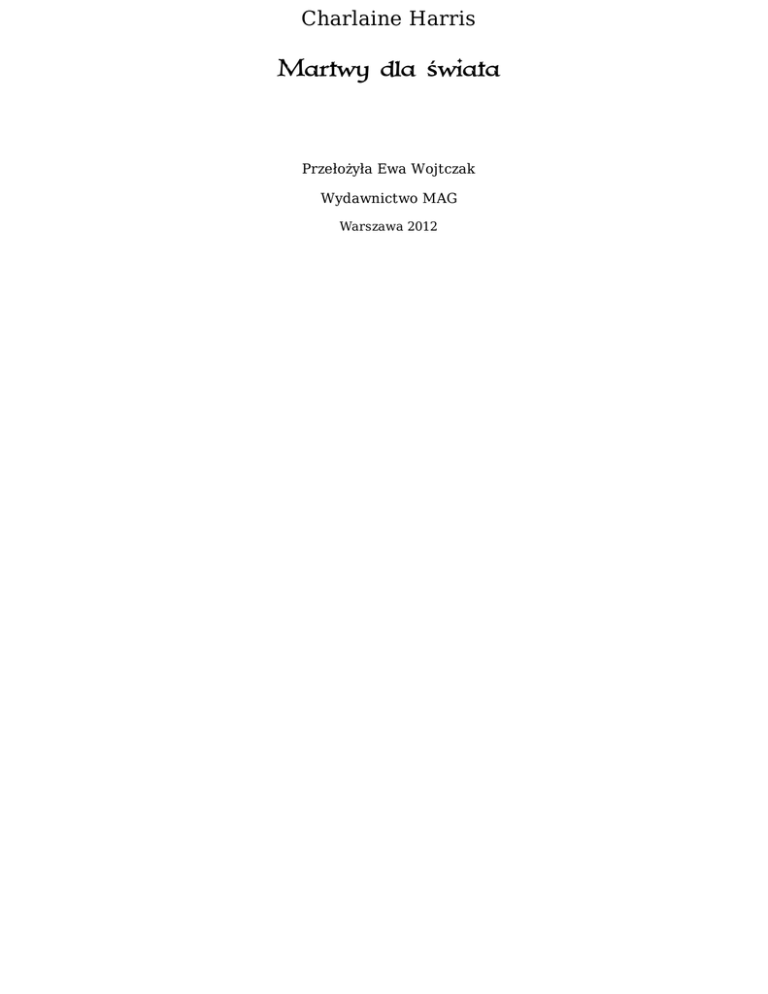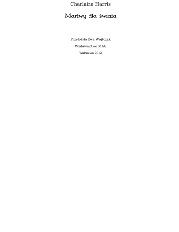 Charlaine Harris Martwy dla świata Przełożyła Ewa Wojtczak Wydawnictwo MAG Warszawa 2012 Niniejsza darmowa publikacja zawiera jedynie fragment pełnej wersji całej publikacji. Aby przeczytać ten tytuł w pełnej wersji kliknij tutaj. Niniejsza publikacja może być kopiowana, oraz dowolnie rozprowadzana tylko i wyłącznie w formie dostarczonej przez NetPress Digital Sp. z o.o., operatora sklepu na którym można nabyć niniejszy tytuł w pełnej wersji. Zabronione są jakiekolwiek zmiany w zawartości publikacji bez pisemnej zgody NetPress oraz wydawcy niniejszej publikacji. Zabrania się jej od-sprzedaży, zgodnie z regulaminem serwisu. Pełna wersja niniejszej publikacji jest do nabycia w sklepie internetowym Bookarnia Online. Tytuł oryginału: Dead to the World Copyright © 2004 by Charlaine Harris Copyright for the Polish translation © 2010 by Wydawnictwo MAG Redakcja: Joanna Figlewska Korekta: Urszula Okrzeja Ilustracja na okładce: Wojciech Zwoliński Opracowanie graficzne okładki: Piotr Chyliński Projekt typograficzny, skład i łamanie: Tomek Laisar Fruń ISBN 978-83-7480-326-7 Wydanie II Wydawca: Wydawnictwo MAG ul. Krypska 21 m. 63, 04-082 Warszawa tel./fax 22 813 47 43 e-mail: [email protected] www.mag.com.pl Konwersja: NetPress Digital Sp. z o.o. Chociaż te osoby prawdopodobnie nigdy nie przeczytają mojej powieści, dedykuję ją wszystkim trenerom – bejsbolu, futbolu, siatkówki i piłki nożnej – którzy pracowali przez wiele lat, często bez dodatkowego wynagrodzenia, nakłaniając moje dzieci do uprawiania sportu i wpajając im zasady gry. Niech Bóg błogosławi Was wszystkich. Przyjmijcie podziękowania od jednej z wielu matek tłoczących się na trybunach mimo deszczu, chłodu, upału i natrętnych komarów. Matka ta zastanawia się jednak, kto jeszcze może oglądać nocne gry. Dziękuję wiccanom, którzy odpowiedzieli na moje wezwanie i podali mi nawet więcej informacji, niż mogłam wykorzystać: Marii Limie, Sandilee Lloyd, Holly Nelson, Jean Hontz. I M.R. „Murv” Sellars. Jestem dłużna również podziękowania innym specjalistom z różnych dziedzin: Kevinowi Ryerowi, który wie więcej o dzikich świniach niż większość osób o trzymanych w domu zwierzątkach, dr D.P. Lyle'owi, który chętnie odpowiadał mi na pytania dotyczące kwestii medycznych, oraz, oczywiście, Doris Ann Norris, chodzącej encyklopedii gwiazd. Jeśli popełniłam błędy, wykorzystując informacje, którymi ci dobrzy ludzie podzielili się ze mną, ze wszystkich sił postaram się udowodnić, że nie ma w tych omyłkach mojej winy. Liścik znalazłam na drzwiach, gdy wróciłam do domu z pracy. Miałam tego dnia w „Merlotcie” zmianę od lunchu do wczesnego wieczoru, ale że był koniec grudnia, zmierzch zapadał wcześnie. Widząc liścik, wiedziałam, że Bill, kiedyś mój chłopak – czyli Bill Compton, zwany przez większość stałych klientów baru Wampirem Billem – zostawił go nie dawniej niż godzinę temu. Bill nie wychodzi przecież na dwór przed zmrokiem. Nie widziałam go od ponad tygodnia, a nie rozstaliśmy się w przyjaznej atmosferze. Gdy dotknęłam teraz koperty z moim imieniem, poczułam się naprawdę kiepsko. Przyszłoby wam do głowy, że chociaż skończyłam już dwadzieścia sześć lat, nigdy wcześniej nie miałam „byłego chłopaka”? Cóż, taka jednak była właśnie prawda. Normalni faceci nie chcą się umawiać z takimi dziwnymi dziewczynami jak ja. A przecież, odkąd zaczęłam chodzić do szkoły, ludzie mawiają, że jestem stuknięta. I mają, niestety, trochę racji. Nie powiem, podczas mojej pracy w barze od czasu do czasu któryś próbuje mnie obmacywać. Mężczyźni upijają się, a ponieważ wyglądam nieźle, zapominają o swoich obawach związanych z moją reputacją osoby dziwacznej i o moim osobliwym, stale obecnym uśmiechu. Ale tylko Billa dopuściłam naprawdę blisko do siebie. Dlatego nasze zerwanie tak bardzo mnie zraniło. Z otwarciem koperty czekałam, aż usiądę przy starym kuchennym stole o porysowanym blacie. Wciąż miałam na sobie płaszcz, zdjęłam jedynie rękawiczki. Najdroższa Sookie, chciałem przyjść pomówić z Tobą, kiedy nieco wydobrzejesz po przykrych wydarzeniach z ostatniego miesiąca. „Przykrych wydarzeniach”?! Też coś! Sińce w końcu wprawdzie zbladły, lecz kolano nadal bolało mnie w chłodne dni i podejrzewałam, że już zawsze będzie mi doskwierało. Dodam, że wszystkie obrażenia odniosłam, ratując mojego niewiernego chłopaka uwięzionego przez grupę wampirów, wśród których znalazła się jego dawna flama, Lorena. Nie wiedziałam jeszcze, dlaczego Bill tak bardzo durzył się w owej Lorenie, że natychmiast odpowiedział na jej wezwanie i udał się do Missisipi. Masz prawdopodobnie wiele pytań dotyczących tego, co się zdarzyło. Cholerna racja! Jeśli pragniesz pomówić ze mną osobiście, podejdź do frontowych drzwi i wpuść mnie. O, rany! Tego nie przewidziałam. Rozmyślałam przez dobrą minutę i ostatecznie uznałam, że chociaż nie ufam już Billowi, nie wierzę również, by chciał mnie skrzywdzić. Wróciłam więc do frontowych drzwi, otworzyłam je i zawołałam: – W porządku, wejdź! Wyłonił się z lasu otaczającego polanę, na której stoi mój stary dom. Uprzytomniłam sobie, jak bardzo za nim tęskniłam. Bill jest barczysty, lecz szczupły, dzięki życiu spędzonemu na uprawie ziemi położonej tuż obok mojej. Z kolei latom żołnierki w służbie konfederacji, aż do śmierci w roku 1867, zawdzięcza odporność i wytrzymałość. Nos Bill ma prosty jak młodzieńcy na greckich wazach, włosy ciemnokasztanowe i przycięte tuż przy czaszce, oczy równie ciemne. Wygląda dokładnie tak samo jak w dniu, w którym się poznaliśmy. I zawsze będzie tak wyglądał. Zanim przekroczył próg, zawahał się, lecz nie wycofałam pozwolenia i usunęłam się, aby mógł przejść obok mnie. Wkroczył do utrzymanego w ide