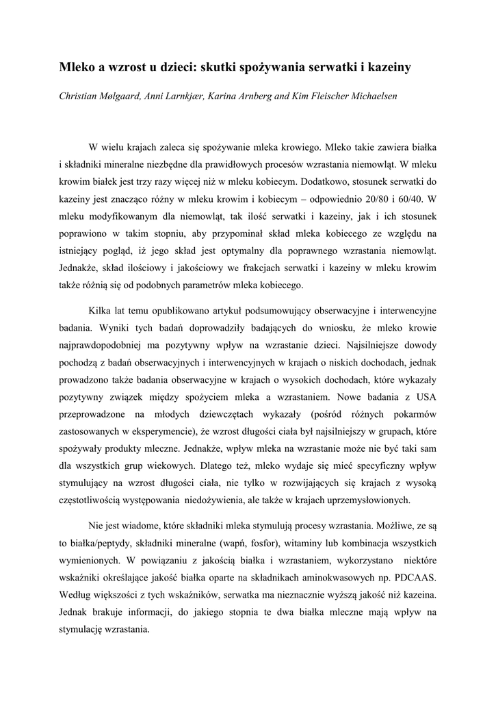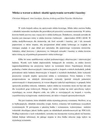Mleko a wzrost u dzieci: skutki spożywania serwatki i kazeiny Christian Mølgaard, Anni Larnkjær, Karina Arnberg and Kim Fleischer Michaelsen W wielu krajach zaleca się spożywanie mleka krowiego. Mleko takie zawiera białka i składniki mineralne niezbędne dla prawidłowych procesów wzrastania niemowląt. W mleku krowim białek jest trzy razy więcej niż w mleku kobiecym. Dodatkowo, stosunek serwatki do kazeiny jest znacząco różny w mleku krowim i kobiecym – odpowiednio 20/80 i 60/40. W mleku modyfikowanym dla niemowląt, tak ilość serwatki i kazeiny, jak i ich stosunek poprawiono w takim stopniu, aby przypominał skład mleka kobiecego ze względu na istniejący pogląd, iż jego skład jest optymalny dla poprawnego wzrastania niemowląt. Jednakże, skład ilościowy i jakościowy we frakcjach serwatki i kazeiny w mleku krowim także różnią się od podobnych parametrów mleka kobiecego. Kilka lat temu opublikowano artykuł podsumowujący obserwacyjne i interwencyjne badania. Wyniki tych badań doprowadziły badających do wniosku, że mleko krowie najprawdopodobniej ma pozytywny wpływ na wzrastanie dzieci. Najsilniejsze dowody pochodzą z badań obserwacyjnych i interwencyjnych w krajach o niskich dochodach, jednak prowadzono także badania obserwacyjne w krajach o wysokich dochodach, które wykazały pozytywny związek między spożyciem mleka a wzrastaniem. Nowe badania z USA przeprowadzone na młodych dziewczętach wykazały (pośród różnych pokarmów zastosowanych w eksperymencie), że wzrost długości ciała był najsilniejszy w grupach, które spożywały produkty mleczne. Jednakże, wpływ mleka na wzrastanie może nie być taki sam dla wszystkich grup wiekowych. Dlatego też, mleko wydaje się mieć specyficzny wpływ stymulujący na wzrost długości ciała, nie tylko w rozwijających się krajach z wysoką częstotliwością występowania niedożywienia, ale także w krajach uprzemysłowionych. Nie jest wiadome, które składniki mleka stymulują procesy wzrastania. Możliwe, ze są to białka/peptydy, składniki mineralne (wapń, fosfor), witaminy lub kombinacja wszystkich wymienionych. W powiązaniu z jakością białka i wzrastaniem, wykorzystano niektóre wskaźniki określające jakość białka oparte na składnikach aminokwasowych np. PDCAAS. Według większości z tych wskaźników, serwatka ma nieznacznie wyższą jakość niż kazeina. Jednak brakuje informacji, do jakiego stopnia te dwa białka mleczne mają wpływ na stymulację wzrastania. Badania wykazały, że białko serwatki może powodować wzrost masy mięśniowej, co może mieć pozytywny wpływ na budowę ciała dzieci. Większość badań pochodzi ze świata medycyny sportowej i przedstawia działanie w sytuacji, gdy mieszanka wolno- i szybko przyswajalnego białka mlecznego, takiego, jak w mleku krowim, jest spożywana w sytuacji silnego wysiłku w trakcie długiego treningu. Składniki serwatki mleka krowiego dają także inne pozytywne efekty – np. stymulują działanie układu odpornościowego, co w niektórych przypadkach może mieć pozytywne przełożenie na wzrastanie. Mechanizm odpowiadający za wpływ mleka i jego składników na stymulację wzrastania może brać początek w stymulacji syntezy insulinopodobnego czynnika wzrostu (IGF-I). Wykazano, że mleko, w przeciwieństwie do mięsa, stymuluje IGF-I. Jednakże, mleko wydaje się także stymulować wydzielanie insuliny, co u dzieci może mieć pozytywny wpływ na wzrastanie, jako że insulina jest hormonem anabolicznym powstrzymującym proteolizę. W niedawnym badaniu wykazano, że serwatka stymuluje głownie wydzielanie insuliny, kiedy to kazeina ma silniejszy wpływ na poziomy IGF-I. A zatem, mieszanina taka, jak w produktach pochodzących z krowiego mleka może mieć lepsze skutki dla stymulacji wydzielania IGF-I i insuliny, co prowadzi do pobudzania wzrastania. Wniosek – istnieją mocne dowody na to, że mleko stymuluje wzrost długości ciała. Mechanizm nie jest jeszcze odkryty, istnieje zatem potrzeba przeprowadzenie większej liczby badań interwencyjnych dla lepszego zrozumienia roli składników mleka w stymulacji wzrastania. Wpływ mleka na wzrost długości ciała dziecka i wzrost osoby dorosłej mogą mieć tak pozytywne, jak i negatywne długookresowe skutki. Rysunek 1 Możliwe powiązania pomiędzy spożyciem mleka, wzrastaniem i stanem zdrowia. Bibliografia: 1. Hoppe C, Molgaard C, Michaelsen KF: Cow’s milk and linear growth in industrialized and developing countries. Annu Rev Nutr 2006;26:131–173. 2. Hoppe C, Andersen GS, Jacobsen S, et al: The use of whey or skimmed milk powder in fortified blended foods for vulnerable groups. J Nutr 2008;138:145S–161S. 3. Berkey CS, Colditz GA, Rockett HR, et al: Dairy consumption and female height growth: prospective cohort study. Cancer Epidemiol Biomarkers Prev 2009;18:1881– 1887. 4. Wiley AS: Does milk make children grow? Relationships between milk consumption and height in NHANES 1999–2002. Am J Hum Biol 2005;17:425–441. 5. Hoppe C, Molgaard C, Juul A, Michaelsen KF: High intakes of skimmed milk, but not meat, increase serum IGF-I and IGFBP-3 in eight-year-old boys. Eur J Clin Nutr 2004;58:1211–1216. 6. Esterle L, Sabatier JP, Guillon-Metz F, et al: Milk, rather than other foods, is associated with vertebral bone mass and circulating IGF-1 in female adolescents. Osteoporos Int 2009;20:567–575. 7. Hoppe C, Molgaard C, Vaag A, et al: High intakes of milk, but not meat, increase sinsulin and insulin resistance in 8-year-old boys. Eur J Clin Nutr 2005;59:393–398. 8. Hoppe C, Molgaard C, Dalum C, et al: Differential effects of casein versus whey on fasting plasma levels of insulin, IGF-1 and IGF-1/IGFBP-3: results from a randomized 7-day supplementation study in prepubertal boys. Eur J Clin Nutr 2009;63:1076–1083.