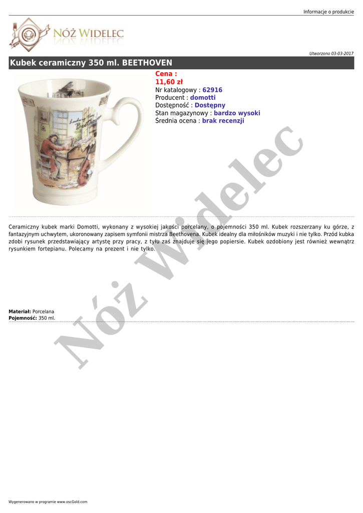 Informacje o produkcie Utworzono 03-03-2017 Kubek ceramiczny 350 ml. BEETHOVEN Cena : 11,60 zł id e le c Nr katalogowy : 62916 Producent : domotti Dostępność : Dostępny Stan magazynowy : bardzo wysoki Średnia ocena : brak recenzji W Ceramiczny kubek marki Domotti, wykonany z wysokiej jakości porcelany, o pojemności 350 ml. Kubek rozszerzany ku górze, z fantazyjnym uchwytem, ukoronowany zapisem symfonii mistrza Beethovena. Kubek idealny dla miłośników muzyki i nie tylko. Przód kubka zdobi rysunek przedstawiający artystę przy pracy, z tyłu zaś znajduje się jego popiersie. Kubek ozdobiony jest również wewnątrz rysunkiem fortepianu. Polecamy na prezent i nie tylko. N Materiał: Porcelana Pojemność: 350 ml. óż . Wygenerowano w programie www.oscGold.com