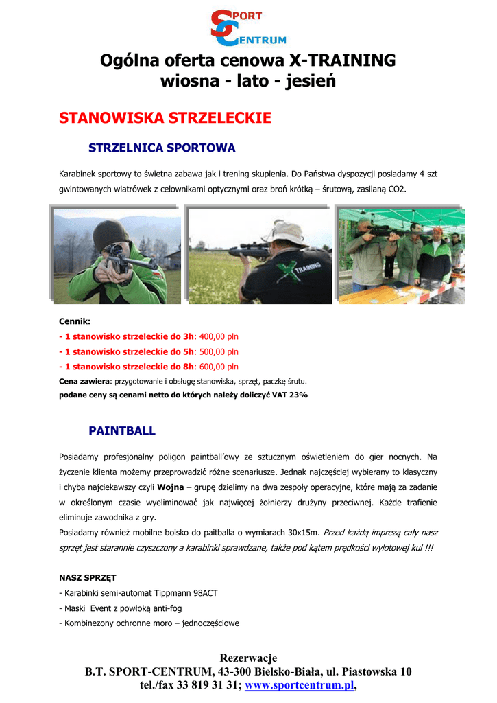 Ogólna oferta cenowa X-TRAINING wiosna - lato - jesień STANOWISKA STRZELECKIE STRZELNICA SPORTOWA Karabinek sportowy to świetna zabawa jak i trening skupienia. Do Państwa dyspozycji posiadamy 4 szt gwintowanych wiatrówek z celownikami optycznymi oraz broń krótką – śrutową, zasilaną CO2. Cennik: - 1 stanowisko strzeleckie do 3h: 400,00 pln - 1 stanowisko strzeleckie do 5h: 500,00 pln - 1 stanowisko strzeleckie do 8h: 600,00 pln Cena zawiera: przygotowanie i obsługę stanowiska, sprzęt, paczkę śrutu. podane ceny są cenami netto do których należy doliczyć VAT 23% PAINTBALL Posiadamy profesjonalny poligon paintball’owy ze sztucznym oświetleniem do gier nocnych. Na życzenie klienta możemy przeprowadzić różne scenariusze. Jednak najczęściej wybierany to klasyczny i chyba najciekawszy czyli Wojna – grupę dzielimy na dwa zespoły operacyjne, które mają za zadanie w określonym czasie wyeliminować jak najwięcej żołnierzy drużyny przeciwnej. Każde trafienie eliminuje zawodnika z gry. Posiadamy również mobilne boisko do paitballa o wymiarach 30x15m. Przed każdą imprezą cały nasz sprzęt jest starannie czyszczony a karabinki sprawdzane, także pod kątem prędkości wylotowej kul !!! NASZ SPRZĘT - Karabinki semi-automat Tippmann 98ACT - Maski Event z powłoką anti-fog - Kombinezony ochronne moro – jednoczęściowe Rezerwacje B.T. SPORT-CENTRUM, 43-300 Bielsko-Biała, ul. Piastowska 10 tel./fax 33 819 31 31; www.sportcentrum.pl, Rozgrywka paintballowa rozpoczyna się szkoleniem oraz wytłumaczeniem zasad bezpieczeństwa obowiązujących podczas gry. Następnie zespół przebiera się w stroje ochronne (moro), dostaje zabezpieczone markery i wchodzi na poligon. Na poligonie strzały próbne oraz rozdzielenie w różnych miejscach poligonu dwóch walczących ekip rozpoczynają zabawę. Grę w paintball prowadzą tylko doświadczeni i wykwalifikowani instruktorzy. Stosując się do określonych podczas szkolenia zasad paintball jest konkurencją bezpieczną. Cennik: Pakiet startowy: 65,00 pln/os Cena zawiera: wstęp na poligon w Wiśle, kombinezon ochronny, maskę, marker, 100szt amunicji. Ceny dodatkowych elementów: 0,25 pln/szt – dodatkowa amunicja, 1 500,00 pln – mobilne pole do paintballa podane ceny są cenami netto do których należy doliczyć VAT 23% STRZELNICA ŁUCZNICZA - 4 rodzaje łuków - łuk angielski - łuk sportowy - łuk bloczkowy - łuk tatarski Strzelnicę obsługują nasi wykwalifikowani instruktorzy. Stanowiska są zabezpieczone siatkami ochronnymi. Strzelnica to oddzielne stanowiska. Na 1 stanowisku może w danym momencie oddawać strzały 1 osoba. Kompletna strzelnica to 4 stanowiska. Rezerwacje B.T. SPORT-CENTRUM, 43-300 Bielsko-Biała, ul. Piastowska 10 tel./fax 33 819 31 31; www.sportcentrum.pl, Cennik: - 1 stanowisko strzeleckie do 3h: 400,00 pln - 1 stanowisko strzeleckie do 5h: 500,00 pln - 1 stanowisko strzeleckie do 8h: 600,00 pln Cena zawiera: przygotowanie i obsługę stanowiska, łuki, strzały i tarcze. podane ceny są cenami netto do których należy doliczyć VAT 23% STRZELNICA PAINTBALLOWA Strzelnicę obsługują wykwalifikowani instruktorzy. Każdy uczestnik ma okazje postrzelać z różnego rodzaju broni paintballowej do celu stałego lub ruchomego. Stanowiska są zabezpieczone siatkami ochronnymi. Strzelnica to oddzielne stanowiska. Na 1 stanowisku może w danym momencie oddawać strzały 1 osoba. Do Państwa dyspozycji 3 rodzaje broni paintballowej: - Karabin SAW Browning.50 cal - Tippmann X7 - Tacama Cennik: - 1 stanowisko strzeleckie z 1 karabinem i amunicją: 700,00 pln do 5h / pow. 800,00 pln Cena zawiera: przygotowanie i obsługę stanowiska, karabin, 2000 szt amunicji. podane ceny są cenami netto do których należy doliczyć VAT 23% Na imprezach wyjazdowych do każdego stanowiska strzeleckiego należy doliczyć koszt transportu 1,00 pln/km. Rezerwacje B.T. SPORT-CENTRUM, 43-300 Bielsko-Biała, ul. Piastowska 10 tel./fax 33 819 31 31; www.sportcentrum.pl,
