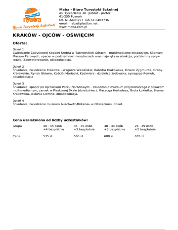 Maba - Biuro Turystyki Szkolnej os. Tysiąclecia 30 (Jubilat - parter) 61-255 Poznań tel. 61-6403797 lub 61-6403736 email:[email protected] www.maba.com.pl KRAKÓW - OJCÓW - OŚWIĘCIM Oferta: Dzień 1 Zwiedzanie Zabytkowej Kopalni Srebra w Tarnowskich Górach – multimedialne ekspozycje, Skansen Maszyn Parowych, spacer w podziemnych korytarzach oraz największa atrakcja, podziemny spływ łodzią. Zakwaterowanie, obiadokolacja. Dzień 2 Śniadanie, zwiedzanie Krakowa - Wzgórze Wawelskie, Katedra Krakowska, Dzwon Zygmunta, Groby Królewskie, Rynek Główny, Kościół Mariacki, Kazimierz - dzielnica żydowska, synagoga Remuh, obiadokolacja. Dzień 3 Śniadanie, spacer po Ojcowskim Parku Narodowym – zwiedzanie muzeum przyrodniczego z pokazem multimedialnym, zamek w Pieskowej Skale (dziedziniec), Maczuga Herkulesa, Grota Łokietka, Brama Krakowska, Jaskinia Ciemna, obiadokolacja. Dzień 4 Śniadanie, zwiedzanie muzeum Auschwitz-Birkenau w Oświęcimiu, obiad. Cena uzależniona od liczby uczestników: Powered by TCPDF (www.tcpdf.org) Grupa 40 - 45 osób +4 bezpłatnie 35 - 39 osób +3 bezpłatnie 30 - 34 osób +3 bezpłatnie 25 - 29 osób +2 bezpłatnie Cena 535 zł 560 zł 600 zł 635 zł