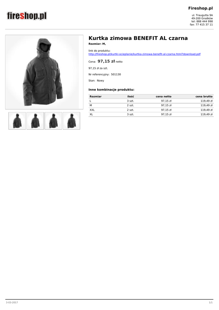 Fireshop.pl ul. Traugutta 9A 49-200 Grodków tel: 888 444 998 fax: 77 415 37 11 Kurtka zimowa BENEFIT AL czarna Rozmiar: M, link do produktu: http://fireshop.pl/kurtki-ocieplanie/kurtka-zimowa-benefit-al-czarna.html?download.pdf Cena: 97,15 zł netto 97,15 zł za szt. Nr referencyjny: 501130 Stan: Nowy Inne kombinacje produktu: 3-03-2017 Rozmiar ilość cena netto cena brutto L 3 szt. 97,15 zł 119,49 zł M 2 szt. 97,15 zł 119,49 zł XXL 2 szt. 97,15 zł 119,49 zł XL 3 szt. 97,15 zł 119,49 zł 1/1