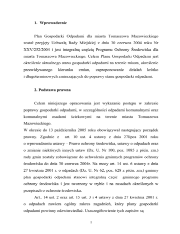 1. Wprowadzenie Plan Gospodarki Odpadami dla miasta Tomaszowa Mazowieckiego został przyjęty Uchwałą Rady Miejskiej z dnia 30 czerwca 2004 roku Nr XXV/252/2004 i jest integralną częścią Programu Ochrony Środowiska dla miasta Tomaszowa Mazowieckiego. Celem Planu Gospodarki Odpadami jest określenie aktualnego stanu gospodarki odpadami na terenie miasta, określenie przewidywanego kierunku zmian, zaproponowanie działań krótko i długoterminowych zmierzających do poprawy stanu gospodarki odpadami. 2. Podstawa prawna Celem niniejszego opracowania jest wykazanie postępu w zakresie poprawy gospodarki odpadami, w szczególności odpadami komunalnymi oraz komunalnymi osadami ściekowymi na terenie miasta Tomaszowa Mazowieckiego. W okresie do 13 października 2005 roku obowiązywał następujący porządek prawny. Zgodnie z art. 10 ust. 4 ustawy z dnia 27lipca 2001 roku o wprowadzeniu ustawy – Prawo ochrony środowiska, ustawy o odpadach oraz o zmianie niektórych innych ustaw (Dz. U. Nr 100, poz. 1085 z późn. zm.) rady gmin zostały zobowiązane do uchwalenia gminnych programów ochrony środowiska do dnia 30 czerwca 2004r. Na mocy art. 14 ust. 6 ustawy z dnia 27 kwietnia 2001 r. o odpadach (Dz. U. Nr 62, poz. 628 z późn. zm.) gminny plan gospodarki odpadami stanowi integralną część gminnego programu ochrony środowiska i jest tworzony w trybie i na zasadach określonych w przepisach o ochronie środowiska. Art.. 14 ust. 2 oraz art. 15 ust. 3 i 4 ustawy z dnia 27 kwietnia 2001 r. o odpadach zawiera ogólny zakres zagadnień, który plany gospodarki odpadami powinny odzwierciedlać. Uszczegółowienie tych zapisów są 1 wytyczne zawarte w § 4 i § 6 pkt. 2 i 4 rozporządzenia Ministra Środowiska z dnia 9 kwietnia 2003 roku w sprawie sporządzania planów gospodarki odpadami (Dz. U. Nr 66, poz. 620 oraz z 2006 r. Nr 46, poz. 333). Natomiast art. 14 ust. 13 ustawy z dnia 27 kwietnia 2001 roku nakłada na organ wykonawczy gminy obowiązek sporządzenia co dwa lata i przedłożenia radzie gminy sprawozdania z realizacji gminnego planu gospodarki odpadami. Wraz z wejściem w życie ustawy z dnia 20 lipca 2005 roku ustawy o zmianie ustawy o odpadach oraz zmianie niektórych innych ustaw (Dz. U. Nr 175, poz. 1458 z późn. zm.) wprowadzono modyfikacje dotyczące: 1. zakresu gminnych planów gospodarki odpadami, 2. okresu sprawozdawczego oraz procedury przygotowania sprawozdania z realizacji gminnego planu gospodarki odpadami. Ad. 1. Poprzez zmianę art. 14 ust. 2 oraz uchylenie ust. 3 i 4 w art. 15 ustawy o odpadach doprecyzowany i ujednolicony został ogólny zakres gminnego planu gospodarki odpadami. Z kolei wyłączenie gminnych planów gospodarki odpadami z ust. 7 w art. 15 i dodanie nowego ust. 7a w art. 15 ustawy zawęziło zakres gminnego planu gospodarki odpadami tylko do odpadów komunalnych powstających na obszarze danej gminy oraz przywożonych na jej obszar z uwzględnieniem odpadów komunalnych ulegających biodegradacji oraz odpadów niebezpiecznych zawartych w odpadach komunalnych. Konsekwencją tych zmian, była nowelizacja rozporządzenia Ministra Środowiska z dnia 9 kwietnia 2003 roku w sprawie sporządzania planów gospodarki odpadami. Rozporządzenie Ministra Środowiska z dnia 13 marca 2006 r. zmieniające rozporządzenie w sprawie sporządzania planów gospodarki odpadami zostało opublikowane w Dzienniku Ustaw Nr 46, poz. 333 i obowiązuje od 5 kwietnia 2006 roku. Ad. 2. W art. 14 ustawy o odpadach dodany został ustęp 12 b. Określa on okres sprawozdawczy z realizacji planu gospodarki odpadami, jako okres 2 dwóch lat kalendarzowych, według stanu na dzień 31 grudnia roku kończącego ten okres. Ponadto w artykule 14 całkowicie zmieniono brzmienie ust. 13, w którym w pkt. 1 określono, że sprawozdanie z realizacji gminnego planu gospodarki odpadami organ wykonawczy gminy przedkłada radzie gminy oraz zarządowi powiatu w terminie do dnia 31 marca, po upływie okresu sprawozdawczego. W związku z tym pierwsze sprawozdanie z realizacji gminnego planu gospodarki odpadami zostanie przedłożone radzie gminy i zarządowi powiatu do dnia 31 marca 2007 r. Termin ten wynika zaś z art. 9 ustawy o zmianie ustawy o odpadach oraz zmianie niektórych innych ustaw, który mówi, że pierwsze sprawozdanie z realizacji gminnego planu gospodarki odpadami obejmuje okres od dnia uchwalenia pierwszego planu gospodarkami odpadami do 31 grudnia 2006 r. 3. Gospodarka odpadami Źródłami wytwarzania odpadów komunalnych w Tomaszowie Maz. są gospodarstwa domowe, instytucje i zakłady przemysłowe zlokalizowane na terenie miasta. Gospodarkę odpadami komunalnymi realizuje się przez gromadzenie, usuwanie i unieszkodliwianie odpadów. System zbiórki odpadów w Tomaszowie Maz. prowadzony jest w tak zwanym systemie umownym. Miasto powierzyło wykonywanie zadań z zakresu gospodarki komunalnymi podmiotom prawnym w drodze zezwolenia. odpadami Są to firmy umieszczone w tabeli poniżej. EWIDENCJA FIRM WYWOZOWYCH – stan na 31. 12. 2006 r. NAZWA FIRMY RODZAJ ODPADÓW 3 OKRES 1. 2. 3. 4. 5. 6. 7. 8. 9. 10. 11. 12. 13. ALTVATER SULO Polska Sp. z o.o. Oddział w Tomaszowie Maz. ul. Majowa 87/89 97-200 Tomaszów Maz. „ISZAS” Ireneusz Knap ul. Reymonta 11 97-225 Ujazd ZUiKZ Jerzy Zysiak ul. Tkacka 16 97-200 Tomaszów Maz. Zakład Usług Komunalnych „HAK” Stanisław Buczyński ul. Próchnika 25 97-300 Piotrków Tryb. Andrzej Bagiński Transport Zarobkowy ul. Botaniczna 16 97-200 Tomaszów Maz. Spółdzielnia Mieszkaniowa „Przodownik” ul. O. Lange 5 97-200 Tomaszów Maz. PHU JUKO Jerzy Szcukocki Ul. 1-go maja 25 97-300 Piotrków Tryb. SITA POLSKA Sp. z o.o. ul. Zawodzie 5 02-981 Warszawa stałe i płynne Firma Handlowo-Usługowa „WOJ-POL” Ogórek Wojciech Zawada 387 97-200 Tomaszów Maz. Usługi Asenizacyjne Andrzej Augustyniak ul. Chrobrego 15 97-200 Tomaszów Maz. Usługi Asenizacyjne Marek Jóźwik Olszowiec 9 97-200 Tomaszów Maz. Usługi Asenizacyjne Wojciech W