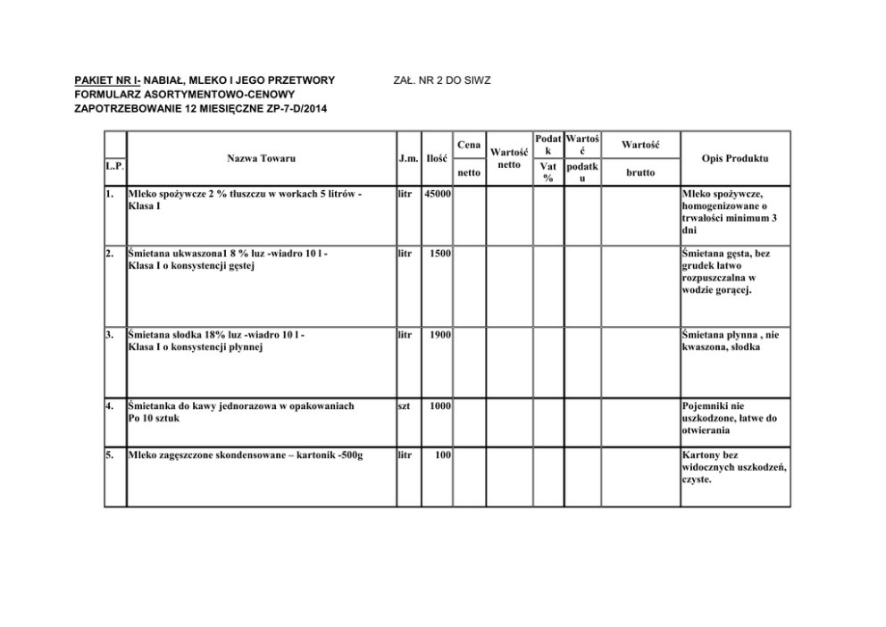 PAKIET NR I- NABIAŁ, MLEKO I JEGO PRZETWORY FORMULARZ ASORTYMENTOWO-CENOWY ZAPOTRZEBOWANIE 12 MIESIĘCZNE ZP-7-D/2014 ZAŁ. NR 2 DO SIWZ Podat Wartoś k ć Wartość J.m. Ilość netto Vat podatk netto % u litr 45000 Cena L.P. Nazwa Towaru Wartość Opis Produktu brutto 1. Mleko spożywcze 2 % tłuszczu w workach 5 litrów Klasa I Mleko spożywcze, homogenizowane o trwałości minimum 3 dni 2. Śmietana ukwaszona1 8 % luz -wiadro 10 l Klasa I o konsystencji gęstej litr 1500 Śmietana gęsta, bez grudek łatwo rozpuszczalna w wodzie gorącej. 3. Śmietana słodka 18% luz -wiadro 10 l Klasa I o konsystencji płynnej litr 1900 Śmietana płynna , nie kwaszona, słodka 4. Śmietanka do kawy jednorazowa w opakowaniach Po 10 sztuk szt 1000 Pojemniki nie uszkodzone, łatwe do otwierania 5. Mleko zagęszczone skondensowane – kartonik -500g litr 100 Kartony bez widocznych uszkodzeń, czyste. 6. Jogurt naturalny kubek o pojemności od 135-150g klasa I zawartość tłuszczu od 1,5% szt 15000 Kubek , opakowanie jednorazowego użytku, bez uszkodzeń mechanicznych i zabrudzeń. 7. Jogurt owocowy kubek o pojemności od 135-150 g Klasa I zawartość tłuszczu od 1,5% szt 10000 Kubek , opakowanie jednorazowego użytku, bez uszkodzeń mechanicznych i zabrudzeń. 8. Kefir 2 % tłuszczu luz - wiadro,10 l - klasa I litr 1200 9. Kefir 2 % tłuszczu – kubek -200 g - klasa I szt 14000 10. Serek topiony 40% tł w s.m./tj. nie mniej niż 16 % tł Ogółem +/-0,5%w wyrobie-tłusty wg klasy I 1 szt/100 gramów różne smaki wg zamawiającego szt 10000 Kefir nie przekwaszony, konsystencja jednolita, charakterystyczna półplynna. Kubek , opakowanie jednorazowego użytku, bez uszkodzeń mechanicznych i zabrudzeń. Sery topione naturalne bez zastosowania surowców seropodobnych 11. Serek topiony 60 % tł w.s.m / nie mniej niż 27% tł ogółem +/-0,5% w wyrobie typ kremowy wg klasy I 1 szt/ 17,5 gramów różne smaki wg zamawiającego szt 38000 Sery topione naturalne bez zastosowania surowców seropodobnych 12. Ser twarogowy półtłusty niedojrzewający o zawartości tłuszczu 15 % ± 2% - klasa I pakowany w pergamin. kg 8400 Twaróg świeży , nieprzekwaszony, miękki do krojenia plastrów nie może być twardy, zbity z oznakami psucia się. 13. Ser żółty pełnotłusty 45% tłuszczu w.s.m -'' twardy '' klasa I np. salami, gouda kg 2200 Ser twardy z naturalnych surowców, bez dodatków seropodobnych. 14. Serek „Fromage tłusty 30% tł w s.m. +/- 2% klasa I 1 szt/100 g (śmietankowe,warzywne-pietruszka zielona,koperek) kg 800 15. Serek twarożkowy brzoskwiniowy od 150 -200 g szt 400 16. Serek twarożkowy truskawkowy od 150 -200 g szt 400 17. Serek twarożkowy waniliowy od 150 g – 200 g szt 400 18. Serek twarożkowy jagodowy od 150 – 200 g szt 400 Ser twarogowy, fromage o konsystencji smarowalnej, z dodatkami łatwostrawnymi , bez dodatków ostrych przypraw i warzyw. Serek o intensywnym zapachu i smaku konsystencja jednorodna gładka. Serek o intensywnym zapachu i smaku konsystencja jednorodna, gładka Serek o intensywnym zapachu i smaku konsystencja jednorodna, gładka Serek o intensywnym zapachu i smaku konsystencja jednorodna, gładka 19. Deser czekoladowy - 100-150 g. szt 1200 20. Deser waniliowy - 100-150 g. szt 1500 21. Deser owocowy - 100-150 g. szt 1500 22. kg 1000 kg 1000 Ser naturalny homogenizowany termizowany o zawartości tłuszczu od 7% do 10% 23. Ser naturalny homogenizowany termizowany o smaku waniliowym zawartości tłuszczu od 7% do 10% Deser o intensywnym zapachu i smaku kojarzonym z nazwą deseru konsystencja jednorodna, gładka Deser o intensywnym zapachu i smaku kojarzonym z nazwą deseru konsystencja jednorodna, gładka Deser o intensywnym zapachu i smaku kojarzonym z nazwą deseru konsystencja jednorodna, gładka Ser homogenizowany naturalny o konsystencji gęstej, gładki jednolity będzie wykorzystywany do smarowania m.in.. naleśników. Ser homogenizowany naturalny o konsystencji gęstej, gładki jednolity będzie wykorzystywany do smarowania m.in.. naleśników. RAZEM: .................................................................. Miejscowość, data ........................................................ Podpis/y/ osób/y/ uprawnionych