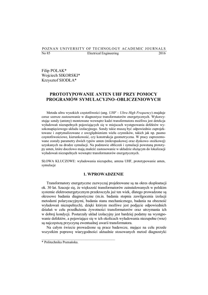 P O Z N A N UN I VE RS I T Y O F T E C HN O L O G Y ACA D E MI C J O URN A L S No 85 Electrical Engineering 2016 Filip POLAK* Wojciech SIKORSKI* Krzysztof SIODŁA* PROTOTYPOWANIE ANTEN UHF PRZY POMOCY PROGRAMÓW SYMULACYJNO–OBLICZENIOWYCH Metoda ultra wysokich częstotliwości (ang. UHF – Ultra High Frequency) znajduje coraz szersze zastosowanie w diagnostyce transformatorów energetycznych. Wykorzystując sondy (anteny) montowane wewnątrz kadzi transformatora możliwa jest detekcja wyładowań niezupełnych pojawiających się w miejscach występowania defektów wysokonapięciowego układu izolacyjnego. Sondy takie muszą być odpowiednio zaprojektowane i zoptymalizowane z uwzględnieniem wielu czynników, takich jak np. pasmo częstotliwościowe, kierunkowość, czy konstrukcja geometryczna. W pracy zaprezentowane zostały parametry dwóch typów anten (mikropaskowej oraz dyskowo–stożkowej) uzyskanych na drodze symulacji. Na podstawie obliczeń i symulacji powstaną prototypy anten, które docelowo mają znaleźć zastosowanie w układzie służącym do lokalizacji wyładowań niezupełnych wewnątrz transformatorów energetycznych. SŁOWA KLUCZOWE: wyładowania niezupełne, antena UHF, prototypowanie anten, symulacje 1. WPROWADZENIE Transformatory energetyczne zazwyczaj projektowane są na okres eksploatacji ok. 30 lat. Szacuje się, że większość transformatorów zainstalowanych w polskim systemie elektroenergetycznym przekroczyła już ten wiek, dlatego prowadzone są okresowe badania diagnostyczne (m.in. badania stopnia zawilgocenia izolacji metodami polaryzacyjnymi, badania stanu mechanicznego, badania na obecność wyładowań niezupełnych), dzięki którym możliwe jest podjęcie odpowiednich działań w celu przedłużenia żywotności transformatorów oraz utrzymania ich w dobrej kondycji. Postarzały układ izolacyjny jest bardziej podatny na występowanie defektów, a pojawiające się w ich okolicach wyładowania niezupełne (wnz) są najczęstszą przyczyną ewentualnej awarii transformatora. Na całym świecie prowadzone są prace badawcze, mające na celu przede wszystkim poprawę wiarygodności aktualnie stosowanych metod diagnostyki __________________________________________ * Politechnika Poznańska. 86 Filip Polak, Wojciech Sikorski, Krzysztof Siodła i monitoringu transformatorów energetycznych opartych na detekcji zjawiska wnz. Autorzy niniejszego artykułu koncentrują się na poszukiwaniu nowych rozwiązań teoretycznych i technologicznych, które pozwoliłyby znacząco poprawić dokładność oraz usprawnić procedurę lokalizacji defektów wysokonapięciowego układu izolacyjnego. Przedstawiana w artykułach [6, 9, 10] koncepcja zakłada zastosowanie techniki matryc sensorowych do oszacowania kierunku nadejścia sygnału emisji akustycznej bądź impulsu elektromagnetycznego (ang. DOA – Direction–of– Arrival Estimation) generowanego przez wnz. Wyniki symulacji i rekonesansowych badań potwierdzają zasadność obranej koncepcji. W niniejszym artykule zaprezentowane zostały wyniki ostatnich prac autorów, które skupiają się obecnie na projektowaniu elementów sensorycznych układu pomiarowego w postaci anten pracujących w paśmie ultra wysokich częstotliwości (ang. UHF – Ultra High Frequency). W dalszej części artykułu zaprezentowane wyniki symulacji dwóch konstrukcji antenowych. Na potrzeby artykułu wybrane zostały tylko niektóre z parametrów, najbardziej istotne z punktu widzenia powstającego układu pomiarowego. 2. WYBRANE PARAMETRY ANTEN Przestrzeń otaczająca antenę jest zwykle podzielona na trzy strefy: (a) indukcji (inaczej strefa bliska), (b) Fresnela (in. strefa pośrednia) i (c) promieniowania (in. Fraunhofera lub strefa daleka). Strefy te są tak wyznaczone, aby w każdej z nich zidentyfikować strukturę pola. W momencie przekraczania granic poszczególnych stref nie występują gwałtowne zmiany w charakterystyce pola, jednak istnieją wyraźne różnice między nimi. Granice określa się na podstawie wielu przybliżeń i nie są to wartości identyczne dla wszystkich rodzajów anten. Najczęściej używa się warunków, które muszą zostać spełnione, aby rozpatrywać daną strefę. Strefa bliska jest opisywana jako obszar bezpośrednio otaczający antenę z przewagą pola indukcyjnego. Analiza pól elektrycznych i magnetycznych w tej strefie jest bardzo skomplikowana – są one przesunięte w fazie względem siebie o 90°, energia nie jest promieniowana na zewnątrz a magazynowana w polu elektrycznym i magnetycznym. Dla większości anten przyjmuje się, że strefa ta zamyka się w obszarze mniejszym niż R 0,62 D 3 (1) od środka powierzchni promieniującej (R – odległość od środka anteny, D – największy wymiar anteny, λ – długość fali). Dla anten elektrycznie krótkich przyjęło się stosować granicę wynoszącą λ/2π. Wraz ze wzrostem odległości od środka anteny (poza strefą bliską) składowe pola elektrycznego przesuwają się w fazie, przez co pojawia się przepływ ener- Prototypowanie anten UHF przy pomocy programów symulacyjno– ... 87 gii wzdłuż kierunku propagacji, promieniowanie przeważa nad polem indukcyjnym (które wciąż jest obecne), a rozkład pola zależy od odległości od anteny. Strefa taka nazywana jest strefą pośrednią (Fresnela) i zawiera się w obszarze 0,62 D 3 R 2D 2 . (2) Jako strefę daleką (Fraunhofera) uznaje się obszar w odległości R 2D 2 (3) od środka anteny. W tej strefie składowe pola elektrycznego i magnetycznego są prostopadłe względem siebie i kierunku propagacji, co jest cechą fali płaskiej. Zakładając, że fala emitowana przez antenę ma charakter kulisty, traktowanie jej jako falę płaską byłoby możliwe tylko w nieskończenie wielkiej odległości od źródła. Przyjmuje się jednak pewne przybliżenia, z których podstawowym jest założenie, że powyżej wspomnianej odległości promienie poprowadzone od źródła 