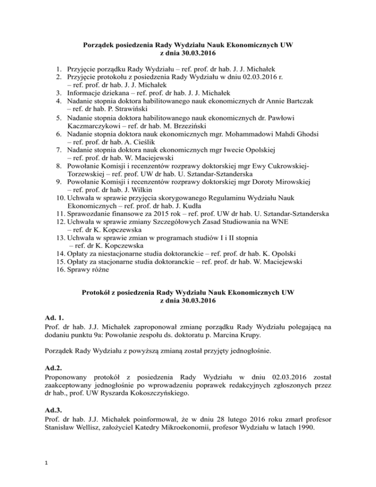 Porządek posiedzenia Rady Wydziału Nauk Ekonomicznych UW z dnia 30.03.2016 1. Przyjęcie porządku Rady Wydziału – ref. prof. dr hab. J. J. Michałek 2. Przyjęcie protokołu z posiedzenia Rady Wydziału w dniu 02.03.2016 r. – ref. prof. dr hab. J. J. Michałek 3. Informacje dziekana – ref. prof. dr hab. J. J. Michałek 4. Nadanie stopnia doktora habilitowanego nauk ekonomicznych dr Annie Bartczak – ref. dr hab. P. Strawiński 5. Nadanie stopnia doktora habilitowanego nauk ekonomicznych dr. Pawłowi Kaczmarczykowi – ref. dr hab. M. Brzeziński 6. Nadanie stopnia doktora nauk ekonomicznych mgr. Mohammadowi Mahdi Ghodsi – ref. prof. dr hab. A. Cieślik 7. Nadanie stopnia doktora nauk ekonomicznych mgr Iwecie Opolskiej – ref. prof. dr hab. W. Maciejewski 8. Powołanie Komisji i recenzentów rozprawy doktorskiej mgr Ewy CukrowskiejTorzewskiej – ref. prof. UW dr hab. U. Sztandar-Sztanderska 9. Powołanie Komisji i recenzentów rozprawy doktorskiej mgr Doroty Mirowskiej – ref. prof. dr hab. J. Wilkin 10. Uchwała w sprawie przyjęcia skorygowanego Regulaminu Wydziału Nauk Ekonomicznych – ref. prof. dr hab. J. Kudła 11. Sprawozdanie finansowe za 2015 rok – ref. prof. UW dr hab. U. Sztandar-Sztanderska 12. Uchwała w sprawie zmiany Szczegółowych Zasad Studiowania na WNE – ref. dr K. Kopczewska 13. Uchwała w sprawie zmian w programach studiów I i II stopnia – ref. dr K. Kopczewska 14. Opłaty za niestacjonarne studia doktoranckie – ref. prof. dr hab. K. Opolski 15. Opłaty za stacjonarne studia doktoranckie – ref. prof. dr hab. W. Maciejewski 16. Sprawy różne Protokół z posiedzenia Rady Wydziału Nauk Ekonomicznych UW z dnia 30.03.2016 Ad. 1. Prof. dr hab. J.J. Michałek zaproponował zmianę porządku Rady Wydziału polegającą na dodaniu punktu 9a: Powołanie zespołu ds. doktoratu p. Marcina Krupy. Porządek Rady Wydziału z powyższą zmianą został przyjęty jednogłośnie. Ad.2. Proponowany protokół z posiedzenia Rady Wydziału w dniu 02.03.2016 został zaakceptowany jednogłośnie po wprowadzeniu poprawek redakcyjnych zgłoszonych przez dr hab., prof. UW Ryszarda Kokoszczyńskiego. Ad.3. Prof. dr hab. J.J. Michałek poinformował, że w dniu 28 lutego 2016 roku zmarł profesor Stanisław Wellisz, założyciel Katedry Mikroekonomii, profesor Wydziału w latach 1990. 1 Od 1995 roku, dzięki staraniom Profesora Wellisza oraz środkom przyznanym przez cztery wielkie fundacje amerykańskie przy Wydziale Nauk Ekonomicznych UW uruchomiono Centrum Badań Ekonomicznych Europy Środkowej i Wschodniej. Centrum przyznawało stypendia badawcze młodym ekonomistom z Polski i krajów ościennych. Profesor Wellisz nie ograniczał swojej działalności tylko do WNE. W 1991 roku razem z polskimi ekonomistami uruchomił przy Fundacji im. Stefana Batorego Letnią Szkołę Ekonomii. Wyrazem uznania przez środowisko naukowe Uniwersytetu Warszawskiego było nadanie Profesorowi Stanisławowi Welliszowi tytułu Doktora Honoris Causa Uniwersytetu Warszawskiego w 1998 roku. Pogrzeb profesora Stanisława Wellisza odbędzie się najprawdopodobniej w dniu 20 czerwca 2016 roku w Warszawie. Rada Wydziału uczciła pamięć profesora Stanisława Wellisza minutą ciszy. Prof. dr hab. J.J. Michałek poinformował, iż od czasu ostatniego posiedzenia Rady Wydziału odbyło się jedno posiedzenie Senatu UW w dniu 23.02.2016. Najważniejszy dla Wydziału punkt dotyczył trzech wniosków o mianowanie na stanowisko profesora zwyczajnego na Uniwersytecie Warszawskim na czas nieokreślony. Wnioski te dotyczyły prof. dr hab. Andrzeja Cieślika, prof. dr hab. Janusza Kudły oraz prof. dr hab. Barbary Z. Liberdy. Wszystkie trzy wnioski zostały pozytywnie zaopiniowane przez Komisję rektorską ds. nominacji profesorskich. W trakcie głosowania na posiedzeniu Senatu wszystkie trzy wnioski zostały zaakceptowane przeważającą większością głosów przy 1-2 głosach wstrzymujących się. Prof. dr hab. J.J. Michałek serdecznie pogratulował wszystkim nominowanym profesorom. Prof. dr hab. J.J. Michałek poinformował również, iż na posiedzeniu Senatu nie podjęto uchwały w sprawie profilu i programu kształcenia studiów prowadzonych na WNE. Przekazane przez Wydział materiały muszą zostać skorygowane. Decyzja Senatu w tej sprawie będzie prawdopodobnie finalizowana na posiedzeniu kwietniowym. Decyzją Prorektora prof. dr hab. Alojzego Nowaka grant NCN prowadzony na WNE i kierowany przez dr. Krzysztofa Makarskiego (pracującego na SGH i w NBP) został przeniesiony do Fundacji Adeptów i Miłośników Ekonomii założonej i kierowanej przez dr hab. Joannę Tyrowicz. Dziekani Wydziału wyrażali wątpliwości etyczne wobec takiej inicjatywy, ale przekazali rozstrzygnięcie w ręce Prorektora. Z inicjatywy Kierownika Katedry Ekonomii Politycznej w dniu 4 kwietnia o godz. 12.30 Wydział będzie gościć wicepremiera i ministra rozwoju Mateusza Morawieckiego, autora „Planu na rzecz odpowiedzialnego rozwoju”. Debata nad tym programem będzie miała charakter seminaryjnego spotkania i rozpocznie się od krótkiego wprowadzenia ze strony gościa. Pana Premiera powita JMR prof. Marcin Pałys, a samo spotkanie poprowadzi dr hab., prof. UW Urszula Sztandar-Sztanderska. W spotkaniu mogą wziąć udział wszyscy zainteresowani pracownicy WNE UW. Prof. dr hab. J.J. Michałek poprosił, aby rozpowszechnić informację o tym spotkaniu wśród pracowników katedr/zakładów. Prof. dr hab. J.J. Michałek poprosił również, by osoby, które chcą wziąć udział w tej dyskusji, potwierdziły ten fakt do dn. 30 marca p. Beacie Kący, a także przekazały dr hab., prof. UW Urszuli Sztandar-Sztanderskiej ewentualne informacje na temat swego „pola zainteresowania” (tych kwestii z planu Morawieckiego, które te osoby chciałyby szczególnie skomentować) po to, by mogła lepiej zorganizować dyskusję. 2 Prof. dr hab. J.J. Michałek poinformował, iż Wydziałowa Komisja Wyborcza proponuje, b