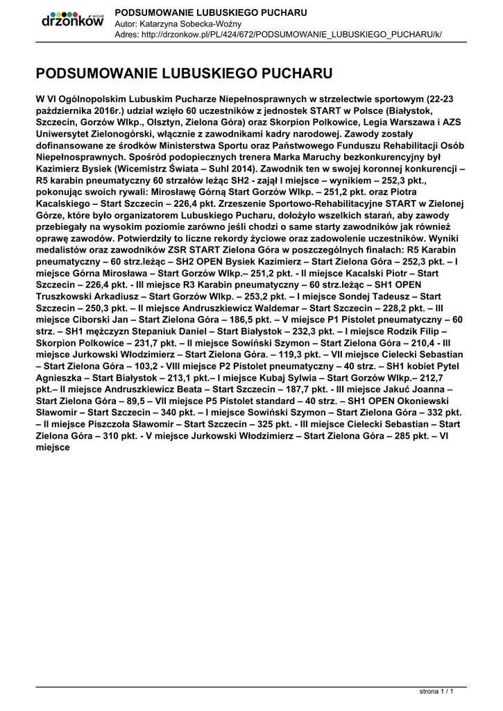 PODSUMOWANIE LUBUSKIEGO PUCHARU Autor: Katarzyna Sobecka-Woźny Adres: http://drzonkow.pl/PL/424/672/PODSUMOWANIE_LUBUSKIEGO_PUCHARU/k/ PODSUMOWANIE LUBUSKIEGO PUCHARU W VI Ogólnopolskim Lubuskim Pucharze Niepełnosprawnych w strzelectwie sportowym (22-23 października 2016r.) udział wzięło 60 uczestników z jednostek START w Polsce (Białystok, Szczecin, Gorzów Wlkp., Olsztyn, Zielona Góra) oraz Skorpion Polkowice, Legia Warszawa i AZS Uniwersytet Zielonogórski, włącznie z zawodnikami kadry narodowej. Zawody zostały dofinansowane ze środków Ministerstwa Sportu oraz Państwowego Funduszu Rehabilitacji Osób Niepełnosprawnych. Spośród podopiecznych trenera Marka Maruchy bezkonkurencyjny był Kazimierz Bysiek (Wicemistrz Świata – Suhl 2014). Zawodnik ten w swojej koronnej konkurencji – R5 karabin pneumatyczny 60 strzałów leżąc SH2 - zajął I miejsce – wynikiem – 252,3 pkt., pokonując swoich rywali: Mirosławę Górną Start Gorzów Wlkp. – 251,2 pkt. oraz Piotra Kacalskiego – Start Szczecin – 226,4 pkt. Zrzeszenie Sportowo-Rehabilitacyjne START w Zielonej Górze, które było organizatorem Lubuskiego Pucharu, dołożyło wszelkich starań, aby zawody przebiegały na wysokim poziomie zarówno jeśli chodzi o same starty zawodników jak również oprawę zawodów. Potwierdziły to liczne rekordy życiowe oraz zadowolenie uczestników. Wyniki medalistów oraz zawodników ZSR START Zielona Góra w poszczególnych finałach: R5 Karabin pneumatyczny – 60 strz.leżąc – SH2 OPEN Bysiek Kazimierz – Start Zielona Góra – 252,3 pkt. – I miejsce Górna Mirosława – Start Gorzów Wlkp.– 251,2 pkt. - II miejsce Kacalski Piotr – Start Szczecin – 226,4 pkt. - III miejsce R3 Karabin pneumatyczny – 60 strz.leżąc – SH1 OPEN Truszkowski Arkadiusz – Start Gorzów Wlkp. – 253,2 pkt. – I miejsce Sondej Tadeusz – Start Szczecin – 250,3 pkt. – II miejsce Andruszkiewicz Waldemar – Start Szczecin – 228,2 pkt. – III miejsce Ciborski Jan – Start Zielona Góra – 186,5 pkt. – V miejsce P1 Pistolet pneumatyczny – 60 strz. – SH1 mężczyzn Stepaniuk Daniel – Start Białystok – 232,3 pkt. – I miejsce Rodzik Filip – Skorpion Polkowice – 231,7 pkt. – II miejsce Sowiński Szymon – Start Zielona Góra – 210,4 - III miejsce Jurkowski Włodzimierz – Start Zielona Góra. – 119,3 pkt. – VII miejsce Cielecki Sebastian – Start Zielona Góra – 103,2 - VIII miejsce P2 Pistolet pneumatyczny – 40 strz. – SH1 kobiet Pytel Agnieszka – Start Białystok – 213,1 pkt.– I miejsce Kubaj Sylwia – Start Gorzów Wlkp.– 212,7 pkt.– II miejsce Andruszkiewicz Beata – Start Szczecin – 187,7 pkt. - III miejsce Jakuć Joanna – Start Zielona Góra – 89,5 – VII miejsce P5 Pistolet standard – 40 strz. – SH1 OPEN Okoniewski Sławomir – Start Szczecin – 340 pkt. – I miejsce Sowiński Szymon – Start Zielona Góra – 332 pkt. – II miejsce Piszczoła Sławomir – Start Szczecin – 325 pkt. - III miejsce Cielecki Sebastian – Start Zielona Góra – 310 pkt. - V miejsce Jurkowski Włodzimierz – Start Zielona Góra – 285 pkt. – VI miejsce strona 1 / 1 Powered by TCPDF (www.tcpdf.org)
