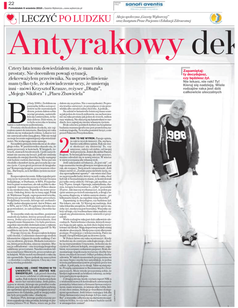 22 PARTNER CYKLU Poniedziałek 6 września 2010 Gazeta Wyborcza www.wyborcza.pl + + LECZYĆ PO LUDZKU Akcja społeczna „Gazety Wyborczej” oraz Instytutu Praw Pacjenta i Edukacji Zdrowotnej Antyrakowy dek Cztery lata temu dowiedziałem się, że mam raka prostaty. Nie doceniłem powagi sytuacji, zlekceważyłem przeciwnika. Na usprawiedliwienie mam tylko tyle, że doświadczenie uczy, że umierają inni – mówi Krzysztof Krauze, reżyser „Długu”, „Mojego Nikifora” i „Placu Zbawiciela” 1 BADAJ SIĘ – CHOĆ TRUDNO W TO UWIERZYĆ, NIE JESTEŚ NIEŚMIERTELNY. Lęk przed chorobą nie może odebrać ci zdrowego rozsądku. Rak wykryty w końcowej fazie może być nieuleczalny. Jeśli palisz, żyjesz w stresie, którego nie potrafisz rozładować, jesz byle jak, byle gdzie i byle szybciej, nie uprawiasz sportu poza wyścigami na trzypasmówce do Gdańska, jeśli w twojej rodzinie były przypadki raka – zbadaj się. Badanie PSA, którego podwyższony poziom sygnalizuje raka prostaty, kosztuje w prywatnej klinice 70 zł. Warto, wierz mi, ja zba- dałem się za późno. Nie z oszczędności. Po prostu trudno uwierzyć, że przyplącze ci się przewlekła albo nieuleczalna choroba. A jednak... Na udział w katastrofie lotniczej masz szansę jak jeden do trzech milionów, na zachorowanie na raka prostaty jak jeden do trzech, milion razy większą. Nie ekscytuj się katastrofami w mediach, lecz zajmij się swoim własnym życiem. Brak odzewu polskich kobiet na bezpłatne badania mammograficzne jest prawdziwą narodową tragedią. Tu trzeba postawić krzyż, a nie przed Pałacem Prezydenckim. 2 RAK TO NIE WYROK. Panuje opinia, że rak to wyrok śmierci. Zła, myląca, bardzo szkodliwa opinia. Rak nie musi skończyć się śmiercią! To, czy umrzesz, zależy od ciebie, od twojej woli przeżycia. Jesteś dla siebie Panem Bogiem. To brzmi jak herezja, ale żeby przeżyć, musisz odrodzić się w nowej wierze. W wierze w niewyczerpaną siłę własnej woli. Jeśli usłyszałeś od lekarza: „To jest rak”, od tego momentu twoim głównym wrogiem nie jest rak, ale rozpacz. Twój strach i niepewność. Jeśli lekarz mówi ci: „Zostało panu niewiele życia, radzę uporządkować sprawy” – nie wierz mu! Znane są przypadki ludzi, którzy wyszli z raka, choć byli tak w beznadziejnym stanie, że kontrolowali już tylko swój oddech. Od tego, jak myślisz, zależy 75 proc. terapii. Operacje, naświetlenia, chemia, terapia hormonalna to „tylko” pozostałe 25 proc. Jak inaczej wytłumaczyć, że jeden pacjent umiera po trzech miesiącach, a drugi z taką samą diagnozą, w takim samym stanie... po kilkunastu latach, na zupełnie inną chorobę? Zapamiętaj, ty decydujesz, czy będziesz żył. Nie lekarz, nie rak. Ty! Kieruj się nadzieją. Jest taka lekarska anegdota: Jeśli pacjent uprze się, żeby żyć, medycyna jest bezradna. Wszystko zależy od tego, czy rozdmuchasz iskrę nadziei, czy zapali się płomieniem, który oświetli ci przyszłość. Wiele rodzajów raka jest dziś całkowicie uleczalnych. Naświetlenia i chemia, których wszyscy boją się jak ognia, są dziś dużo lepiej wycelowane niż kiedyś. Mają nieporównywalnie mniej skutków ubocznych. Medycyna czyni olbrzymie postępy. Przyjmij je z wdzięcznością. Patrz na stojak z kroplówkami jak na drzewo życia. W Polsce łatwo się raka wystraszyć. Kiedy wchodzi się do centrum onkologicznego, choćby na warszawskim Ursynowie, wchodzi się do czyśćca! Labirynt kolejek, zrezygnowani, zagubieni, wyczerpani czekaniem pacjenci. Brak elementarnego współczucia wyrażony choćby brakiem zwykłych krzeseł. Odbyt polskiej służby zdrowia. W takich momentach przypomina mi się nasz Sejm i myślę bez satysfakcji, że jedna trzecia parlamentarzystów przejdzie przez ten odbyt. A jeśli palą, to co drugi. Takie są statystyki. Przejdą zamienieni w Bezimiennych i Zrozpaczonych. Może wtedy przypomną sobie, że kiedyś zagłosowali za brakiem reformy, za świętym partyjnym spokojem. Z drugiej strony, kiedy czytam raport NIK-u o wielomilionowych kontraktach zawieranych pomiędzy lekarzami a firmami farmaceutycznymi, mam wrażenie, że istnieje silne lobby, które nie chce zmian, blokuje je wszelkimi dostępnymi sposobami. Jeśli lekarz testujący lek dla firmy farmaceutycznej dostaje 4,5 tys. euro „od łba”, a wszystko odbywa się na darmowym szpitalnym łóżku, to czy taki lekarz będzie szedł w awangardzie zmian? ALBERT ZAWADA B ył luty 2006 r. Zrobiłem na pamiątkę kilka autoportretów na tle oszronionych drzew, potem dałem sobie wyciąć prostatę, naświetliłem się i uwierzyłem, że będzie dobrze. Dziś wiem, że to była ucieczka w krainę baśni o cudownym uzdrowieniu. Prostatę obchodziłem dookoła, nie zajrzałem nawet do internetu. Bardziej niż raka bałem się na wakacjach rekina. Lekarze też nie zawracali sobie mną głowy. Nikt nie wziął za moje leczenie najmniejszej odpowiedzialności. Nie wyłączając mnie samego. Szczęśliwa gwiazda świeciła mi aż do ubiegłego roku. W październiku okazało się, że mam przerzuty w kościach. W kręgach, żebrach, stawach biodrowych. I jeśli natychmiast nie zacznę się leczyć, jeśli nie zmienię stosunku do swojej choroby, każdy następny rok będzie cudem darowany. Teraz już nie chodziło o komfort życia, gra toczyła się o samo życie. Czym grozi przerzut do kręgosłupa? Kompresją kręgów, przerwaniem rdzenia... Barwnym, za to krótkim życiem na morfinie. Rozpocząłem leczenie. Kilka tygodni później życie wyrzuciło mnie na brzeg Oceanu Indyjskiego, w Durbanie, w RPA. Przyjechałem tu pisać scenariusz, ale rak szybko to skorygował – terapia rozpoczęta w Polsce okazała się nieskuteczna. Pojawiły się nowe przerzuty. Onkolog, który się tu mną zajął, Polak dr Waldemar Szpak, zaproponował ścieżkę, której nie przewidywały żadne procedury. Podjęliśmy leczenie, którego nie zrefundowałby żaden ubezpieczy