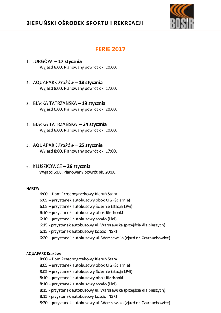 BIERUŃSKI OŚRODEK SPORTU i REKREACJI FERIE 2017 1. JURGÓW – 17 stycznia Wyjazd 6:00. Planowany powrót ok. 20:00. 2. AQUAPARK Kraków – 18 stycznia Wyjazd 8:00. Planowany powrót ok. 17:00. 3. BIAŁKA TATRZAŃSKA – 19 stycznia Wyjazd 6:00. Planowany powrót ok. 20:00. 4. BIAŁKA TATRZAŃSKA – 24 stycznia Wyjazd 6:00. Planowany powrót ok. 20:00. 5. AQUAPARK Kraków – 25 stycznia Wyjazd 8:00. Planowany powrót ok. 17:00. 6. KLUSZKOWCE – 26 stycznia Wyjazd 6:00. Planowany powrót ok. 20:00. NARTY: 6:00 – Dom Przedpogrzebowy Bieruń Stary 6:05 – przystanek autobusowy obok CIG (Ściernie) 6:05 – przystanek autobusowy Ściernie (stacja LPG) 6:10 – przystanek autobusowy obok Biedronki 6:10 – przystanek autobusowy rondo (Lidl) 6:15 - przystanek autobusowy ul. Warszawska (przejście dla pieszych) 6:15 - przystanek autobusowy kościół NSPJ 6:20 – przystanek autobusowy ul. Warszawska (zjazd na Czarnuchowice) AQUAPARK Kraków: 8:00 – Dom Przedpogrzebowy Bieruń Stary 8:05 – przystanek autobusowy obok CIG (Ściernie) 8:05 – przystanek autobusowy Ściernie (stacja LPG) 8:10 – przystanek autobusowy obok Biedronki 8:10 – przystanek autobusowy rondo (Lidl) 8:15 - przystanek autobusowy ul. Warszawska (przejście dla pieszych) 8:15 - przystanek autobusowy kościół NSPJ 8:20 – przystanek autobusowy ul. Warszawska (zjazd na Czarnuchowice)