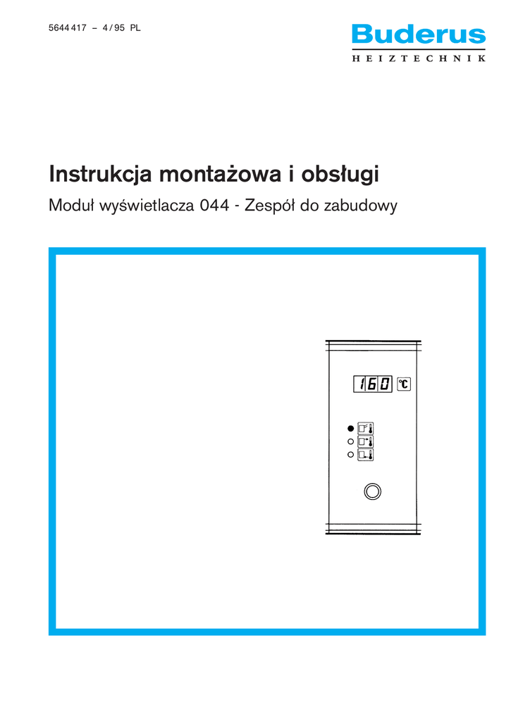 5644 417 – 4 / 95 PL úü Instrukcja montaz̈owa i obs¿ugi Modu¿ wys̃wietlacza 044 - Zespõ¿ do zabudowy Montaz̈ i przy¿“cze elektryczne modu¿õw moz̈e zostac̃ wykonane tylko przez firm„ specjalistyczn“. Modu¿ 044 jest przewidziany jako zespõ¿ do zabudowy w aparacie regulacyjnym HS 3321. Zakres dostawy x Modu¿ 044 x Torba z materia¿em montaz̈owym x Insstrukcja montaz̈owa Listwy przykrywaj“ce usuni„te Przys¿ony zas̃lepiaj“ce usuni„te x Schemat elektryczny Rys.1§ Aparat regulacyjny strona przednia przedstawienie zasady Montaz̈ modu¿u 044 x Urz“dzenie nalez̈y wy¿“czyc̃ spod napi„ci“, np.wy¿“czyc̃ przez ÆWy¿“cznik awaryjny grzania] przed kot¿owni“. x Usun“c̃ pokryw„ przezroczyst“ aparatu regulacyjnego. x Usun“c̃ listwy przykrywaj“ce (Rys.1). x Usun“c̃ obydwie przys¿ony zas̃lepiaj“ce (Rys.1). x Wykr„cic̃ obydwie s̃ruby kaptura przykrywaj“cego zaciski. Zdj“c̃ kaptur przykrywaj“cy przyciski (Rys.2). S8ruby kaptura przykrywaj“cego zaciski Rys.2§ Aparat regulacyjny strona tylna x Szyny prowadz“ce na¿oz̈yc̃ u gõry i u do¿u (Rys.3). x Modu¿ 044 nalez̈y wsun“c̃ od przodu i przykr„cic̃, nalez̈y zwracac̃ uwag„ na swobodne przesuwanie si„ w szynach prowadnicowych. Nie wolno dopus̃cic̃ do skos̃nego ustawienia’ Rys.3§ Nasadzic̃ szyny prowadz“ce 2 x Zaciski nasadzic̃ na nos̃nik zaciskõw (Rys.4) Rys.4. Na¿oz̈yc̃ zaciski x Umies̃cic̃ naklejki z oznakowaniem zaciskõw. Strza¿ka musi wskazywac̃ w kierunku zaciskõw’ (Rys.5). Rys.5§ Nakleic̃ naklejki x Wykonac̃ ze strony inwestora po¿“czenie mi„dzy zaci- skami i listw“ zaciskow“ zgodnie ze schematem elektrycznym (Rys.6). x Za¿oz̈yc̃ z powrotem listwy przykrywaj“ce. Listwa zaciskowa Zaciski x Za¿oz̈yc̃ z powrotem os¿on„ przeroczyst“. x Nasadzic̃ kaptur przykrywaj“cy zaciskõw i dokr„cic̃. x Uruchomic̃ urz“dzenie. x Przeprowadzic̃ sprawdzanie funkcji. Rys.6§ Wykonac̃ po¿“czenie 3 Modu¿ 044 jest cyfrowym instrumentem wskaz̃nikowym dla temperatury gazõw odlotowych, dop¿ywu i powrotu. Zakres pomiarõw = dop¿yw i odp¿yw gaz odlotowy 0 hC + 100 hC 0 hC + 400 hC Nastawy na p¿ycie czo¿owej W stanie spoczynku b„dzie b„dzie wskazywana w sposõb ci“g¿y temperatura gazõw odlotowych. Przez nacis̃ni„cie przycisku moz̈e zostac̃ przywo¿ana do wys̃wietlacza temperatura dop¿ywu do kot¿a b“dz̃ temperatura powrotu kot¿a. Po ok. 2 sekundach gasn“ wskazania, temperatura gazõw odlotowych ukazuje si„ znõw w polu wskazañ. Gdy nie jest pod¿“czony czujnik temperatury gazõw odlotowych, to wskazania s“ nie okres̃lone, np.900 hC. Rys.7 Nastawy na p¿ytce okablowanej + mog“ byc̃ przeprowadzane tylko przez fachowca. Zaciski przy¿“czowe dla z¿“cza Przed zabudow“ modu¿u nalez̈y w¿“czniki czujnikõw dop¿ywu i odp¿ywu Æzewn“trz- wewn“trz] ustawic̃ w po¿oz̈enie Æzewn“trz]. W¿“cznik Æzewn“trz- wewn“trz] Po¿oz̈enie Æwewn“trz]§ Powrõt zewn“trz Wartos̃ci pomiarowe dla temperatury do - i odp¿ywu b„d“ przenoszone bezpos̃rednio z ¿“cza p¿ytki obwodu drukowanego aparatu regulacyjnego. Tylko dla temperatury gazõw odlotowych nalez̈y przy¿“czyc̃ oddzielny czujnik temperatury gazõw odlotowych. Nastawa Æ zewn“trz] (nastawa fabryczna)§ To po¿oz̈enie w¿“cznika nalez̈y nastawic̃ tylko przy aparatach regulacyjnych bez regulacji Ecomatic, w po¿“czeniu z zestawem przy¿“czowym. Dop¿yw wewn“trz To po¿oz̈enie nalez̈y nastawic̃ przy aparatach regulacyjnych z regulacj“ Ecomatic. x4 x3 Nadruk znajduje si„ na stronie odwrotnej p¿ytki okablowanej Rys.8§ Modu¿ 044 wyci“gni„ty Wskazõwka y Funkcja ta jako ¿“cze przy zastosowaniu jako zespõ¿ do zabudowy nie jest uz̈yteczna. Zastrzega si„ prawo wprowadzania zmian ’