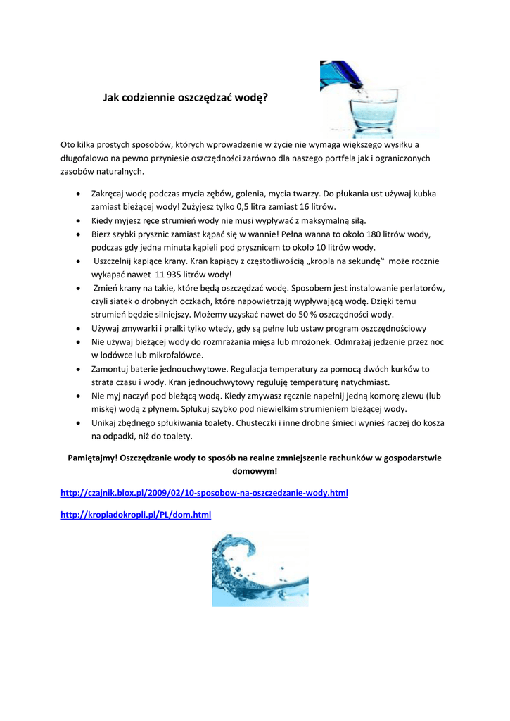 Jak codziennie oszczędzać wodę? Oto kilka prostych sposobów, których wprowadzenie w życie nie wymaga większego wysiłku a długofalowo na pewno przyniesie oszczędności zarówno dla naszego portfela jak i ograniczonych zasobów naturalnych. Zakręcaj wodę podczas mycia zębów, golenia, mycia twarzy. Do płukania ust używaj kubka zamiast bieżącej wody! Zużyjesz tylko 0,5 litra zamiast 16 litrów. Kiedy myjesz ręce strumień wody nie musi wypływać z maksymalną siłą. Bierz szybki prysznic zamiast kąpać się w wannie! Pełna wanna to około 180 litrów wody, podczas gdy jedna minuta kąpieli pod prysznicem to około 10 litrów wody. Uszczelnij kapiące krany. Kran kapiący z częstotliwością „kropla na sekundę‟ może rocznie wykapać nawet 11 935 litrów wody! Zmień krany na takie, które będą oszczędzać wodę. Sposobem jest instalowanie perlatorów, czyli siatek o drobnych oczkach, które napowietrzają wypływającą wodę. Dzięki temu strumień będzie silniejszy. Możemy uzyskać nawet do 50 % oszczędności wody. Używaj zmywarki i pralki tylko wtedy, gdy są pełne lub ustaw program oszczędnościowy Nie używaj bieżącej wody do rozmrażania mięsa lub mrożonek. Odmrażaj jedzenie przez noc w lodówce lub mikrofalówce. Zamontuj baterie jednouchwytowe. Regulacja temperatury za pomocą dwóch kurków to strata czasu i wody. Kran jednouchwytowy reguluję temperaturę natychmiast. Nie myj naczyń pod bieżącą wodą. Kiedy zmywasz ręcznie napełnij jedną komorę zlewu (lub miskę) wodą z płynem. Spłukuj szybko pod niewielkim strumieniem bieżącej wody. Unikaj zbędnego spłukiwania toalety. Chusteczki i inne drobne śmieci wynieś raczej do kosza na odpadki, niż do toalety. Pamiętajmy! Oszczędzanie wody to sposób na realne zmniejszenie rachunków w gospodarstwie domowym! http://czajnik.blox.pl/2009/02/10-sposobow-na-oszczedzanie-wody.html http://kropladokropli.pl/PL/dom.html