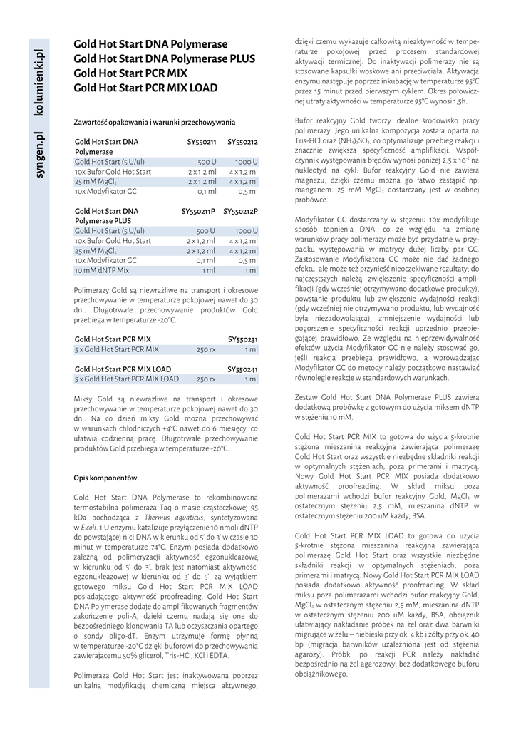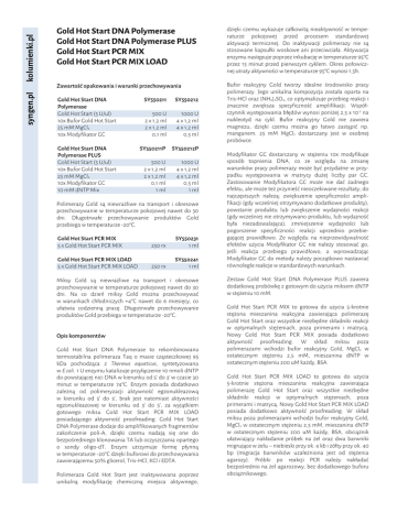 kolumienki.pl syngen.pl Gold Hot Start DNA Polymerase Gold Hot Start DNA Polymerase PLUS Gold Hot Start PCR MIX Gold Hot Start PCR MIX LOAD dzięki czemu wykazuje całkowitą nieaktywność w temperaturze pokojowej przed procesem standardowej aktywacji termicznej. Do inaktywacji polimerazy nie są stosowane kapsułki woskowe ani przeciwciała. Aktywacja enzymu następuje poprzez inkubację w temperaturze 95°C przez 15 minut przed pierwszym cyklem. Okres połowicznej utraty aktywności w temperaturze 95°C wynosi 1,5h. Zawartość opakowania i warunki przechowywania Bufor reakcyjny Gold tworzy idealne środowisko pracy polimerazy. Jego unikalna kompozycja została oparta na Tris-HCl oraz (NH4)2SO4, co optymalizuje przebieg reakcji i znacznie zwiększa specyficzność amplifikacji. Współczynnik występowania błędów wynosi poniżej 2,5 x 10-5 na nukleotyd na cykl. Bufor reakcyjny Gold nie zawiera magnezu, dzięki czemu można go łatwo zastąpić np. manganem. 25 mM MgCl2 dostarczany jest w osobnej probówce. Gold Hot Start DNA Polymerase Gold Hot Start (5 U/ul) 10x Bufor Gold Hot Start 25 mM MgCl2 10x Modyfikator GC Gold Hot Start DNA Polymerase PLUS Gold Hot Start (5 U/ul) 10x Bufor Gold Hot Start 25 mM MgCl2 10x Modyfikator GC 10 mM dNTP Mix SY550211 SY550212 500 U 2 x 1,2 ml 2 x 1,2 ml 0,1 ml 1000 U 4 x 1,2 ml 4 x 1,2 ml 0,5 ml SY550211P SY550212P 500 U 2 x 1,2 ml 2 x 1,2 ml 0,1 ml 1 ml 1000 U 4 x 1,2 ml 4 x 1,2 ml 0,5 ml 1 ml Polimerazy Gold są niewrażliwe na transport i okresowe przechowywanie w temperaturze pokojowej nawet do 30 dni. Długotrwałe przechowywanie produktów Gold przebiega w temperaturze -20°C. Gold Hot Start PCR MIX 5 x Gold Hot Start PCR MIX 250 rx SY550231 1 ml Gold Hot Start PCR MIX LOAD 5 x Gold Hot Start PCR MIX LOAD 250 rx SY550241 1 ml Miksy Gold są niewrażliwe na transport i okresowe przechowywanie w temperaturze pokojowej nawet do 30 dni. Na co dzień miksy Gold można przechowywać w warunkach chłodniczych +4°C nawet do 6 miesięcy, co ułatwia codzienną pracę. Długotrwałe przechowywanie produktów Gold przebiega w temperaturze -20°C. Opis komponentów Gold Hot Start DNA Polymerase to rekombinowana termostabilna polimeraza Taq o masie cząsteczkowej 95 kDa pochodząca z Thermus aquaticus, syntetyzowana w E.coli. 1 U enzymu katalizuje przyłączenie 10 nmoli dNTP do powstającej nici DNA w kierunku od 5' do 3' w czasie 30 minut w temperaturze 74°C. Enzym posiada dodatkowo zależną od polimeryzacji aktywność egzonukleazową w kierunku od 5’ do 3’, brak jest natomiast aktywności egzonukleazowej w kierunku od 3' do 5', za wyjątkiem gotowego miksu Gold Hot Start PCR MIX LOAD posiadającego aktywność proofreading. Gold Hot Start DNA Polymerase dodaje do amplifikowanych fragmentów zakończenie poli-A, dzięki czemu nadają się one do bezpośredniego klonowania TA lub oczyszczania opartego o sondy oligo-dT. Enzym utrzymuje formę płynną w temperaturze -20°C dzięki buforowi do przechowywania zawierającemu 50% glicerol, Tris-HCl, KCl i EDTA. Polimeraza Gold Hot Start jest inaktywowana poprzez unikalną modyfikację chemiczną miejsca aktywnego, Modyfikator GC dostarczany w stężeniu 10x modyfikuje sposób topnienia DNA, co ze względu na zmianę warunków pracy polimerazy może być przydatne w przypadku występowania w matrycy dużej liczby par GC. Zastosowanie Modyfikatora GC może nie dać żadnego efektu, ale może też przynieść nieoczekiwane rezultaty; do najczęstszych należą: zwiększenie specyficzności amplifikacji (gdy wcześniej otrzymywano dodatkowe produkty), powstanie produktu lub zwiększenie wydajności reakcji (gdy wcześniej nie otrzymywano produktu, lub wydajność była niezadowalająca), zmniejszenie wydajności lub pogorszenie specyficzności reakcji uprzednio przebiegającej prawidłowo. Ze względu na nieprzewidywalność efektów użycia Modyfikator GC nie należy stosować go, jeśli reakcja przebiega prawidłowo, a wprowadzając Modyfikator GC do metody należy początkowo nastawiać równolegle reakcje w standardowych warunkach. Zestaw Gold Hot Start DNA Polymerase PLUS zawiera dodatkową probówkę z gotowym do użycia miksem dNTP w stężeniu 10 mM. Gold Hot Start PCR MIX to gotowa do użycia 5-krotnie stężona mieszanina reakcyjna zawierająca polimerazę Gold Hot Start oraz wszystkie niezbędne składniki reakcji w optymalnych stężeniach, poza primerami i matrycą. Nowy Gold Hot Start PCR MIX posiada dodatkowo aktywność proofreading. W skład miksu poza polimerazami wchodzi bufor reakcyjny Gold, MgCl2 w ostatecznym stężeniu 2,5 mM, mieszanina dNTP w ostatecznym stężeniu 200 uM każdy, BSA. Gold Hot Start PCR MIX LOAD to gotowa do użycia 5-krotnie stężona mieszanina reakcyjna zawierająca polimerazę Gold Hot Start oraz wszystkie niezbędne składniki reakcji w optymalnych stężeniach, poza primerami i matrycą. Nowy Gold Hot Start PCR MIX LOAD posiada dodatkowo aktywność proofreading. W skład miksu poza polimerazami wchodzi bufor reakcyjny Gold, MgCl2 w ostatecznym stężeniu 2,5 mM, mieszanina dNTP w ostatecznym stężeniu 200 uM każdy, BSA, obciążnik ułatwiający nakładanie próbek na żel oraz dwa barwniki migrujące w żelu – niebieski przy ok. 4 kb i żółty przy ok. 40 bp (migracja barwników uzależniona jest od stężenia agarozy). Próbki po reakcji PCR należy nakładać bezpośrednio na żel agarozowy, bez dodatkowego buforu obciążnikowego. syngen.pl kolumienki.pl Procedura 2. Przygotować mastermiks reakcyjny zawierający wszystkie składniki podane w poniższej tabeli poza matrycowym DNA. Miks należy przygotować w ilości n+1, czyli o 1 większej, niż potrzeba na planowaną ilość próbek. Gold Hot Start DNA Polymerase Gold Hot Start DNA Polymerase PLUS Wszystkie kroki procedury zaleca się wykonywać na mokrym lodzie, jakkolwiek nie jest to bezwzględnie wymagane. 1. Wszystkie składniki należy całkowicie rozmrozić (o ile przechowywano je w -20°C)