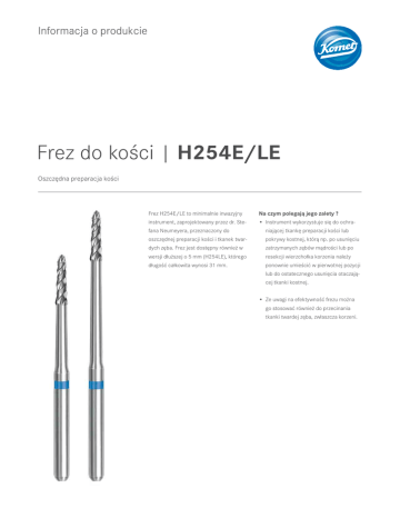 Informacja o produkcie Frez do kości | H254E/LE Oszczędna preparacja kości Frez H254E/LE to minimalnie inwazyjny Na czym polegają jego zalety ? instrument, zaprojektowany przez dr. Ste- • Instrument wykorzystuje się do ochra- fana Neumeyera, przeznaczony do niającej tkankę preparacji kości lub oszczędnej preparacji kości i tkanek twar- pokrywy kostnej, którą np. po usunięciu dych zęba. Frez jest dostępny również w zatrzymanych zębów mądrości lub po wersji dłuższej o 5 mm (H254LE), którego resekcji wierzchołka korzenia należy długość całkowita wynosi 31 mm. ponownie umieścić w pierwotnej pozycji lub do ostatecznego usunięcia otaczającej tkanki kostnej. • Ze uwagi na efektywność frezu można go stosować również do przecinania tkanki twardej zęba, zwłaszcza korzeni. Wskazania Wskazówki dot. stosowania: • Odsłanianie i przecinanie zatrzymanych • Rodzaj trzonka 314: zębów mądrości (80.000 rpm )100.000 rpm • Preparacja kości i pokrywy kostnej • Rodzaj trzonka 104/204/205: • Resekcja wierzchołka korzenia zęba (40.000 rpm )40.000 rpm • Pracować zawsze przy dostatecznym chłodzeniu zewnętrznym (min. 50 ml/m) • Pracować z niewielką siłą nacisku< 2N • Frezy H254E/LE.314 należy używać tylko w mikrosilniku (czerwona kątnica), nie używać w turbinie (niebezpieczeństwo wypadku) 6 mm H254E.314.012 H254LE.314.012 H254E.204.012 H254E.205.012 © 0812 · 410159V0 H254E.104.012 Komet Dental · Gebr. Brasseler GmbH & Co. KG · Postfach 160 · 32631 Lemgo · Export: Telefon +49 (0) 5261 701-0 · Telefax +49 (0) 5261 701-329 · [email protected] · www.kometdental.pl