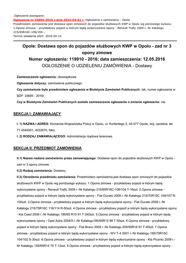 Ogłoszenie powiązane: Ogłoszenie nr 33695-2016 z dnia 2016-04-01 r. Ogłoszenie o zamówieniu - Opole Przedmiotem zamówienia jest dostawa opon zimowych do pojazdów służbowych KWP w Opolu wg poniższego wykazu: 1.Opona zimowa - przykładowy pojazd w którym będą wykorzystane opony - Renault Trafic 2009 r.-Nr Katalogu 215/65R16C-106/104... Termin składania ofert: 2016-04-14 Opole: Dostawa opon do pojazdów służbowych KWP w Opolu - zad nr 3 opony zimowe Numer ogłoszenia: 119910 - 2016; data zamieszczenia: 12.05.2016 OGŁOSZENIE O UDZIELENIU ZAMÓWIENIA - Dostawy Zamieszczanie ogłoszenia: obowiązkowe. Ogłoszenie dotyczy: zamówienia publicznego. Czy zamówienie było przedmiotem ogłoszenia w Biuletynie Zamówień Publicznych: tak, numer ogłoszenia w BZP: 33695 - 2016r. Czy w Biuletynie Zamówień Publicznych zostało zamieszczone ogłoszenie o zmianie ogłoszenia: nie. SEKCJA I: ZAMAWIAJĄCY I. 1) NAZWA I ADRES: Komenda Wojewódzka Policji w Opolu, ul. Korfantego 2, 45-077 Opole, woj. opolskie, tel. 77 4545001, 4222670, faks. I. 2) RODZAJ ZAMAWIAJĄCEGO: Administracja rządowa terenowa. SEKCJA II: PRZEDMIOT ZAMÓWIENIA II.1) Nazwa nadana zamówieniu przez zamawiającego: Dostawa opon do pojazdów służbowych KWP w Opolu zad nr 3 opony zimowe. II.2) Rodzaj zamówienia: Dostawy. II.3) Określenie przedmiotu zamówienia: Przedmiotem zamówienia jest dostawa opon zimowych do pojazdów służbowych KWP w Opolu wg poniższego wykazu: 1.Opona zimowa - przykładowy pojazd w którym będą wykorzystane opony - Renault Trafic 2009 r.-Nr Katalogu 215/65R16C-106/104 T-16szt. 2.Opona zimowa przykładowy pojazd w którym będą wykorzystane opony - Fiat Ducato 2009 r.-Nr Katalogu 215/70R15C 109/107 R100szt. 3.Opona zimowa - przykładowy pojazd w którym będą wykorzystane opony - Fiat Ducato 2009 r.-Nr Katalogu 215/75R16C 116/114 R-50szt. 4.Opona zimowa - przykładowy pojazd w którym będą wykorzystane opony - Kia Ceed 2009 r.-Nr Katalogu 195/65 R15 91 T-240szt. 5.Opona zimowa - przykładowy pojazd w którym będą wykorzystane opony - Opel Astra 2004/5 r.-Nr Katalogu185/65R15 88 T-50szt. 6.Opona zimowa - przykładowy pojazd w którym będą wykorzystane opony - Fiat Bravo 2009 r.-Nr Katalogu 205/55R16 91 T-40szt. 7.Opona zimowa - przykładowy pojazd w którym będą wykorzystane opony - WV T-4 2001 r.-Nr Katalogu 195/70R15C 104/102 S-30szt. 8.Opona zimowa - przykładowy pojazd w którym będą wykorzystane opony - Kia Picanto 2009 r.Nr Katalogu 155/65R14 75 T-12szt. 9.Opona zimowa - przykładowy pojazd w którym będą wykorzystane opony - Mercedes Sprinter 2012 r.-Nr Katalogu 235/65R16C 115/113 R-40szt. 10.Opona zimowa - przykładowy pojazd w którym będą wykorzystane opony - Nissan Pathfinder 2008 r. -Nr Katalogu 255/65 R17 110 T-8szt. 11.Opona zimowa - przykładowy pojazd w którym będą wykorzystane opony - Skoda Fabia 2002 r.-Nr Katalogu 165/70R14 81T-8szt Wymieniony asortyment, w czasie obowiązywania umowy, będzie zamawiany partiami nazywanymi jednorazowe zamówienie, Odbiór partii w ramach jednorazowego zamówienia będzie następował transportem własnym zamawiającego ze wskazanego przez Wykonawcę punktu znajdującego się w granicach administracyjnych miasta Opola lub Wykonawca dostarczy zamówione opony w terminie do trzech dni od zgłoszenia przesłanego telefaksem na numer Wykonawcy przez Zamawiającego na adres Wydziału Transportu Komendy Wojewódzkiej Policji w Opolu; ul. Oleska 95, 45-232 Opole. Opony w dniu odbioru nie mogą być starsze niż 12 m-cy licząc od dnia ich produkcji. Opony muszą posiadać europejską homologację WE. Opony muszą być objęte gwarancją min. 24 m-ce od daty zakupu. II.4) Wspólny Słownik Zamówień (CPV): 34.35.11.00-3. SEKCJA III: PROCEDURA III.1) TRYB UDZIELENIA ZAMÓWIENIA: Przetarg nieograniczony III.2) INFORMACJE ADMINISTRACYJNE Zamówienie dotyczy projektu/programu finansowanego ze środków Unii Europejskiej: nie SEKCJA IV: UDZIELENIE ZAMÓWIENIA IV.1) DATA UDZIELENIA ZAMÓWIENIA: 26.04.2016. IV.2) LICZBA OTRZYMANYCH OFERT: 4. IV.3) LICZBA ODRZUCONYCH OFERT: 0. IV.4) NAZWA I ADRES WYKONAWCY, KTÓREMU UDZIELONO ZAMÓWIENIA: MOTOR Marcin Lenarciak, ul. Kopernika 93, 15-396 Białystok, kraj/woj. podlaskie. IV.5) Szacunkowa wartość zamówienia (bez VAT): 113993,43 PLN. IV.6) INFORMACJA O CENIE WYBRANEJ OFERTY ORAZ O OFERTACH Z NAJNIŻSZĄ I NAJWYŻSZĄ CENĄ Cena wybranej oferty: 107997,00 Oferta z najniższą ceną: 107997,00 / Oferta z najwyższą ceną: 130933,50 Waluta: PLN .