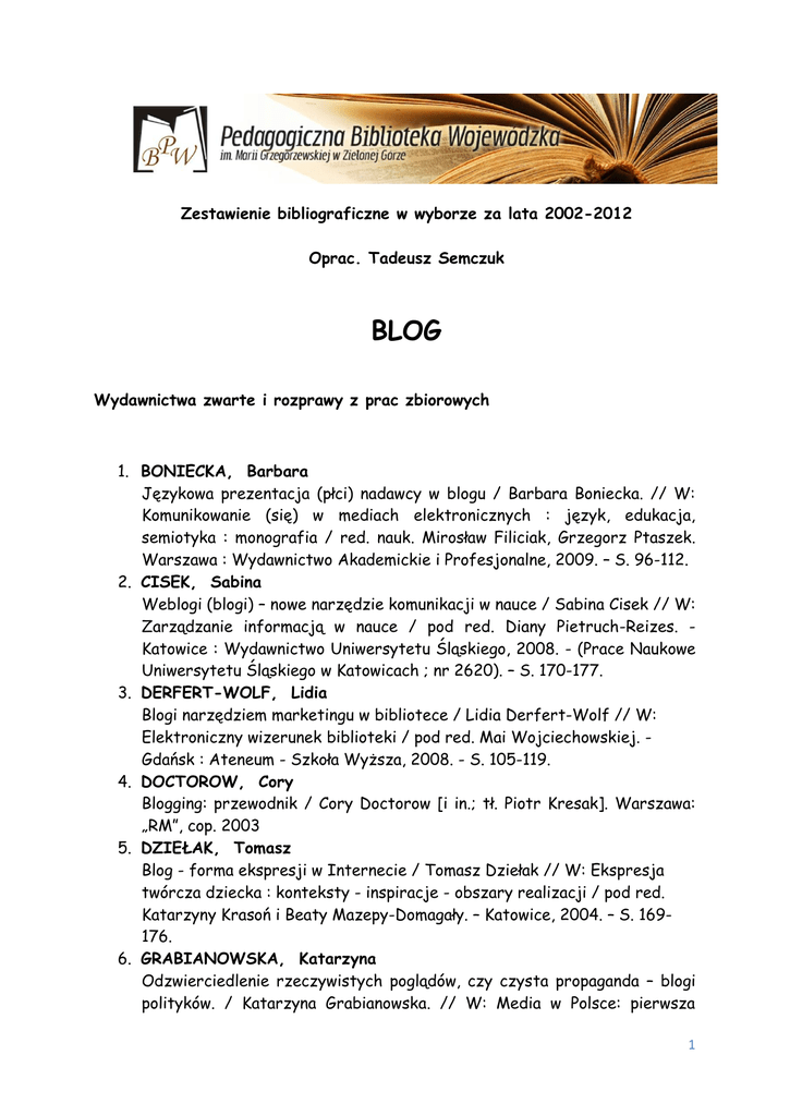 Zestawienie bibliograficzne w wyborze za lata 2002-2012 Oprac. Tadeusz Semczuk BLOG Wydawnictwa zwarte i rozprawy z prac zbiorowych 1. BONIECKA, Barbara Językowa prezentacja (płci) nadawcy w blogu / Barbara Boniecka. // W: Komunikowanie (się) w mediach elektronicznych : język, edukacja, semiotyka : monografia / red. nauk. Mirosław Filiciak, Grzegorz Ptaszek. Warszawa : Wydawnictwo Akademickie i Profesjonalne, 2009. – S. 96-112. 2. CISEK, Sabina Weblogi (blogi) – nowe narzędzie komunikacji w nauce / Sabina Cisek // W: Zarządzanie informacją w nauce / pod red. Diany Pietruch-Reizes. Katowice : Wydawnictwo Uniwersytetu Śląskiego, 2008. - (Prace Naukowe Uniwersytetu Śląskiego w Katowicach ; nr 2620). – S. 170-177. 3. DERFERT-WOLF, Lidia Blogi narzędziem marketingu w bibliotece / Lidia Derfert-Wolf // W: Elektroniczny wizerunek biblioteki / pod red. Mai Wojciechowskiej. Gdańsk : Ateneum - Szkoła Wyższa, 2008. - S. 105-119. 4. DOCTOROW, Cory Blogging: przewodnik / Cory Doctorow [i in.; tł. Piotr Kresak]. Warszawa: „RM”, cop. 2003 5. DZIEŁAK, Tomasz Blog - forma ekspresji w Internecie / Tomasz Dziełak // W: Ekspresja twórcza dziecka : konteksty - inspiracje - obszary realizacji / pod red. Katarzyny Krasoń i Beaty Mazepy-Domagały. – Katowice, 2004. – S. 169176. 6. GRABIANOWSKA, Katarzyna Odzwierciedlenie rzeczywistych poglądów, czy czysta propaganda – blogi polityków. / Katarzyna Grabianowska. // W: Media w Polsce: pierwsza 1 władza IV RP? / red. nauk. Marek Sokołowski. Warszawa: Wydawnictwo Akademickie i Profesjonalne, 2007. – S. 275-280. 7. Hofman, Iwona Blogi polityczne – nowa formuła komunikatu i komentarza / Iwona Hofman.// W: Media dawne i współczesne. T. 2 : praca zbiorowa / pod red. Bogumiły Kosmanowej. Poznań : Wydaw. Nauk. INP i Dziennikarstwa Uniwersytet im. A. Mickiewicza,2007.– S.169-185. 8. LEVINSON, Paul Nowe nowe media / Paul Levinson ; przekł. Maria Zawadzka. Kraków: Wydawnictwo WAM, 2010 9. LIPIEC, Paweł Jak stworzyć najlepszy blog : WordPress 2.0 / Paweł Lipiec, Łukasz Sosna. Warszawa: Wydawnictwo Naukowe PWN: Mikom, 2007 10. ŁĘSKI, Paweł Blogosfera czy ,,błogo sfera” – słów kilka o naturalnej sztuczności blogów / Zbigniew Łęski, Zbigniew Wieczorek.// W: Oblicza Internetu : architektura komunikacyjna sieci / red. nauk. Marek Sokołowski. Elbląg: Państwowa Wyższa Szkoła Zawodowa, 2007. – S. 279-289. 11. MAZUREK, Grzegorz Blogi i wirtualne społeczności – wykorzystanie w marketingu / Grzegorz Mazurek. Kraków ; Warszawa: Wolters Kluwer Polska, 2008 12. MICHALAK, Anna Społeczne uwarunkowania zjawiska blogów / Anna Michalak.// W: Przestrzenie wizualne i akustyczne człowieka : antropologia audiowizualna jako przedmiot i metoda badań / red. Agnieszka Janiak [i in.]. Wrocław: Wydawnictwo Naukowe Dolnośląskiej Szkoły Wyższej Edukacji TWP, 2007 – S. 316-328. 13. PEZDA, Aleksandra Koniec epoki kredy / : [YouTube, Facebook, blogi, Wiki w klasie] / Aleksandra Pezda. Warszawa: Agora, 2011 14. RETTBERG, Jill Walker Blogowanie / Jill Walker Rettberg. Warszawa: Wydawnictwo Naukowe PWN, 2012 15. SEUL-MICHAŁOWSKA, Sylwia Blog adolescenta jako przejaw radzenia sobie z trudnościami / Sylwia Seul-Michałowska // W: Studia z Psychologii w Katolickim Uniwersytecie Lubelskim. – T.16 (2010), S. 41-55. 16. SEUL-MICHAŁOWSKA, Sylwia Świat społeczny w blogu nastolatka / Sylwia Seul - Michałowska.// W: Człowiek, rodzina, kultura : szkice psychologiczne / pod red. Heleny 2 Wrony-Polańskiej. Kraków : Wydawnictwo Naukowe Uniwersytetu Pedagogicznego, 2008. – S. 156-164. 17. SEUL-MICHAŁOWSKA, Sylwia Wizerunek innej osoby kreowany w blogu gimnazjalisty / Sylwia Seul Michałowska.// W: (Kon)teksty kultury medialnej: analizy i interpretacje. T. 1 / red. nauk. Marek Sokołowski. Olsztyn: Uniwersytet WarmińskoMazurski: „Algraf”, 2007 – S. 279-289. 18. SUSKA, Dorota Ekshibicjonizm blogowy jako kategoria kulturowo-językowa / Dorota Suska.// W: (Kon)teksty kultury medialnej: analizy i interpretacje. T. 1 / red. nauk. Marek Sokołowski. Olsztyn: Uniwersytet Warmińsko-Mazurski: „Algraf”, 2007 – S. 291-304. 19. ŚLIWERSKI, Bogusław Ped@gog w blogosferze / Bogusław Śliwerski. Kraków : ,,Impuls”, 2008 20. ŚWIĄTKIEWICZ-MOŚNY, Maria Papież umiera na blogu: analiza zapisków w pamiętnikach internetowych po śmierci Jana Pawła II / Maria Świątkiewicz-Mośny // W: Teologia Praktyczna. – T. 7, 2006, S. 89-106. 21. TURSKA-KAWA, Agnieszka „Słowo się rzekło”. Analiza psychologiczno-lingwistyczna bloga Jerzego Bralczyka / Agnieszka Turska-Kawa, Magdalena Ślawska.// W: Komunikowanie (się) w mediach elektronicznych : język, edukacja, semiotyka : monografia / red. nauk. Mirosław Filiciak, Grzegorz Ptaszek. Warszawa : Wydawnictwo Akademickie i Profesjonalne, 2009. – S. 79-95. 22. WIĘCKIEWICZ, Marta Blogowanie jako nowa forma aktywności. Różne oblicza polskiej blogosfery / Marta Więckiewicz.// W: Homo creator czy homo ludens? : twórcy – internauci – podróżnicy / red. nauk. Wojciech Muszyński [i in.]. Toruń : Wydaw. Adam Marszałek, 2008. – S.187-198. 23. WRIGHT, Jeremy Blogowanie w biznesie: rewolucyjny sposób na zwiększenie sprzedaży, zbudowanie marki i osiągnięcie spektakularnych sukcesów / Jeremy Wright. Warszawa: Wydawnictwo Akademickie i Profesjonalne, 2007 24. WRYCZA, Joanna Galaktyka języka Internetu / Joanna Wrycza. Gdynia: Novae Res, 2008 25. ZABAWA, Marcin „My blogasek bierze udział w konQursie”. Czy polskie blogi internetowe są pisane po polsku? // W: Komunikowanie (się) w mediach elektronicznych : 3 język, edukacja, semiotyka : monografia / red. nauk. Mirosław Filiciak, Grzegorz Ptaszek. Warszawa : Wydawnictwo Akademickie i Profesjonalne, 2009. - S.60-78. 26. ZWIEFKA-CHWAŁEK, Agnieszka Blogi jako przejaw funkcjonowania inteligencji otwartej – uwarunkowania i bariery / Agnieszka Zwiefka-Chwałek // W: Media, język, literatura : korespondencje 
