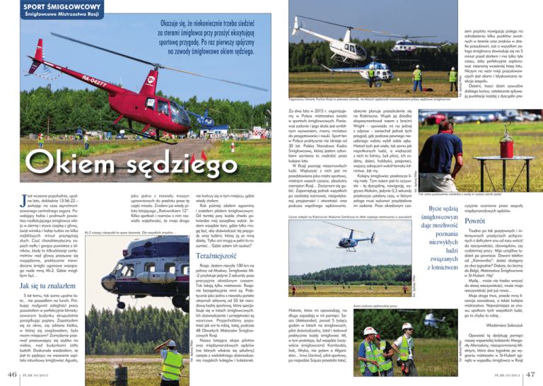 SPORT ŚMIGŁOWCOWY Śmigłowcowe Mistrzostwa Rosji fot. Jędrzej Wiler Okazuje się, że niekoniecznie trzeba siedzieć za sterami śmigłowca przy przeżyć ekscytującą sportową przygodę. Po raz pierwszy spójrzmy na zawody śmigłowcowe okiem sędziego. jako jedna z niewielu maszyn uprawnionych do przelotu przez tę część miasta. Znałem już wtedy pilota latającego „Ratownikiem 12”. Kilka spotkań i rozmów z nim rozwiało wątpliwości, że moja droga nie kończy się w tym miejscu, gdzie wtedy stałem. Rok później zdałem egzaminy i zostałem pilotem śmigłowcowym. Od tamtej pory każda chwila potwierdza mój szczęśliwy wybór. Jestem wszędzie tam, gdzie tylko mogę być, aby doświadczać tej przygody wraz ludźmi, którzy ją ze mną dzielą. Tylko oni mogą w pełni to rozumieć... Gdzie zatem ich szukać? Mi-2 wiszący nieopodal to spore doznanie. Dla wszystkich zmysłów... 5 lat temu, tak samo upalne lato... nie poszedłem na lunch. Próbując nadgonić zaległości pracy pozostałem w perfekcyjnie klimatyzowanym budynku skrupulatnie porządkując papiery. Zapatrzyłem się za okno, czy szklana klatka, w której się znajdowałem, była moim miejscem? Zamyślenie przerwał przesuwający się szybko na niebie, nad budynkami żółty kształt. Doskonale wiedziałem, że jest to pędzący na wezwanie szpitala ratunkowy śmigłowiec Agusta, 46 PLAR 10/2013 fot. Jędrzej Wiler Jak się tu znalazłem cyzyjnie ocenione przez zespoły międzynarodowych sędziów. Bycie sędzią śmigłowcowym daje możliwość poznania niezwykłych ludzi związanych z lotnictwem Liczne nalepki na Robinsonie Maksima Sotnikowa to efekt częstego startowania w zawodach Teraźniejszość Rosja. Jestem niecałe 100 km na północ od Moskwy. Śmigłowiec Mi-2 przylatuje jedyne 2 sekundy poza precyzyjnie określonym czasem. Tak latają tylko mistrzowie. Rosjanie bezapelacyjnie nimi są. Praktycznie jako jedno z niewielu państw utrzymali aktywną od 55 lat narodową kadrę sportową, która specjalizuje się w lotach śmigłowcowych. Ich doświadczenie i umiejętności są wzorcowe. Przyjechaliśmy popatrzeć jak oni to robią, tutaj, podczas 48 Otwartych Mistrzostw Śmigłowcowych Rosji. Nasza latająca ekipa pilotów oraz międzynarodowych sędziów (na których właśnie się szkolimy) czerpie z wieloletniego doświadczenia rosyjskich kolegów i koleżanek. Tak celne postawienie wiaderka z wodą to wyższa szkoła jazdy! Powrót Trudno po tak pozytywnych i intensywnych przeżyciach połączonych z deficytem snu od razu wrócić do rzeczywistości, obowiązków, czy codziennej pracy. Mija uciążliwy tydzień po powrocie. Dzwoni telefon od „Kierownika”: Jesteś dostępny za dwa tygodnie? Dobrze, bo lecimy do Belgii, Mistrzostwa Śmigłowcowe w St-Hubert. Hej! Myślę... może nie trzeba wracać do starej rzeczywistości, może moja rzeczywistość jest już nowa... Moja droga trwa, przede mną licencja zawodowa, a także kolejne mistrzostwa. Najważniejsze ze znowu spotkam tych wszystkich ludzi, po to chyba to robię... fot. Jędrzej Wiler J est wczesne popołudnie, upalne lato, dokładnie 13:56:22 – zerkając na czas zsynchronizowanego centralnego zegara. Powalający hałas i podmuch powietrza nadlatującego śmigłowca wbija w ziemię i zrywa czapkę z głowy, świst wirnika i hałas turbin na kilka najbliższych minut przytępiają słuch. Czuć charakterystyczny zapach nafty i gorące powietrze z silników, kiedy to kilkadziesiąt centymetrów nad głową przesuwa się rozpędzone, praktycznie niewidoczne śmigło ogonowe wiszącego nade mną Mi-2. Gdzie mógłbym być... obecnie planuje przeszkolenie się na Robinsona. Wujek jej dziadka eksperymentował razem z braćmi Wright – opowiada mi na jednej z odpraw – zaniechał jednak tych przygód, gdy podczas pewnego nieudanego wzlotu wybił sobie zęby. Historii tych jest wiele, tak samo jak napotkanych ludzi, a większość z nich to lotnicy, byli piloci, ich rodziny, dzieci, hobbyści, pasjonaci, wszyscy zakręceni wokół tematu lotnictwa. Jak my. Kolejny śmigłowiec przekracza linię mety. Tym razem jest to oczywiste – tę dyscyplinę, nawigację, wygrywa Maksim, jedynie 0,3 sekundy przekracza ustalony czas, w którym załoga musi wykonać przydzielone im zadanie. Poza określonym cza- Historie, które mi opowiadają, na długo zapadają w mi pamięci. Sasza (Aleksander), ponad 5 tysięcy godzin w lotach na śmigłowcach, pilot doświadczalny, latał i testował praktycznie każdy śmigłowiec Mi, w tym prototypy, był wszędzie (oczywiście śmigłowcami) Kambodża, Irak, Afryka, nie pytam o Afganistan... Inna (Janina), pilot sportowy, po rozpadzie Sojuza przestała latać, Autor podczas sędziowskiej pracy Włodzimierz Sidorczuk fot. Jędrzej Wiler Okiem sędziego Za dwa lata w 2015 r. organizujemy w Polsce mistrzostwa świata w sportach śmigłowcowych. Ponieważ zadanie i jego skala jest ambitnym wyzwaniem, mamy mnóstwo do przygotowania i nauki. Sport ten w Polsce praktycznie nie istnieje od 30 lat. Polska Narodowa Kadra Śmigłowcowa, której jestem członkiem zamierza to nadrobić przez kolejne lata. W Rosji poznaję niesamowitych ludzi. Większość z nich jest mi przedstawiana jako mistrz sportowy, mistrzyni wszech czasów, absolutny czempion Rosji... Zaczynam się gubić. Zapamiętuję jednak wszystkich po osobistej rozmowie, niespotykanej przyjazności i otwartości oraz podczas wspólnego sędziowania. fot. Jędrzej Wiler Tegoroczny Otwarty Puchar Rosji to pierwsze zawody, na których sędziowali nowowyszkoleni polscy sędziowie śmigłowcowi sem przylotu nawigacja polega na odnalezieniu kilku punktów zwrotnych w terenie oraz znaków w strefie poszukiwań, zaś o wszystkim załoga śmigłowca dowiaduje się na 5 minut przed startem i ma tylko tyle czasu, żeby perfekcyjnie zaplanować nieznaną wcześniej trasę lotu. Niczym na wzór misji poszukiwawczych jest alarm i błyskawiczna reakcja zespołu. Ostatni