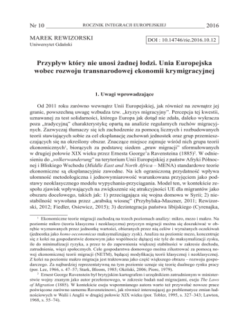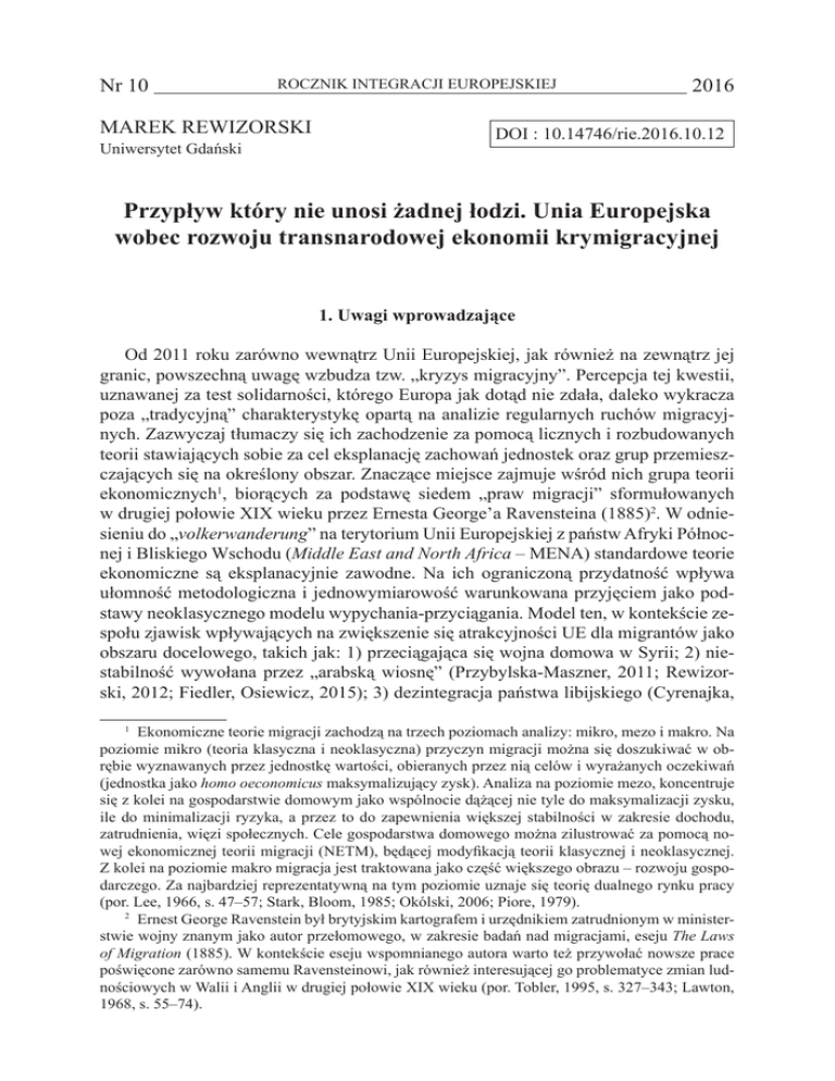 Nr 10 ROCZNIK INTEGRACJI EUROPEJSKIEJ MAREK REWIZORSKI Uniwersytet Gdański 2016 DOI : 10.14746/rie.2016.10.12 Przypływ który nie unosi żadnej łodzi. Unia Europejska wobec rozwoju transnarodowej ekonomii krymigracyjnej 1. Uwagi wprowadzające Od 2011 roku zarówno wewnątrz Unii Europejskiej, jak również na zewnątrz jej granic, powszechną uwagę wzbudza tzw. „kryzys migracyjny”. Percepcja tej kwestii, uznawanej za test solidarności, którego Europa jak dotąd nie zdała, daleko wykracza poza „tradycyjną” charakterystykę opartą na analizie regularnych ruchów migracyjnych. Zazwyczaj tłumaczy się ich zachodzenie za pomocą licznych i rozbudowanych teorii stawiających sobie za cel eksplanację zachowań jednostek oraz grup przemieszczających się na określony obszar. Znaczące miejsce zajmuje wśród nich grupa teorii ekonomicznych1, biorących za podstawę siedem „praw migracji” sformułowanych w drugiej połowie XIX wieku przez Ernesta George’a Ravensteina (1885)2. W odniesieniu do „volkerwanderung” na terytorium Unii Europejskiej z państw Afryki Północnej i Bliskiego Wschodu (Middle East and North Africa – MENA) standardowe teorie ekonomiczne są eksplanacyjnie zawodne. Na ich ograniczoną przydatność wpływa ułomność metodologiczna i jednowymiarowość warunkowana przyjęciem jako podstawy neoklasycznego modelu wypychania-przyciągania. Model ten, w kontekście zespołu zjawisk wpływających na zwiększenie się atrakcyjności UE dla migrantów jako obszaru docelowego, takich jak: 1) przeciągająca się wojna domowa w Syrii; 2) niestabilność wywołana przez „arabską wiosnę” (Przybylska-Maszner, 2011; Rewizorski, 2012; Fiedler, Osiewicz, 2015); 3) dezintegracja państwa libijskiego (Cyrenajka, 1 Ekonomiczne teorie migracji zachodzą na trzech poziomach analizy: mikro, mezo i makro. Na poziomie mikro (teoria klasyczna i neoklasyczna) przyczyn migracji można się doszukiwać w obrębie wyznawanych przez jednostkę wartości, obieranych przez nią celów i wyrażanych oczekiwań (jednostka jako homo oeconomicus maksymalizujący zysk). Analiza na poziomie mezo, koncentruje się z kolei na gospodarstwie domowym jako wspólnocie dążącej nie tyle do maksymalizacji zysku, ile do minimalizacji ryzyka, a przez to do zapewnienia większej stabilności w zakresie dochodu, zatrudnienia, więzi społecznych. Cele gospodarstwa domowego można zilustrować za pomocą nowej ekonomicznej teorii migracji (NETM), będącej modyfikacją teorii klasycznej i neoklasycznej. Z kolei na poziomie makro migracja jest traktowana jako część większego obrazu – rozwoju gospodarczego. Za najbardziej reprezentatywną na tym poziomie uznaje się teorię dualnego rynku pracy (por. Lee, 1966, s. 47–57; Stark, Bloom, 1985; Okólski, 2006; Piore, 1979). 2 Ernest George Ravenstein był brytyjskim kartografem i urzędnikiem zatrudnionym w ministerstwie wojny znanym jako autor przełomowego, w zakresie badań nad migracjami, eseju The Laws of Migration (1885). W kontekście eseju wspomnianego autora warto też przywołać nowsze prace poświęcone zarówno samemu Ravensteinowi, jak również interesującej go problematyce zmian ludnościowych w Walii i Anglii w drugiej połowie XIX wieku (por. Tobler, 1995, s. 327–343; Lawton, 1968, s. 55–74). 192 Marek Rewizorski RIE 10 ’16 Trypolitania, Fezzan); 4) wycofanie międzynarodowych wojsk z Afganistanu i rebelie w państwach Afryki Subsaharyjskiej, jest mało użyteczny. Jednocześnie nasilanie się nieregularnych migracji3, jest uznawane przez europejskich decydentów za kluczowy problem polityczny. Zasadniczy wpływ na jego percepcję przez establishment polityczny ma nacisk opinii publicznej postrzegającej migrantów z Afryki Północnej i Bliskiego Wschodu za poważne zagrożenie. Świadczą o tym liczne badania opinii publicznej, w tym także te, które dokonywane były przed erupcją „kryzysu migracyjnego”. Według The Transatlantic Trends: Immigration 2010, w którym prześledzono opinie respondentów z ośmiu państw (Francja, Hiszpania, Holandia, Kanada, Niemcy, Włochy, Stany Zjednoczone, Wielka Brytania), w państwach europejskich nielegalną/nieregularną migrację uznano za jeden z najpoważniejszych problemów. W wyżej wskazanym badaniu ok. 33% Brytyjczyków wyraziło przekonanie, że napływ migrantów sprzyja zwiększeniu wskaźnika przestępczości. Podobnego zdania było 46% badanych Niemców i 56% Włochów (GMFUS, 2011). Podobne wyniki przyniosły badania przeprowadzone w 2009 roku przez Komisję Europejską. Ponad 30% pytanych Europejczyków uznało migrację za jeden z trzech najważniejszych problemów, z którymi musi zmierzyć się Unia Europejska (EC, 2009). Pomimo niemal powszechnego przeświadczenia o wadze problemu migracyjnego, w UE jak dotąd nie udało się osiągnąć konsensusu w zakresie wypracowania wspólnego podejścia do migracji, zwłaszcza nieregularnej. Nie służyły temu dane, zgodnie z którymi nieregularne migracje na obszar UE-15 w ubiegłej dekadzie wpisywały się w trend spadkowy. Został on potwierdzony m.in. w analizach prowadzonych przez wyspecjalizowane komórki agencji Frontex (Frontex Risk Analysis Network – FRAN). Ewentualne, „punktowe” wzmożenie napływu nieregularnych migrantów na obszar Schengen tłumaczono lokalną dostępnością miejsc pracy przeznaczonych dla nisko wykwalifikowanych pracowników. Generalną (i dość uspokajającą opinię publiczną) tendencję spadkową oraz „punktowe” wzmaganie się dynamiki przepływów migracyjnych stanowiące wyjątek od reguły, wyrażał jeden z istotniejszych raportów Frontexu z 2009 roku. Stwierdzono w nim: „Obecnie spadający trend migracji nielegalnej generuje rodzaj przerwy czy odroczenia odnośnie do migracji nieautoryzowanych, który zakończy się, kiedy popyt na pracę w państwach członkowskich zacznie rosnąć” (Frontex, 2009). W raporcie tym zwrócono uwagę, że wyraźny 