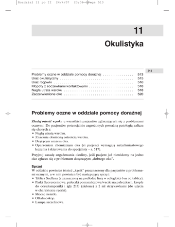 Rozdzial 11 po II 24/4/07 23:08 Page 513 11 Okulistyka 513 Problemy oczne w oddziale pomocy doraênej . . . . . . . . . . . . . . . . Uraz okulistyczny . . . . . . . . . . . . . . . . . . . . . . . . . . . . . . . . . . . . . . Uraz rogówki . . . . . . . . . . . . . . . . . . . . . . . . . . . . . . . . . . . . . . . . . K∏opoty z soczewkami kontaktowymi . . . . . . . . . . . . . . . . . . . . . . . Nag∏a utrata wzroku . . . . . . . . . . . . . . . . . . . . . . . . . . . . . . . . . . . . Zaczerwienione oko . . . . . . . . . . . . . . . . . . . . . . . . . . . . . . . . . . . . 513 515 516 518 518 520 Problemy oczne w oddziale pomocy doraênej Zbadaj ostroÊç wzroku u wszystkich pacjentów zg∏aszajàcych si´ z problemami ocznymi. Do pacjentów potencjalnie zagro˝onych powa˝nà patologià zalicza si´ chorych z: • Nag∏à utratà wzroku. • Znacznie obni˝onà ostroÊcià wzroku. • Drà˝àcym urazem oka. • Oparzeniem chemicznym oka (ci pacjenci wymagajà natychmiastowego leczenia i skierowania do specjalisty – s. 517). Przyjmij zasad´ anga˝owania okulisty, jeÊli pacjent ju˝ niewidomy na jedno oko zg∏asza si´ z problemem dotyczàcym „dobrego oka”. Sprz´t W oddziale powinien istnieç „kàcik” przeznaczony dla pacjentów z problemami ocznymi, a w nim powinien byç nast´pujàcy sprz´t: • Tablica Snellena (z zaznaczonà na pod∏odze linià w odleg∏oÊci 6 m od tablicy). • Paski fluoresceinowe, pa∏eczki pomaraƒczowe/waciki na pa∏eczkach, krople do oczu/tamponiki i ig∏y 21G (zielone) z 2 ml strzykawkami (do u˝ycia w charakterze ràczki). • Mocne Êwiat∏o. • Oftalmoskop. • Lampa szczelinowa. Rozdzial 11 po II 24/4/07 23:08 Page 514 Wywiad Ustal czas i szybkoÊç pojawienia si´ problemu. JeÊli pacjent ma skomplikowanà przesz∏oÊç okulistycznà, postaraj si´ wydostaç dawne historie chorób lub porozmawiaç z lekarzem domowym. Badanie OstroÊç wzroku jest kluczem do badania okulistycznego: zbadaj jà w pierwszej kolejnoÊci. 514 Brak zapisu ostroÊci wzroku mo˝e byç uznany za zaniedbanie U˝yj tablicy Snellena, poleç odczytywanie jej z odleg∏oÊci 6 m, dla ka˝dego oka oddzielnie. Pozwól pacjentowi w∏o˝yç okulary, jeÊli je ma i jeÊli nie sà to okulary typu „szpilkowaty otwór”. OstroÊç wzroku wyra˝a si´ jako: Odleg∏oÊç od tablicy w m/numer linii na tablicy (prawid∏owa ostroÊç wynosi 6/6). Na przyk∏ad pacjent, którego ostroÊç wzroku zosta∏a zanotowana jako „oko prawe 6/5; oko lewe 6/60”, mo˝e przeczytaç dolnà lini´ okiem prawym, ale okiem lewym – tylko górnà lini´. JeÊli pacjent odczytuje dodatkowo litery z linii po∏o˝onej ni˝ej, zapisz to jako „+ liczba liter dodatkowych” (na przyk∏ad 6/12 +2). Podprowadê pacjenta, który nie mo˝e odczytaç liter z odleg∏oÊci 6 m bli˝ej, a˝ b´dzie móg∏ przeczytaç (na przyk∏ad 3/60 = odczytanie najwy˝ej umieszczonej linii z odleg∏oÊci 3 m). Bardzo z∏a ostroÊç: spróbuj liczenia palców lub rozpoznawania ruchów r´ki z odleg∏oÊci 1 m lub sprawdê poczucie Êwiat∏a. JeÊli nie jest dost´pna pe∏na tablica Snellena, alternatywnie mo˝na u˝yç tablicy do trzymania w r´ce w odleg∏oÊci 30 cm – zdolnoÊç czytania drobnego druku Êwiadczy o normalnej ostroÊci wzroku dla danego oka (patrz ilustracja na koƒcu ksià˝ki). èrenice Zapisz szerokoÊç êrenic, odpowiedzi bezpoÊrednie i odruchowe na Êwiat∏o oraz nastawienie. Ruchy oka Sprawdê ca∏y zakres i zapytaj o dwojenie. Sprawdê oczoplàs. Pole widzenia Uwa˝na ocena jest konieczna u pacjentów z utratà wzroku. Badanie dna oka W zaciemnionym pomieszczeniu zbadaj obecnoÊç czerwonego odblasku, oceƒ tarcz´ nerwu wzrokowego, poszukuj krwotoku do siatkówki i nieprawid∏owoÊci naczyƒ. Ocena bezpoÊrednia W mocnym oÊwietleniu przyjrzyj si´, czy nie ma zapalenia, wycieku lub cia∏a obcego. Badanie podpowiekowe JeÊli podejrzewasz cia∏o obce, odwróç górnà powiek´ przy pomocy pa∏eczki pomaraƒczowej, podczas gdy pacjent kieruje wzrok w dó∏. Badanie w lampie szczelinowej Pozwala dok∏adnie obejrzeç spojówk´, rogówk´ i komor´ przednià. Barwienie fluoresceinà ujawnia nieprawid∏owoÊci rogówki, zw∏aszcza gdy oglàda si´ oko w Êwietle niebieskim. Rozdzial 11 po II 24/4/07 23:08 Page 515 Okulistyka CiÊnienie wewnàtrzga∏kowe Ocena liczbowa jest nierzetelna. Pozostaw oficjalny pomiar ciÊnienia wewnàtrzga∏kowego specjaliÊcie. T´tnice skroniowe JeÊli bierzesz pod uwag´ zapalenie t´tnic skroniowych, obmacaj je i sprawdê ich tkliwoÊç (s. 118). Uraz okulistyczny Niezb´dne jest dok∏adne zebranie wywiadu. Zorientuj si´, czy do ga∏ki ocznej mog∏o dostaç si´ ma∏e, w´drujàce z du˝à szybkoÊcià cia∏o obce (na przyk∏ad przy mieleniu, kuciu lub d∏utowaniu). Zapytaj, czy u˝ywano okularów ochronnych. W pewnych sytuacjach kurcz powiek mo˝e uniemo˝liwiaç skuteczne badanie. Mo˝na zastosowaç krople zawierajàce Êrodek miejscowo znieczulajàcy (1 lub 2 krople 1% ametokainy lub 0,4% oksybuprokainy), ale pacjent b´dzie wymaga∏ po konsultacji zas∏oni´cia oka (˝eby zapobiec prowadzeniu samochodu) do czasu powrotu czucia: zazwyczaj co najmniej na 4 godziny. Nigdy nie dawaj pacjentowi do domu kropli ze Êrodkiem miejscowo znieczulajàcym. Urazy oka drà˝àce Brak podejrzenia i rozpoznania tego urazu mo˝e mieç powa˝ne konsekwencje. Rozpoznanie mo˝e nie byç oczywiste. Szukaj rany punktowej/wlotowej na obu stronach powiek, rogówce i twardówce. Rany rogówkowo-twardówkowe cz´sto sà po∏o˝one na dole, z powodu zwrócenia ga∏ki ocznej ku górze, gdy pacjent mru˝y oczy. Inne objawy drà˝enia to: pogorszenie ostroÊci wzroku, zniekszta∏cenie êrenicy, brak przejrzystoÊci struktur oka, w tym krwawienie do przedniej komory oka (krwistek) lub do komory tylnej (krwotok do szklistki). Krwistek jest widoczny jako poziom p∏ynu w komorze przedniej u pacjenta w pozycji pionowej. Krwistek powodu