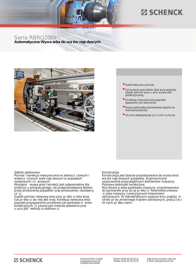Seria RBRQ200x Automatyczna Wywa arka do wa ów nap dowych • Automatyczny pomiar; • Symulacja warunków dzia ania poprzez szybki pomiar przy u yciu wywa arki podkrytycznej; • Korekcja niewywa enia poprzez spawanie lub wiercenie; • Nowa jednostka pomiarowa oparta na mikroprocesorze; • Os ona zabezpieczaj ca i t umi ca ha as. Zakres zastosowa Pomiar i korekcja niewywa enia w jednocz ciowym i wielocz ciowym wale nap dowym w pojazdach osobowych i ci arowych. Wydajno wywa ania i korekcji jest odpowiednia dla przemys u produkcyjnego, do przeprowadzania testów przez producenta pojazdów oraz producenta i dostawcy cz ci. Szybki pomiar niewywa enia przy pr dko ci dzia ania, lub pr dko ci do niej zbli onej. Korekcja niewywa enia poprzez przyspawanie punktowe lub garbowe ci arów korekcyjnych. U ywana jest metoda spawania przy u yciu pól redniej cz stotliwo ci. Konstrukcja Konstrukcja jest dobrze przystosowana do wywa enia wa ów nap dowych pojazdów. Ergonomiczne usytuowanie poszczególnych elementów maszyny. Pionowe jednostki korekcyjne. Wyj tkowo p aska podstawa maszyny, przystosowana do pomiarów przy du ej pr dko ci. Równokierunkowo o yska maszyny z precyzyjnymi trzpieniami obrotowymi. W standardowym wyposa eniu znajduj si silniki pr du zmiennego trzpieni obrotowych, pracuj ce z ró nymi pr dko ciami. Schenck RoTec GmbH Landwehrstrasse 55 D-64293 Darmstadt Telefon (0 61 51) 32 23 11 Telefax (0 61 51) 32 23 15 http://www.schenck-rotec.de E-Mail [email protected] Seria RBRQ200x Automatyczna Wywa arka do wa ów nap dowych Fully symmetrical bearing pedestal with hard-bearing suspension system and precision spindle.Tooling adapters with spring actuating clamping device (pneumatic unclamping) can be supplied. Patented single-station quadruple welding unit.Integrated heavy duty safety devices to secure the drive shaft during rotation. These allow adjustment of the support pedestals to accommodate very short shafts. Rollers built into the safety devices as loading aids are automatically retracted before the measuring run. Standard protective safety guarding in modular elements with laminated plates for burst and noise protection. Quick acting pneumatic actuation of the large horizontally opening doors.Camera and monitor replace viewing windows. Microprocessor-controlled measurement equipment with monitor for optimal calculation of the correction weights and direct display.Digital measurement technique with high frequency-selectivity.Electrical compensation for residual tooling unbalance and clamping eccentricity. Other special features: Large display, operator prompting, diagnostic program, fault display, statistics program and printer interface. Measurement equipment prepared for remote diagnosis via interface. Schenck RoTec GmbH Landwehrstrasse 55 D-64293 Darmstadt Telefon (0 61 51) 32 23 11 Telefax (0 61 51) 32 23 15 http://www.schenck-rotec.de E-Mail [email protected] Seria RBRQ200x Automatyczna Wywa arka do wa ów nap dowych 1 Operating panel 2 Switch cabinet 3 Welding box control Schenck RoTec GmbH Landwehrstrasse 55 D-64293 Darmstadt Telefon (0 61 51) 32 23 11 Telefax (0 61 51) 32 23 15 http://www.schenck-rotec.de E-Mail [email protected] Seria RBRQ200x Automatyczna Wywa arka do wa ów nap dowych Technical data at a glance Baureihe RBRQ200x Measuring unit CAB 950 Semi automatic function sequence • Semi automatic welding system • Power clamping device • Crankshafts Flange diameter, max. [mm] 225 Tube diameter [mm] 40 - 140 Length [mm] 400 - 3000 (500 Width A [mm] 6100 Depth B [mm] 2600 Height C [mm] 1550 Length of machine bed [mm] 5000 [min -1] 2000 - 6000 Load carrying capacity [kg] 4 - 40 Measuring uncertainty [gmm] 5 - 10 [s] 80 - 110 [St./h] 30 - 40 [bar] 5,5 Air consumption, approx. [m3/h] 6,5 Power consumption [kVA] 125 Order No. R0160100.02 Order No. R0160101.02 Machine Spindle speed, infinitely variable Cycle time Production volume Air pressure 2) Per bearing pedestal, including adapter 3) According to DIN 1319, 95% probabi ity, with master shaft and excluding re-clamping error 4) Data non-binding, depending on respective equipment 5) Depending on initial unbalance and operator skill o.r. On request Schenck RoTec GmbH Landwehrstrasse 55 D-64293 Darmstadt Telefon (0 61 51) 32 23 11 Telefax (0 61 51) 32 23 15 http://www.schenck-rotec.de E-Mail [email protected]