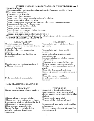 SYSTEM NAGRÓD I KAR OBOWIĄZUJĄCY W ZESPOLE SZKÓŁ nr 5 UWAGI OGÓLNE: 1.Wychowawca klasy na bieżąco kontroluje zachowanie i frekwencję uczniów w klasie. 2.Obowiązuje gradacja kar: - Wpisanie uwagi do dziennika - Rozmowa z wychowawcą klasy - Rozmowa z wychowawcą w obecności pedagoga/psychologa - Pisemne upomnienie wychowawcy klasy - Rozmowa z uczniem w obecności jego rodzica, wychowawcy, pedagoga szkolnego - Zorganizowanie Zespołu Wychowawczego - Pisemne upomnienie dyrektora szkoły - Pisemna nagana dyrektora szkoły - Przeniesienie do równoległego oddziału klasowego - Przeniesienie do innej szkoły - Usunięcie ucznia pełnoletniego z listy uczniów ZS nr 5 3.Wychowawca informuje rodzica ( opiekuna) o udzielonej nagrodzie i wymierzonej karze. NAGRODY DLA ZESPOŁU KLASOWEGO RODZAJ NAGRODY Comiesięczne podanie do publicznej wiadomości wyników współzawodnictwa klas w zakresie frekwencji Pochwała wychowawcy na zebraniu z rodzicami Pochwała udzielona przez Dyrektora na forum szkoły Nagrody rzeczowe i podanie tego faktu do publicznej wiadomości Puchar przechodni Dyrektora Szkoły OSIĄGNIĘCIA -Wysoka frekwencja w miesiącu w danym typie szkoły -Wysoka frekwencja i dobre wyniki w nauczaniu -Aktywność społeczna znacznej części zespołu klasowego -Przygotowanie imprezy szkolnej przez cały zespół klasowy -Osiągnięcia sportowe zespołu klasowego -Najlepiej przygotowana impreza szkolna -Najwięcej wypożyczonych i przeczytanych książek -Najbardziej aktywna społecznie klasa -Klasa o najwyższej frekwencji semestralnej i rocznej -Najbardziej usportowiona klasa -Za najlepsze wyniki w nauczaniu i frekwencji KARY DLA ZESPOŁU KLASOWEGO RODZAJ KARY Nagana wychowawcy na zebraniu rodziców Odmowa udziału w imprezie szkolnej Odmowa zezwolenia wyjazdu na wycieczki Praca na rzecz szkoły po zajęciach lekcyjnych Odpracowanie w różnych formach Zakup zniszczonych przedmiotów Nagana Dyrektora z powiadomieniem rodziców i podaniem do publicznej wiadomości PRZEWINIENIE -Opieszałość w działalności społecznej (odmowa udziału w pracy na rzecz szkoły, odmowa przygotowania imprezy klasowej lub szkolnej) -Ucieczka z pojedynczej lekcji -Ucieczka z kilku pojedynczych lekcji -Dewastacja sali lekcyjnej w czasie zajęć lub podczas przerwy -Ucieczka z całego dnia zajęć lekcyjnych lub zajęć praktycznych 1 NAGRODY DLA UCZNIA RODZAJ NAGRODY Pochwała wychowawcy na forum klasy i na spotkaniu z rodzicami Wpis na stronie internetowej Pochwała Dyrektora na forum szkoły z podaniem do publicznej wiadomości List gratulacyjny do rodziców Nagroda rzeczowa z podaniem do wiadomości uczniów i nauczycieli Stypendium ufundowane przez Radę Rodziców OSIĄGNIĘCIA -Wysoka frekwencja -Dobre wyniki w nauce -Aktywny udział w pracach na rzecz szkoły -Praca w samorządzie klasowym -Udział w zawodach sportowych -Udział w konkursach i olimpiadach na poziomie szkolnym -Zdobycie wysokich miejsc w zawodach sportowych na terenie szkoły -Udział w konkursach na poziomie szkoły -Aktywny udział w imprezach szkolnych -Aktywny udział w pracach Samorządu Szkolnego -Praca w organizacjach pozaszkolnych -Wysoka frekwencja -Zdobycie pierwszych miejsc w zawodach sportowych, konkursach -Wyróżnienie w działalności społecznej w szkole -Wyróżnienie w działalności pozaszkolnej -Najwyższa frekwencja w semestrze -Najlepsze wyniki w nauce w danej klasie (średnia ocen 4,0, zachowanie co najmniej dobre) -Bardzo wysoka frekwencja w danej klasie -Najlepszy kolega/koleżanka -Laureaci olimpiad na szczeblu miejskim i wojewódzkim -Laureaci konkursów na szczeblu miejskim i wojewódzkim -Zwycięzcy zawodów sportowych na szczeblu miejskim i wojewódzkim -Najwyższa frekwencja w szkole -Najlepszy czytelnik w szkole -Najbardziej wszechstronny uczeń -Najlepszy sportowiec 2 KARY DLA UCZNIA RODZAJ KARY Pisemne upomnienie wychowawcy PRZEWINIENIE -Niekulturalne zachowanie względem pracowników szkoły, kolegów -Pojedyncze spóźnienia -Używanie wulgaryzmów - opuszczenie bez usprawiedliwienia nie więcej niż 40 godzin Wychowawcy opracowują system usprawiedliwiania nieobecności i wypracowują metodę kontaktu rodzicwychowawca (szkolny program zapobiegania wagarom) Wezwanie rodziców do wychowawcy klasy i -Opuszczanie zajęć bez usprawiedliwienia powyżej 40 godzin pedagoga szkolnego (rozmowa - Notoryczne utrudnianie prowadzenia zajęć przeprowadzona w obecności ucznia) lekcyjnych Zgłoszenie przez wychowawcę klasy ucznia, - Brak poprawy zachowania po otrzymaniu sprawiającego kłopoty wychowawcze przez ucznia pisemnego upomnienia pedagogowi lub psychologowi szkolnemu. wychowawcy Rozmowa ucznia i jego rodziców z pedagogiem lub psychologiem szkolnym. W czasie rozmowy pedagog omawia prawne skutki niespełnienia przez ucznia obowiązku szkolnego i obowiązku nauki. - omawianie sytuacji rażącego naruszania regulaminu (notoryczne wagary, utrudnianie prowadzenia zajęć itp.) Zorganizowanie Zespołu Wychowawczego 3 Pisemne upomnienie dyrektora szkoły -Palenie papierosów na terenie szkolnym -Używanie wulgaryzmów w rozmowach z pracownikami szkoły i kolegami -Opuszczanie zajęć bez usprawiedliwienia Powyżej 80 godzin Nagana dyrektora szkoły z powiadomieniem rodziców i podaniem do publicznej wiadomości (o czasie trwania kary decyduje dyrektor) Skutkiem nagany może być okresowe pozbawienie ucznia prawa do: - udziału w imprezach rozrywkowych i wycieczkach - reprezentowania klasy lub szkoły w rozgrywkach sportowych - udziału w zajęciach pozalekcyjnych -Opuszczanie zajęć bez usprawiedliwienia powyżej 130 godzin - Udział w bójce -Czynna napaść i znęcanie się nad kolegą, - Przebywanie na terenie szkoły w stanie wskazującym na spożycie alkoholu, -Zażywanie narkotyków i środków odurzających, - Palenie papierosów na terenie szkoły (drugi raz) -Dewastacja mienia szkolnego, -Kradzież. Przeniesienie do innej szkoły ucznia niepełnoletniego lub skreślenie z listy uczniów ucz