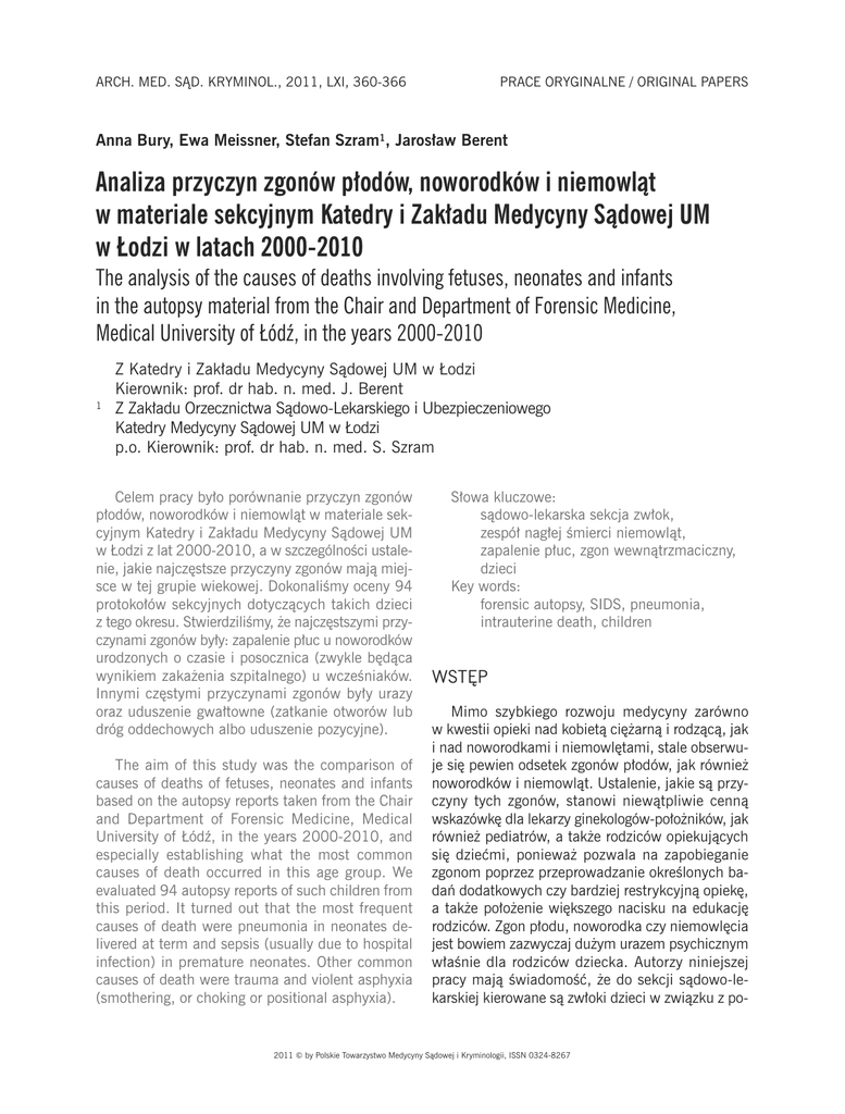 ARCH. MED. SĄD. KRYMINOL., 2011, LXI, 360-366 PRACE ORYGINALNE / ORIGINAL PAPERS Anna Bury, Ewa Meissner, Stefan Szram1, Jarosław Berent Analiza przyczyn zgonów płodów, noworodków i niemowląt w materiale sekcyjnym Katedry i Zakładu Medycyny Sądowej UM w Łodzi w latach 2000-2010 The analysis of the causes of deaths involving fetuses, neonates and infants in the autopsy material from the Chair and Department of Forensic Medicine, Medical University of Łódź, in the years 2000-2010 1 Z Katedry i Zakładu Medycyny Sądowej UM w Łodzi Kierownik: prof. dr hab. n. med. J. Berent Z Zakładu Orzecznictwa Sądowo-Lekarskiego i Ubezpieczeniowego Katedry Medycyny Sądowej UM w Łodzi p.o. Kierownik: prof. dr hab. n. med. S. Szram Celem pracy było porównanie przyczyn zgonów płodów, noworodków i niemowląt w materiale sekcyjnym Katedry i Zakładu Medycyny Sądowej UM w Łodzi z lat 2000-2010, a w szczególności ustalenie, jakie najczęstsze przyczyny zgonów mają miejsce w tej grupie wiekowej. Dokonaliśmy oceny 94 protokołów sekcyjnych dotyczących takich dzieci z tego okresu. Stwierdziliśmy, że najczęstszymi przyczynami zgonów były: zapalenie płuc u noworodków urodzonych o czasie i posocznica (zwykle będąca wynikiem zakażenia szpitalnego) u wcześniaków. Innymi częstymi przyczynami zgonów były urazy oraz uduszenie gwałtowne (zatkanie otworów lub dróg oddechowych albo uduszenie pozycyjne). The aim of this study was the comparison of causes of deaths of fetuses, neonates and infants based on the autopsy reports taken from the Chair and Department of Forensic Medicine, Medical University of Łódź, in the years 2000-2010, and especially establishing what the most common causes of death occurred in this age group. We evaluated 94 autopsy reports of such children from this period. It turned out that the most frequent causes of death were pneumonia in neonates delivered at term and sepsis (usually due to hospital infection) in premature neonates. Other common causes of death were trauma and violent asphyxia (smothering, or choking or positional asphyxia). Słowa kluczowe: sądowo-lekarska sekcja zwłok, zespół nagłej śmierci niemowląt, zapalenie płuc, zgon wewnątrzmaciczny, dzieci Key words: forensic autopsy, SIDS, pneumonia, intrauterine death, children WSTĘP Mimo szybkiego rozwoju medycyny zarówno w kwestii opieki nad kobietą ciężarną i rodzącą, jak i nad noworodkami i niemowlętami, stale obserwuje się pewien odsetek zgonów płodów, jak również noworodków i niemowląt. Ustalenie, jakie są przyczyny tych zgonów, stanowi niewątpliwie cenną wskazówkę dla lekarzy ginekologów-położników, jak również pediatrów, a także rodziców opiekujących się dziećmi, ponieważ pozwala na zapobieganie zgonom poprzez przeprowadzanie określonych badań dodatkowych czy bardziej restrykcyjną opiekę, a także położenie większego nacisku na edukację rodziców. Zgon płodu, noworodka czy niemowlęcia jest bowiem zazwyczaj dużym urazem psychicznym właśnie dla rodziców dziecka. Autorzy niniejszej pracy mają świadomość, że do sekcji sądowo-lekarskiej kierowane są zwłoki dzieci w związku z po- 2011 © by Polskie Towarzystwo Medycyny Sądowej i Kryminologii, ISSN 0324-8267 Nr 4 ANALIZA PRZYCZYN ZGONÓW PŁODÓW, NOWORODKÓW I NIEMOWLĄT W MATERIALE SEKCYJNYM KATEDRY I ZAKŁADU MEDYCYNY SĄDOWEJ UM W ŁODZI W LATACH 2000-2010 dejrzeniem udziału osób trzecich w mechanizmie ich zgonu. Dlatego też wyniki niniejszej pracy z pewnością nie odzwierciedlają rzeczywistej przyczynowości zgonów dzieci we wskazanym przedziale wiekowym. W części przypadków zgonów małych dzieci sekcja zwłok nie jest wykonywana z uwagi na brak podejrzenia przestępstwa lub też przyczyna zgonu jest relatywnie prosta do ustalenia na podstawie wyników badań wykonanych za życia albo też jasnego obrazu chorobowego. MATERIAŁ I METODY Materiał do badań stanowiły protokoły sekcyjne z lat 2000-2010. Badaniem objęto ogółem 94 protokoły, dotyczące ustalonego przedziału wiekowego, wyodrębnione ze wszystkich protokołów sekcyjnych z Katedry i Zakładu Medycyny Sądowej UM w Łodzi z wymienionego okresu. WYNIKI Jak to przedstawia tabela nr I, średnio rocznie wykonywano 8-9 sekcji dzieci <1 rż., najwięcej w latach 2008-2009 oraz w latach 2002-2004. Nie wykazano sezonowości zgonów co do pór roku. Analizując z kolei miejsca zgonów, należy stwierdzić, że w przypadku dzieci urodzonych o czasie zdarzenia prowadzące do ich zgonu miały najczęściej miejsce w domu lub poza nim (49), ale poza szpitalem, a zgony również najczęściej zdarzały się w domu lub poza nim (40) – niektóre dzieci w celu ratowania życia były przewożone do szpitali. Z kolei w przypadku wcześniaków zdarzenia prowadzące do zgonu nieco częściej występowały poza szpitalem (15) niż w szpitalu (12), a zgony miały miejsce albo w szpitalu (14) albo poza nim (13). Jak to przedstawiono w tabelach II, III i IV, większość (ok. 60%) zgonów stanowiły dzieci urodzone o czasie (59), a urodzone przedwcześnie ok. 25% (26). Badano 8 poronionych płodów. W jednym przypadku, z uwagi na znaczne gnicie, nie udało się ustalić wieku ani płci dziecka, jak również brak było danych na temat czasu po urodzeniu. Martwych urodzeń było nieznacznie więcej w grupie wcześniaków (8) niż dzieci donoszonych (6), przy czym wśród wcześniaków martwe urodzenia stanowiły ok. 30%, a wśród noworodków donoszonych ok. 10%. Ogółem sekcjonowano nieznacznie więcej 361 (47) dzieci płci męskiej niż żeńskiej (43), w czterech przypadkach płci nie ustalono podczas sekcji zwłok (dwa płody w mało zaawansowanej ciąży, przypadek znacznego gnicia i przypadek rozkawałkowania zwłok przez zwierzę). Wśród porodów żywych dzieci przeważała płeć męska, natomiast wśród porodów martwych – żeńska. W jednym przypadku nie udało się ustalić (gnicie) czy dziecko uro
