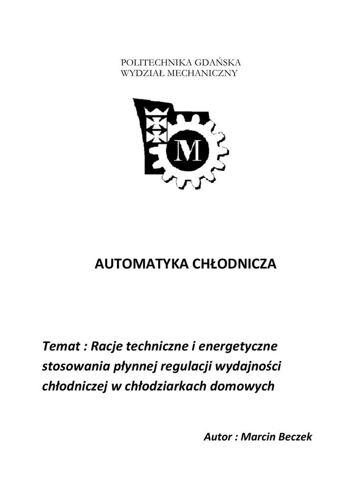 POLITECHNIKA GDAŃSKA WYDZIAŁ MECHANICZNY AUTOMATYKA CHŁODNICZA Temat : Racje techniczne i energetyczne stosowania płynnej regulacji wydajności chłodniczej w chłodziarkach domowych Autor : Marcin Beczek Zawartość : Wstęp ( urządzenie chłodnicze ? ) Współpraca sprężarki z parownikiem Podział sposobów regulacji Wpływ zmniejszenia wydajności na moc efektywną sprężarki Podsumowanie Wstęp : Urządzenia chłodniczego charakteryzuje się zmiennością parametrów pracy zadaniem urządzenia jest odprowadzenie ciepła od danego obiektu chłodniczego w określonym czasie lub w sposób ciągły i przekazywanie tego ciepła przez skraplacz do otocznia. Aby spełnid swoje zadanie urządzenie chłodnicze musi posiadad odpowiednią wydajnośd chłodniczą dobraną do konkretnych potrzeb. Wydajność chłodniczą - wydajność sprężarki, obsługującej dany obiekt chłodniczy, przy ściśle określonych temperaturach parowania i skraplania. Obciążenie cieplne w większości urządzeń podlega znacznym wahaniom, a między innymi: Różnicą temperatur otoczenia pomiędzy dniem a nocą, Różnicą temperatur podczas ich eksploatacji w porze zimowej i letniej, ma znaczne różnice w stratach przenikania ciepła przez przegrody budowlane, co związane jest ze zmianami obciążenia cieplnego, Różnicą w zapełnianiu komór chłodniczych towarami oraz ich temperaturą podczas załadunku, Różnicą wykorzystania pomieszczeń w okresie tygodnia roboczego oraz w dni świąteczne. WSPÓŁPRACA SPRĘŻARKI Z PAROWNIKIEM : W punktach przecięcia charakterystyk pokazanych na , zachodzi równowaga między wydajnością sprężarki, skraplacza i parownika. Są to punkty pracy urządzenia chłodniczego podczas jego działania w okresie letnim i zimowym. Z ich położenia wynika, że zapotrzebowanie na wydajność chłodniczą wynoszące w lecie Q0 spadnie w zimie do Q0’. Obniży się przy tym temperatura w komorze, od tR do t’R. Podział ze względu na płynność regulacji: -regulacja ciągła -regulacja skokowa Nie wszystkie sposoby regulacji nadają się do wszystkich typów sprężarek Regulacja skokowa : Okresowe wyłączenie sprężarki z ruchu, Wyłączenie poszczególnych cylindrów sprężarki Stosowanie silników wielobiegowych Stosowanie automatycznych zaworów upustowych Okresowe połączenie cylindra sprężarki z dodatkową przestrzenią szkodliwą Ciągła regulacja : Płynna zamiana prędkości obrotowej silnika sprężarki Dławienie zasysanej pary czynnika w specjalnym zaworze Upust czynnika ze strony tłocznej na stronę ssawną Zmiana objętości przestrzeni szkodliwej Automatyczne otwieranie zaworów ssawnych w czasie części suwu sprężania Zmiana prędkości obrotowej sprężarki teoretycznie najbardziej korzystny sposób regulacji wydajności możliwa przy zastosowaniu silników prądu stałego lub specjalnych układów elektronicznych w silnikach prądu zmiennego umożliwiała regulację wydajności sprężarki tylko do 40% wartości nominalnej. Automatyka : W przewodzie ssawnym należy umiesić przekaźnik ciśnieniowy , którego impulsy służą do regulacji prędkości obrotowej silnika napędzającego W systemie tym zmniejszeniu wydajności chłodniczej , przy stałej temperaturze środowiska chłodniczego , towarzyszy wzrost temperatury parowania czynnika . Zmiana objętości przestrzeni szkodliwej Objętość przestrzeni szkodliwej ma wpływ na stopień dostarczania sprężarki.(zwiększając objętość tej przestrzeni można wpływać na wydajność chłodniczą bez zmian temperatury środowiska chłodniczego) Automatyka : Polega na zastosowaniu czujnika , który pod działaniem np. ciśnienia parowania , wpływa na położenie pomocniczego tłoka regulującego objętość dodatkowej przestrzeni szkodliwej Pomocniczy tłok , przesuwa się automatycznie , zmniejszając objętość dodatkowej przestrzeni szkodliwej ,dzięki czemu istnieje możliwość zmiany wydajności sprężarki od znamionowej do zera . Regulacja przez upust czynnika ze strony tłocznej na ssawną Przy pracy w wydajnością nominalną cewka elektromagnetyczna nie jest zasilana prądem. Sprężona para czynnika chłodniczego przepływa przez zawór regulacyjny do komory tłocznej. Podczas pracy przy częściowym obciążeniu cewka elektromagnetyczna zostaje pobudzona i dzięki czemu czynnik przepływa przez zawór główny z powrotem na stronę ssawną. Przepływ taki jest ekonomiczny, gdyż płyn roboczy z odciążanego cylindra kierowany jest na stronę ssawną bez sprężania. Silnik w cylindrze wykona tylko pracę biegu jałowego pokonując siły tarcia i bezwładności. Stosowana jest najczęściej w agregatach chłodniczych instalowanych między innymi w kontenerach Gdy obciążenie parownika obniży się , spada w nim jednocześnie ciśnienie , stanowiące sygnał do otwierania się zaworu . Część przegrzanych par czynnika z kolektora tłocznego jest dławiona do ciśnienia ssania i mieszana z zimnymi. Regulacja wydajności chłodniczej w chłodziarkach domowych Zatrzymanie i uruchomienie sprężarki Urządzenie sterujące składa się wyłącznika niskiego ciśnienia (presostatu) połączonego z przewodem ssawnym sprężarki lub termostatu, którego czujkę umieszcza się w pomieszczeniu chłodniczym. Termostat : Niepożądanemu podnoszeniu się temperatury w lodówce zapobiega zainstalowany w niej termostat, który włącza agregat, gdy temperatura podnosi się i wyłącza go, gdy za bardzo spada. Tym samym powoduje, że lodówka nie pracuje na okrągło, przez co zmniejsza się zużycie energii elektrycznej. Zasada działania termostatu Po przekroczeniu przez temperaturę T1 progu temperatury zadanej Tz następuje załączenie przekaźnika. Po obniżeniu temperatury T1 do wartości Tz – Th następuje wyłączenie przekaźnika aż do ponownego wzrostu temperatury powyżej Tz gdzie następuje ponowne załączenie przekaźnika. Podsumowanie : Gdyby urządzenia chłodnicze 