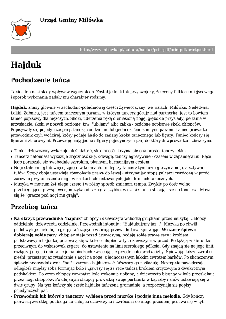 Urząd Gminy Milówka http://www.milowka.pl/kultura/hajduk/printpdf/printpdf/printpdf.html Hajduk Pochodzenie tańca Taniec ten nosi ślady wpływów węgierskich. Został jednak tak przyswojony, że cechy folkloru miejscowego i sposób wykonania nadały mu charakter rodzimy. Hajduk, znany głównie w zachodnio-południowej części Żywiecczyzny, we wsiach: Milówka, Nieledwia, Laliki, Żabnica, jest tańcem tańczonym parami, w którym tancerz góruje nad partnerką. Jest to bowiem taniec popisowy dla mężczyzn. Skoki, uderzenia ręką o uniesioną nogę, głębokie przysiady, pełzanie w przysiadzie, skoki w pozycji poziomej tzw. "ubijany" albo żabka - ozdobne popisowe skoki chłopców. Popisywały się pojedyncze pary, tańcząc oddzielnie lub jednocześnie z innymi parami. Taniec prowadzi przewodnik czyli wodzirej, który podaje hasło do zmiany kroku tanecznego lub figury. Taniec kończy się figurami zbiorowymi. Przewagę mają jednak figury pojedynczych par, do których wprowadza dziewczyna. ● ● ● ● Taniec dziewczyny wykazuje nieśmiałość, skromność - trzyma się ona prosto. tańczy lekko. Tancerz natomiast wykazuje zręczność siłę, odwagę, tańczy agresywnie - czasem w zapamiętaniu. Ręce jego poruszają się swobodnie szerokim, płynnym, harmonijnym gestem. Nogi stale mniej lub więcej zgięte w kolanach. Im lepszy tancerz tym luźniej trzyma nogi, a sztywno tułów. Stopy oboje ustawiają równolegle prawą do lewej - utrzymując stopę palcami zwróconą w przód, zarówno przy unoszeniu nogi, w krokach akcentowanych, jak i krokach tanecznych. Muzyka w metrum 2/4 ulega często i w różny sposób zmianom tempa. Zwykle po dość wolno przebiegającej przyśpiewce, muzyka od razu gra szybko, w czasie tańca stosując się do tancerza. Mówi się że "gracze pod nogi mu grają". Przebieg tańca ● ● Na okrzyk przewodnika "hajduk" chłopcy i dziewczęta wchodzą grupkami przed muzykę. Chłopcy oddzielnie, dziewczęta oddzielnie. Przewodnik intonuje : "Hajdukujemy jaz ..". Muzyka po chwili podchwytuje melodię, a grupy tańczących wtórują przewodnikowi śpiewając. W czasie śpiewu dobierają sobie pary: chłopiec staje przed dziewczyną, podają sobie prawe ręce i krokiem podstawowym hajduka, posuwają się w kole - chłopiec w tył, dziewczyna w przód. Podążają w kierunku przeciwnym do wskazówek zegara, do ustawienia na linii szerokiego półkola. Gdy znajdą się na jego linii, rozłączają ręce i opierając je na biodrach zwracają się przodem do środka izby. Śpiewają dalsze zwrotki pieśni, przestępując rytmicznie z nogi na nogę, z jednoczesnym lekkim zwrotem barków. Po skończonym śpiewie przewodnik woła "hej" i zaczyna hajdukować. Wszyscy go naśladują. Następnie powiększają odległość między sobą formując koło i ująwszy się za ręce tańczą krokiem krzyżowym z dwukrotnym podskokiem. Po czym chłopcy wewnątrz koła wykonują ubijany, a dziewczęta biegnąc w koło przeskakują przez nogi chłopców. Po ubijanym chłopcy prowadzą swoje partnerki w kąt izby i znów ustawiają się w dwie grupy. Na tym kończy się część hajduka tańczona gromadnie, a rozpoczynają się popisy pojedynczych par. Przewodnik lub któryś z tancerzy, wybiega przed muzykę i podaje inną melodię. Gdy kończy pierwszą zwrotkę, podbiega do chłopca dziewczyna i zwrócona do niego przodem, posuwa się w tył. ● ● Tancerz podąża po wyznaczonej przez nią linii jednym z kroków popisowych. Po skończonym tańcu partner i partnerka ustawiają się między grupą chłopców, a grupą dziewcząt, środek izby zostawiając dla innych par. Popisy pojedynczych par trwają dość długo. Czasem tancerz zmienia melodię, czasem tańczy przy tej samej co przewodnik, każdy z nich stara się jednak zatańczyć inaczej. Przeplatają kroki taneczne po dwa i więcej. Tancerki zaś prowadzą partnerów po różnych liniach: po kole, spirali, zygzakiem lub po prostej. Gdy kończą się popisy, znów na "hej" przewodnika tańczący ujmują się w parach i ustawiają się po dwu stronach izby w podwójne szeregi. Tancerz i tancerka stoją naprzeciw siebie w jednym i drugim szeregu. Podstawowym krokiem krzyżowanym dwuszeregi zmieniają miejsca, po czym wracają na popprzednie miejsca. Po powrocie na swoje miejsca pary stosują ujęcie zamknięte i krokiem góralskim wirują w izbie. Posuwają się w kierunku przeciwnym do wskazówek zegara. Są dowolnie rozrzuceni po izbie. Jedne pary krążą szybciej, inne spokojniej. Włączają się w ten finał tańca i te pary, które nie brały udziału w hajduku. To krążenie par trwa w czasie dwa lub trzy razy powtórzonej 12-taktowej melodii.