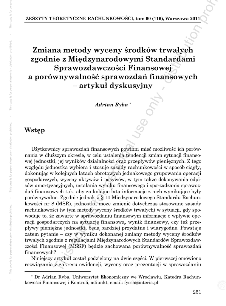 This copy is for person ibu tio np roh on ly - dis tr Zmiana metody wyceny środków trwałych zgodnie z Międzynarodowymi Standardami Sprawozdawczości Finansowej a porównywalność sprawozdań finansowych – artykuł dyskusyjny Adrian Ryba * - se lu Wstęp is c op y is for pe rso na Użytkownicy sprawozdań finansowych powinni mieć możliwość ich porównania w dłuższym okresie, w celu ustalenia tendencji zmian sytuacji finansowej jednostki, jej wyników działalności oraz przepływów pieniężnych. Z tego względu jednostka wybiera i stosuje zasady rachunkowości w sposób ciągły, dokonując w kolejnych latach obrotowych jednakowego grupowania operacji gospodarczych, wyceny aktywów i pasywów, w tym także dokonywania odpisów amortyzacyjnych, ustalania wyniku finansowego i sporządzania sprawozdań finansowych tak, aby za kolejne lata informacje z nich wynikające były porównywalne. Zgodnie jednak z § 14 Międzynarodowego Standardu Rachunkowości nr 8 (MSR), jednostka może zmienić dotychczas stosowane zasady rachunkowości (w tym metody wyceny środków trwałych) w sytuacji, gdy spowoduje to, że zawarte w sprawozdaniu finansowym informacje o wpływie operacji gospodarczych na sytuację finansową, wynik finansowy, czy też przepływy pieniężne jednostki, będą bardziej przydatne i wiarygodne. Powstaje zatem pytanie – czy w wyniku dokonanej zmiany metody wyceny środków trwałych zgodnie z regulacjami Międzynarodowych Standardów Sprawozdawczości Finansowej (MSSF) będzie zachowana porównywalność sprawozdań finansowych? Niniejszy artykuł został podzielony na dwie części. W pierwszej omówiono rozwiązania z zakresu ewidencji, wyceny oraz prezentacji w sprawozdaniu Th This copy is for personal use only - distribution prohibited. - This copy is for personal use only - distribution prohibited. - This copy is for personal use only - distribution prohibited. - ZESZYTY TEORETYCZNE RACHUNKOWOŚCI, tom 60 (116), Warszawa 2011 * Dr Adrian Ryba, Uniwersytet Ekonomiczny we Wrocławiu, Katedra Rachunkowości Finansowej i Kontroli, adiunkt, email: [email protected] 251 ibu tio np roh dis tr on ly - 1. Ewidencja, wycena i prezentacja w sprawozdaniu finansowym środków trwałych zgodnie z MSR nr 16 1.1. Początkowe ujęcie w księgach rachunkowych is c op y is for pe rso na lu se Według § 15 MSR nr 16 składnik rzeczowych aktywów trwałych, który kwalifikuje się do ujęcia jako składnik aktywów, wycenia się początkowo na podstawie ceny nabycia lub kosztu wytworzenia, które są ekwiwalentem ceny zapłaconej środkami pieniężnymi na dzień ujęcia. Na cenę nabycia lub koszt wytworzenia pozycji rzeczowych aktywów trwałych składają się m.in. (por. § 16 oraz 17 MSR nr 16): a) cena zakupu, łącznie z cłami importowymi i niepodlegającymi odliczeniu podatkami od zakupu, pomniejszona o opusty handlowe i rabaty; b) wszystkie inne pozwalające się bezpośrednio przyporządkować koszty poniesione w celu dostosowania składnika aktywów do miejsca i stanu, w którym może on funkcjonować w sposób zgodny z zamierzeniami kierownictwa; c) szacunkowe koszty demontażu i usunięcia składnika aktywów oraz koszty przeprowadzenia renowacji miejsca, w którym się znajdował, do których jednostka jest zobowiązana w związku z nabyciem pozycji rzeczowych aktywów trwałych lub używaniem składnika rzeczowych aktywów trwałych w danym okresie w celu innym niż wytwarzanie wyrobów. Kapitalizowanie kosztów nabycia bądź wytworzenia kończy się w momencie dostosowania składnika aktywów do miejsca i warunków potrzebnych do rozpoczęcia jego funkcjonowania zgodnie z zamierzeniami kierownictwa (por. § 20 oraz 21 MSR nr 16). 1.2. Wycena środków trwałych na dzień bilansowy Według § 29 MSR nr 16 dla środków trwałych jednostka dokonuje wyboru zasady rachunkowości dotyczącej sposobu wyceny opartego na cenie nabycia lub koszcie wytworzenia, albo na wartości przeszacowanej. Wybraną zasadę stosuje się wobec całej grupy rzeczowych aktywów trwałych. Th This copy is for person This copy is for personal use only - distribution prohibited. This copy is for personal use only - distribution prohibited. This copy is for personal use only - distribution prohibited. - finansowym środków trwałych dopuszczone w MSR nr 16. Z kolei w drugiej części artykułu dokonano oceny porównywalności sprawozdań finansowych przekształconych (w wyniku zmiany metody wyceny środków trwałych) zgodnie z Międzynarodowym Standardem Rachunkowości nr 8 (MSR). 252 is c op y is Początkowe ujęcie w księgach rachunkowych Na dzień zakupu jednostka gospodarcza, zgodnie z § 58 MSR nr 16, ujmuje w księgach rachunkowych oddzielnie grunt oraz budynek (dla uproszczenia, w budynku nie zostały wydzielone istotne elementy) jako składniki środków trwałych. Księgowania przebiegają następująco: Środki trwałe Rachunek bieżący x 200000 (1 1) 200000 Th Sp) - This copy is for personal use only - distribution prohibited. ibu tio np roh dis tr on ly - se pe rso na lu Przykład 1 (opracowanie własne) Założenia 10 grudnia 2009 r. jednostka zakupiła (płatność przelewem) grunt wraz z budynkiem (zdatnym do użytkowania) za kwotę 200 000 zł (dla uproszczenia pominięto podatek VAT). Cena gruntu wyniosła 100 000 zł. Jednostka zamierza zakupiony budynek użytkować przez okres 25 lat. Wartość rezydualna budynku została ustalona na 25 000 zł. Budynek (jako budynek administracji) został jeszcze w grudniu przyjęty do eksploatacji, jednostka rozpocznie naliczanie amortyzacji metodą liniową począwszy od stycznia następnego roku. Na dzień bilansowy 2009 r. oraz 2010 r. nie nastąpiła utrata wartości żadnego z zakupionych składników. Jednostka wybrała model wyceny oparty na cenie nabycia. for This copy is for person This copy is for personal use only - distribution prohibited. - Po początkowym ujęciu, składnik środków trwałych jako składnik aktywów w