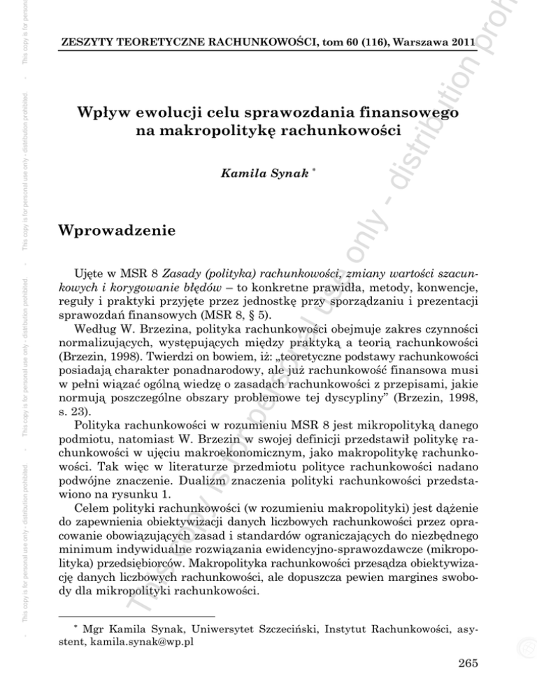 This copy is for person ibu tio np roh dis tr Wpływ ewolucji celu sprawozdania finansowego na makropolitykę rachunkowości on ly - Kamila Synak Wprowadzenie - is c op y is for pe rso na lu se Ujęte w MSR 8 Zasady (polityka) rachunkowości, zmiany wartości szacunkowych i korygowanie błędów – to konkretne prawidła, metody, konwencje, reguły i praktyki przyjęte przez jednostkę przy sporządzaniu i prezentacji sprawozdań finansowych (MSR 8, § 5). Według W. Brzezina, polityka rachunkowości obejmuje zakres czynności normalizujących, występujących między praktyką a teorią rachunkowości (Brzezin, 1998). Twierdzi on bowiem, iż: „teoretyczne podstawy rachunkowości posiadają charakter ponadnarodowy, ale już rachunkowość finansowa musi w pełni wiązać ogólną wiedzę o zasadach rachunkowości z przepisami, jakie normują poszczególne obszary problemowe tej dyscypliny” (Brzezin, 1998, s. 23). Polityka rachunkowości w rozumieniu MSR 8 jest mikropolityką danego podmiotu, natomiast W. Brzezin w swojej definicji przedstawił politykę rachunkowości w ujęciu makroekonomicznym, jako makropolitykę rachunkowości. Tak więc w literaturze przedmiotu polityce rachunkowości nadano podwójne znaczenie. Dualizm znaczenia polityki rachunkowości przedstawiono na rysunku 1. Celem polityki rachunkowości (w rozumieniu makropolityki) jest dążenie do zapewnienia obiektywizacji danych liczbowych rachunkowości przez opracowanie obowiązujących zasad i standardów ograniczających do niezbędnego minimum indywidualne rozwiązania ewidencyjno-sprawozdawcze (mikropolityka) przedsiębiorców. Makropolityka rachunkowości przesądza obiektywizację danych liczbowych rachunkowości, ale dopuszcza pewien margines swobody dla mikropolityki rachunkowości. Th This copy is for personal use only - distribution prohibited. - This copy is for personal use only - distribution prohibited. - This copy is for personal use only - distribution prohibited. - ZESZYTY TEORETYCZNE RACHUNKOWOŚCI, tom 60 (116), Warszawa 2011 Mgr Kamila Synak, Uniwersytet Szczeciński, Instytut Rachunkowości, asystent, [email protected] 265 dis tr Makropolityka rachunkowości Ustala pewien model rachunkowości w danym państwie lub tworzy wzorce do przymusowego lub dobrowolnego naśladownictwa poprzez: 1) ustawy, 2) standardy, 3) dyrektywy metodologiczne. on ly - This copy is for personal use only - distribution prohibited. Mikropolityka rachunkowości Kształtowanie sprawozdań finansowych zgodnie z celami ustalonymi przez właściciela podmiotu, ale w ramach obowiązujących przepisów i standardów rachunkowości. Źródło: W. Brzezin (1998, s. 26). se - is c op y is for pe rso na lu Mikropolityka jest realizowana jako część składowa polityki ekonomicznej przedsiębiorstwa. Każda jednostka prowadzi własną politykę rachunkowości. Stanowi ona instrument realizacji założonych celów jednostki gospodarczej. Wybór rodzaju tej polityki jest związany głównie ze specyfiką działalności jednostki, strukturą organizacyjną i formą prawną. Polityka rachunkowości prowadzona przez jednostki gospodarcze może się zmieniać w zależności od sytuacji ekonomiczno-finansowej i oczekiwań rozwojowych jednostki, ale musi być kształtowana przy uwzględnieniu ram prawnych wyznaczonych obowiązującymi przepisami. Do osiągnięcia celów polityki bilansowej1 wykorzystuje się jej różne formy i instrumenty (Sawicki, 2002). W niniejszym artykule ograniczono rozważania do ukazania zmiany makropolityki rachunkowości w obszarze prezentacji poszczególnych elementów sprawozdania finansowego pod wpływem ewolucji celu jego sporządzenia, który należy zawsze mieć na uwadze. Cel sprawozdania determinuje bowiem zakres ujawnianych informacji oraz formę i miejsce ich prezentacji. Artykuł podejmuje analizę zmian w zakresie prezentacji poszczególnych elementów sprawozdania finansowego w świetle MSR 1 pod wpływem ewolucji celu sporządzania sprawozdania finansowego. Aby ten cel osiągnąć, autorka: dokonała analizy MSR 1 z 1997 r. z jego treścią zaktualizowaną w 2007 r., określiła aktualny cel sporządzania sprawozdania finansowego, wskazała składniki, które – ujawnione w sprawozdaniu finansowym – umożliwiają realizację celu sprawozdania, Th This copy is for personal use only - distribution prohibited. This copy is for personal use only - distribution prohibited. - ibu tio np roh POLITYKA RACHUNKOWOŚCI - This copy is for person Rysunek 1. Podwójne znaczenie polityki rachunkowości 1 „Polityka rachunkowości” i „polityka bilansowa” są tematami wielu opracowań. Ich definicje i porównanie przedstawił m.in. K. Sawicki, (2002). 266 ibu tio np roh dis tr on ly - lu se Zmiana otoczenia i wynikające z niej potrzeby użytkowników informacji sprawozdawczych oddziałują silnie na zakres informacji przedstawianych w sprawozdaniu finansowym. Przejawia się to w modyfikacji celu sprawozdania finansowego. Cel sprawozdania finansowego określa MSR 1 Prezentacja sprawozdań finansowych, co przedstawia tabela 1. na Tabela 1. Cel sprawozdania finansowego w świetle MSR 1 Prezentacja sprawozdań finansowych MSR 1(zaktualizowany w 1997 r.) rso Cel sprawozdania finansowego op y is for pe Sprawozdanie finansowe stanowi uporządkowane przedstawienie sytuacji finansowej jednostki oraz przeprowadzonych przez nią transakcji. Celem sprawozdań finansowych o ogólnym przeznaczeniu jest dostarczanie szerokiemu kręgowi użytkowników podejmujących decyzje, użytecznych informacji na temat sytuacji finansowej, wyników działalności i przepływów środków pieniężnych jednostki. Ponadto sprawozdanie finansowe przedstawia wyniki zarządzania przez kierownictwo powierzonymi mu zasobami. MSR 1(zaktualizowany w 2007 r.) Sprawozdanie finansowe stanowi uporządkowane przedstawienie sytuacji finansowej i efektywności finansowej jednostki. Celem sprawozdania finansowego jest dostarczanie informacji na te