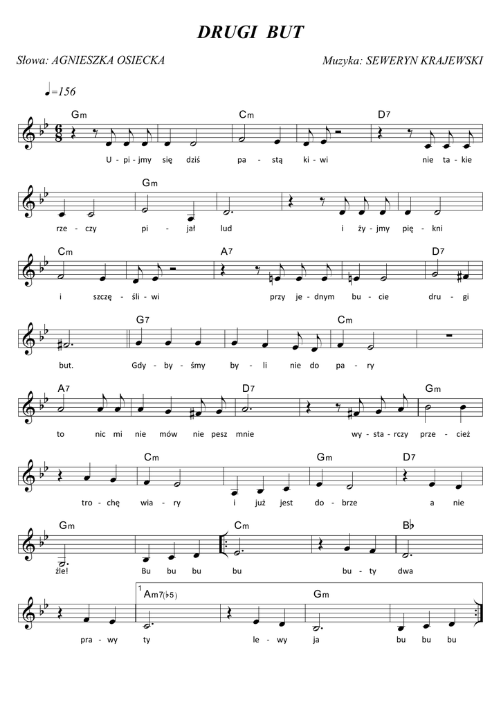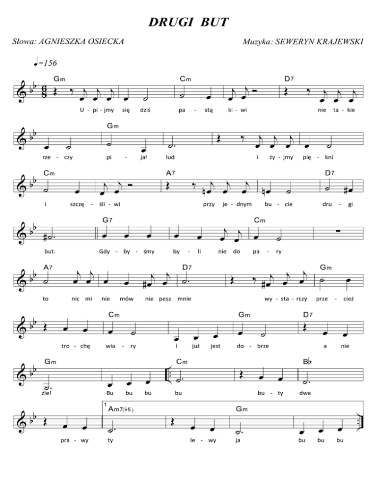 DRUGI BUT Słowa: AGNIESZKA OSIECKA Muzyka: SEWERYN KRAJEWSKI q =156 bb 6 GŒ m ‰ j j j & 8 œ œ œ œ U -‐ pi -‐ jmy & bb ˙ rze -‐ czy & bb Cm ˙ & pi G7 œ but. j j œ œ œ 7 b &b Œ nic mi œ œ stą mów Cm œ Œ ˙. ˙. źle! Bu 1 œ œ pra -‐ wy œ bu ( ) A m7 b 5 ˙. ty œ by Cm li nie do Œ bu œ już œ jest .. ˙. œ ˙ ˙ dru bu œ Œ œ le -‐ wy B œ a b ja cież œ nie ˙. dwa Gm ˙. gi œ prze -‐ D7 bu -‐ ty œ -‐ ry ˙ œ #œ ∑ ˙ do -‐ brze Œ Cm Œ D7 wy -‐ sta -‐ rczy Gm i -‐ ˙ Gm j j j ‰ #œ œ œ ˙ nie pesz mnie œ pa ta -‐ kie pię -‐ kni bu -‐ cie j j œ œ œ œ -‐ ży -‐ jmy je -‐ dnym D j œj ˙ . #œ œ j j j œ œ œ œ j j j nœ œ œ nœ ‰ ‰ j j j œ œ œ nie i przy wia -‐ ry œ ‰ lud Œ ˙ Œ D7 ki -‐ wi 7 Gm b &b Œ -‐ A7 œ œ nie œ tro -‐ chę & jał Gdy -‐ by -‐ śmy to bb -‐ pa j œj Ó œ œ szczę -‐ śli -‐ wi #˙. bb A˙ & œ j jÓ œ œ œ i bb dziś Gm œ ˙ ˙ się ˙ Cm œ bu œ bu œ bu .. & bb 2 A b ˙. ty Drugi but Œ œ le Gm -‐ œ wy ˙. ja. Fine